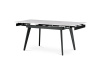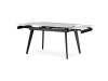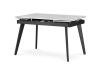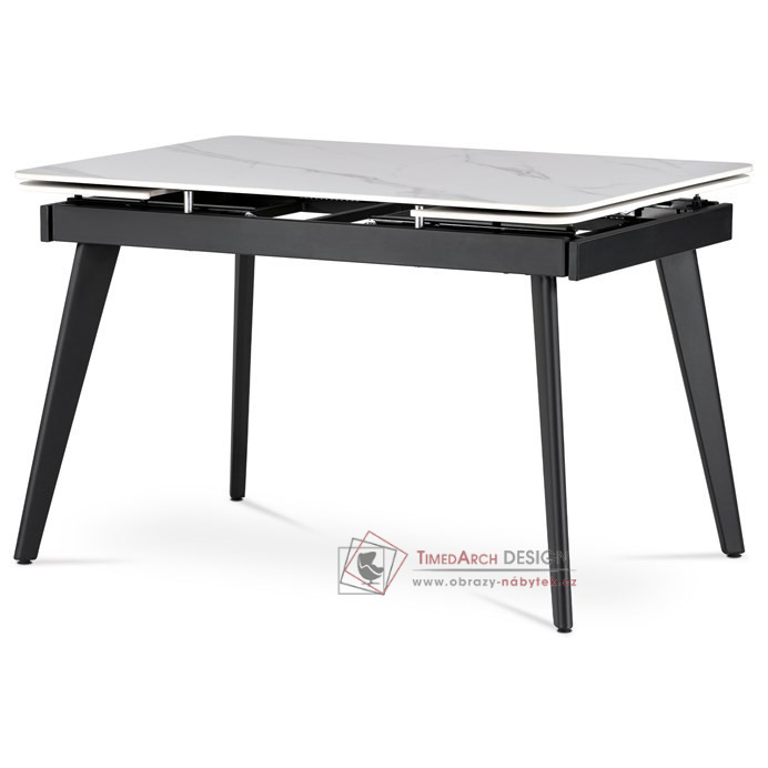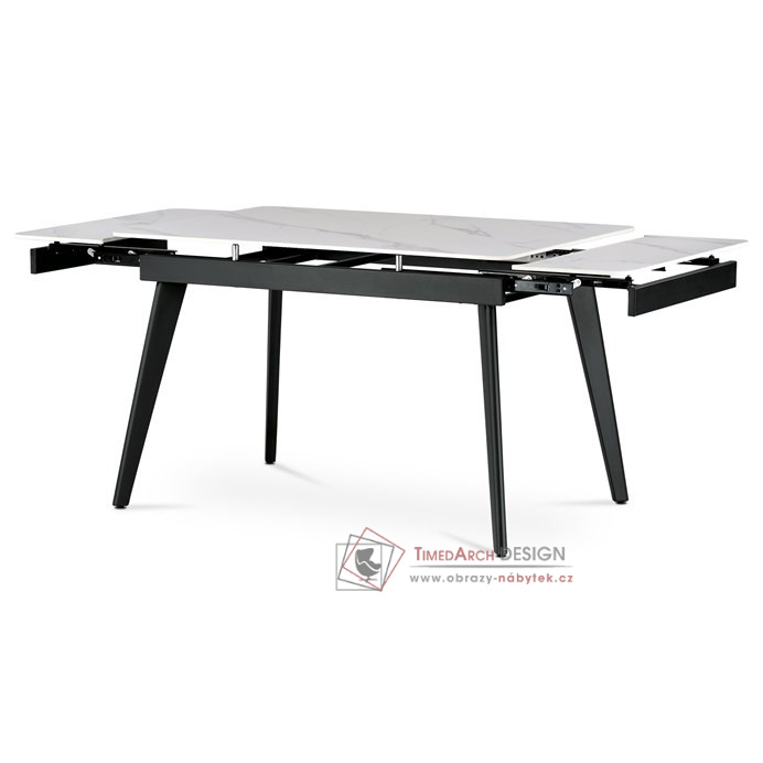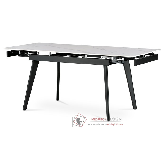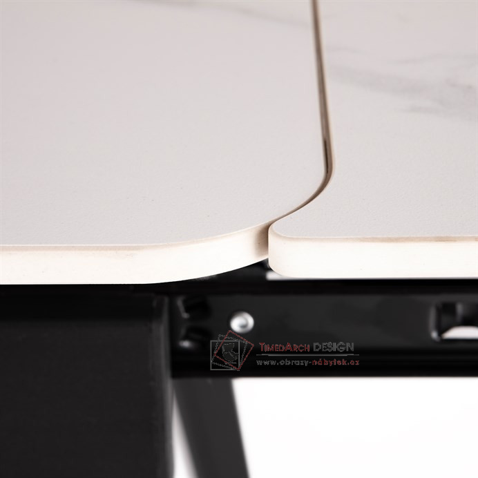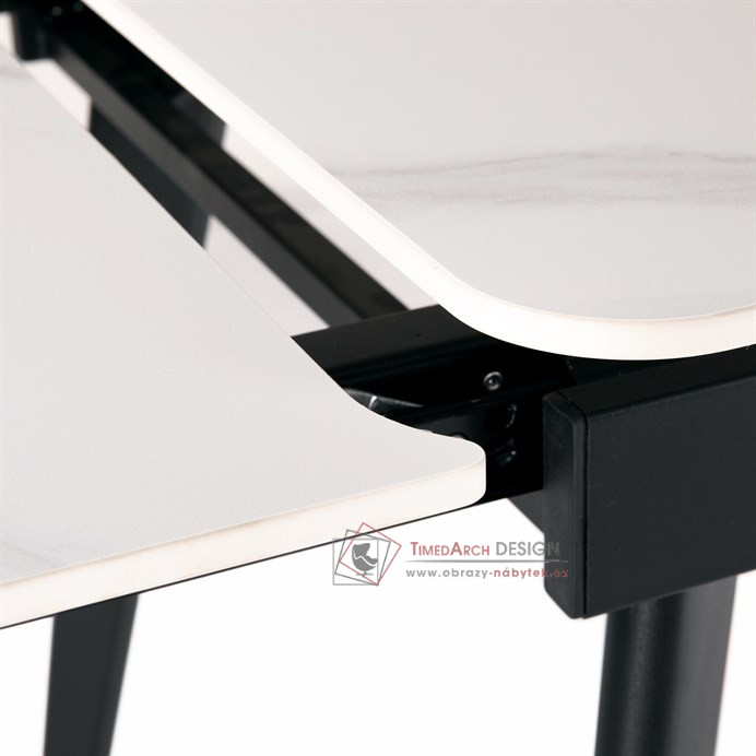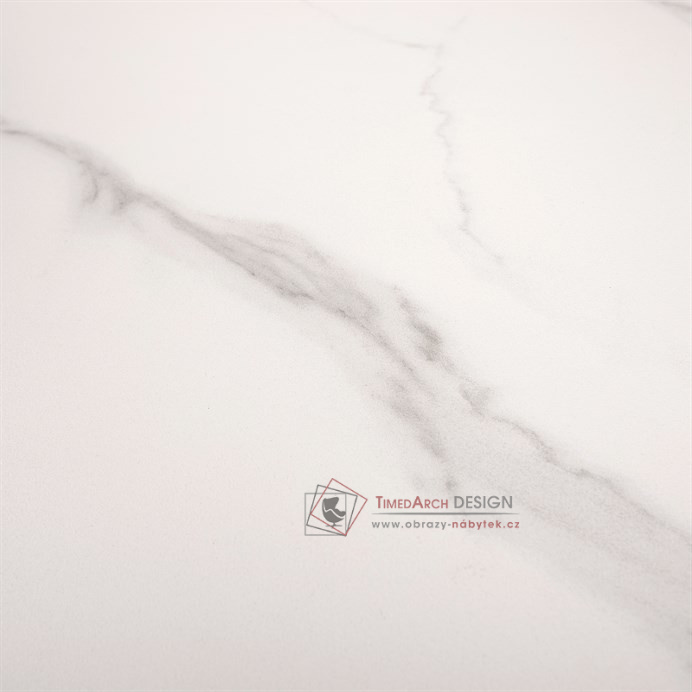 Vrchní stolová deska je tvrzené keramiky tl. 12 mm v matném dekoru "Italský sněhobílý mramor". Konstrukce stolu i nohy jsou celokovové s nástřikem práškového vypalovacího laku v matném černém odstínu. Plastové kluzáky na nohách eliminují možnost poškození povrchů tvrdých podlah. Rozkládání je výsuvné, díly o šíři 30 cm se vysouvají z obou kratších stran, mechanika je celokovová a pro usnadnění jak výsuvu, tak i zajištění, je opatřena pružinami a plynovými písty. Stůl zaujme jak svým minimalistickým designem i skvělým zpracováním detailu, ale také provedením desky se zakulacenými rohy a v neposlední řadě také dekorem vrchní desky, imitující jeden z nejkvalitnějších a nejžádanějších mramorů na světě. Jistě se stane se velmi elegantním a nepřehlédnutelným prvkem v moderních - industriálních, ale i klasicky laděných jídelnách, kuchyních a obývacích prostorách. Výška stolu je 76 cm. Ke stolu je možné umístit až 8 židlí. Bílý mramor (Carrarský mramor) je jedním z nejznámějších mramorů na světě, pochází z italského města Carrara v regionu Toskánska, kde se těží už od konce římské republiky. Jedná se o čistě bílý mramor s jemným šedým žilkováním. Použití je velmi široké, od sochařství (Michelangelo, Bernini, Donatello) až po stavebnictví současné i historické.