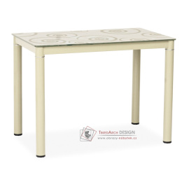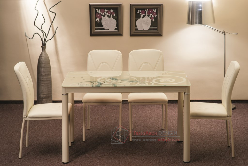 Jídelní stůl DAMAR na kovové podnoži krémové barvy, stolní deska z tvrzeného skla krémové barvy s dekorem.