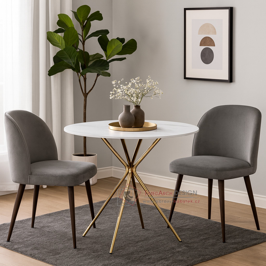 Jeho dominantním prvkem je kamenný plát ve vzoru bílý mramor, který působí luxusně a zároveň nadčasově. Doplněn je o stabilní kovovou konstrukci v provedení gold chrom zlatá , která mu dodává výrazný moderní charakter a zaručuje stabilitu a pevnost celé konstrukce. Vhodný je nejen do menších jídelen, ale také jako stylový prvek v kuchyňských či obývacích prostorách. MEKNER není jen praktickým kusem nábytku, ale také designovým doplňkem, který zvýrazní celkový charakter vašeho interiéru.