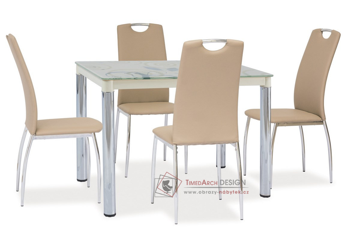 Jídelní stůl DAMAR II na kovové, pochromované podnoži, stolní deska z tvrzeného skla krémové barvy s dekorem.