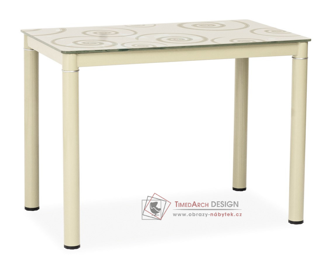 Jídelní stůl DAMAR na kovové podnoži v krémové barvě, stolní deska je z tvrzeného skla v krémové barvě s dekorem.