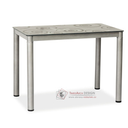 Jídelní stůl DAMAR na kovové podnoži v šedé barvě, stolní deska je z tvrzeného skla taktéž v šedé barvě s dekorem.
