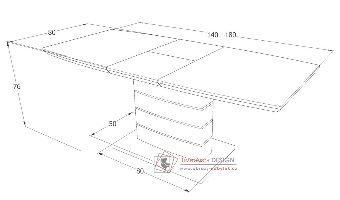 Rozměr stolní desky před rozložením je 80x140 cm, po rozložení 80x180 cm. Stůl je určen až pro 8 osob.