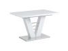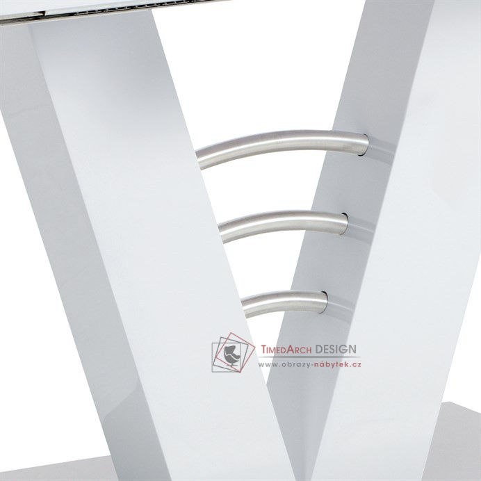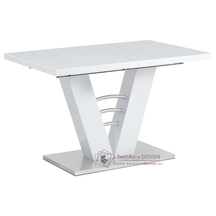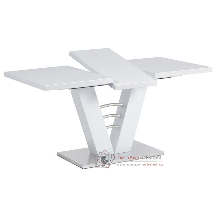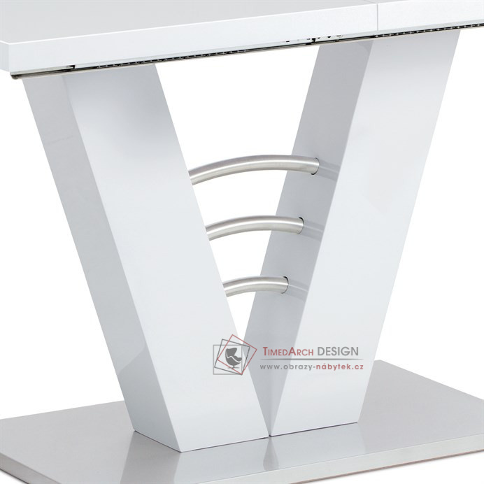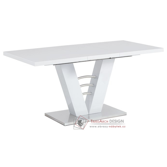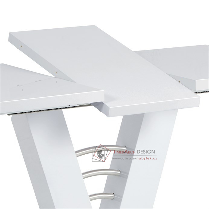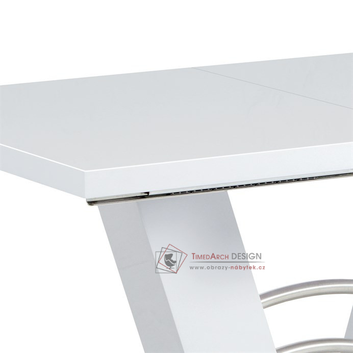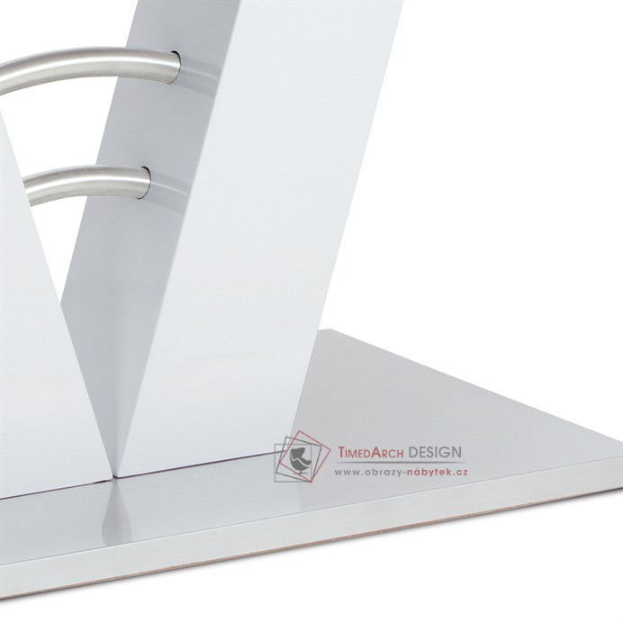 Rozměry stolu jsou 120x80 cm a lze jej rozložit na 160x80 cm. Moderní bílý lesk v kombinaci s broušeným nerezem vypadá velmi přepychově. Doporučujeme kombinovat s židlemi, které mají podnož z broušeného nerezu. Deska o tloušťce 4 cm.