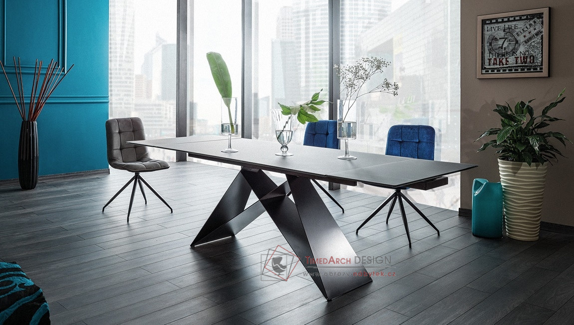 Kovová podnož černé barvy. Stolní deska je vyrobená z tvrzeného skla černé barvy. Plocha stolu před rozložením je 90x160 cm, po rozložení 90x240 cm. Stůl je určen až pro 8 osob.