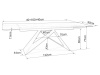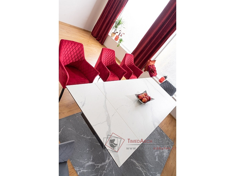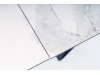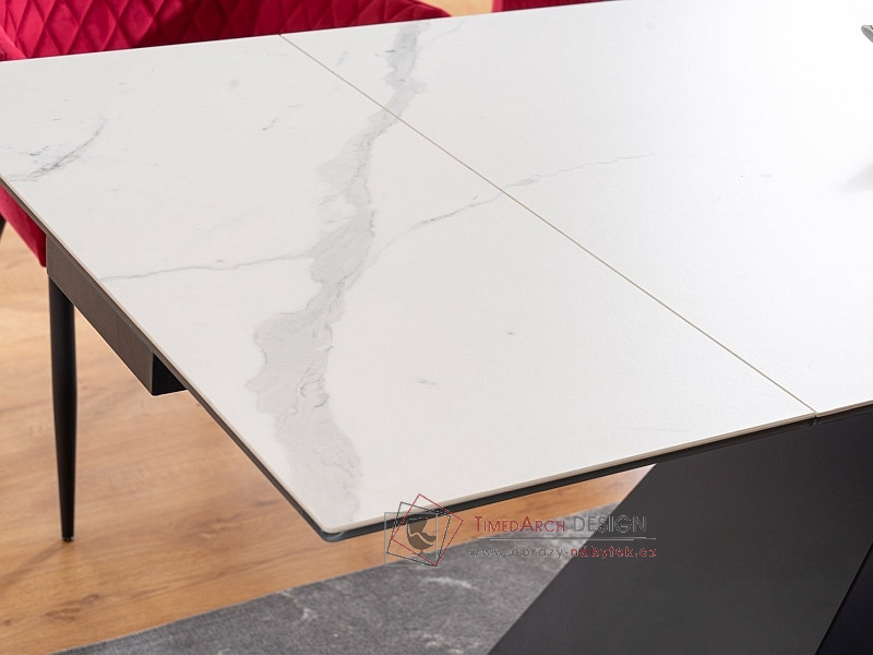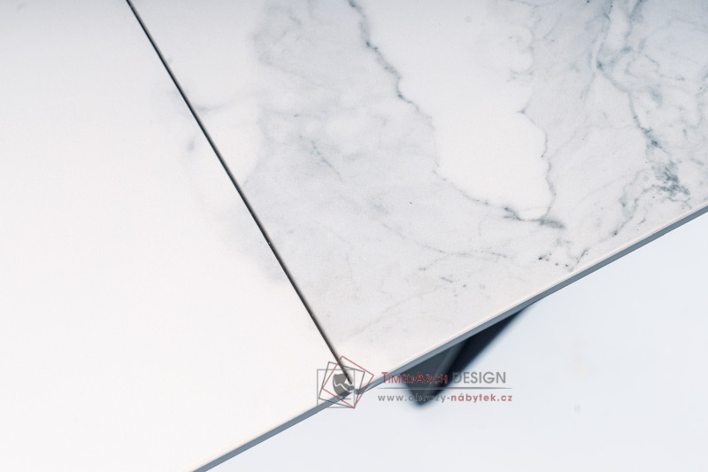 Podstavec stolu je kovový černé matné barvy. Stolní deska je vyrobena z tvrzeného skla a italské keramiky s efektem bílého mramoru.