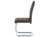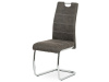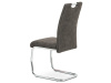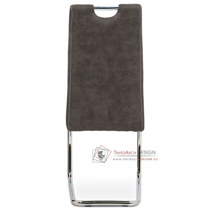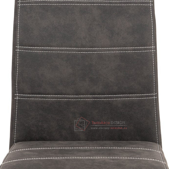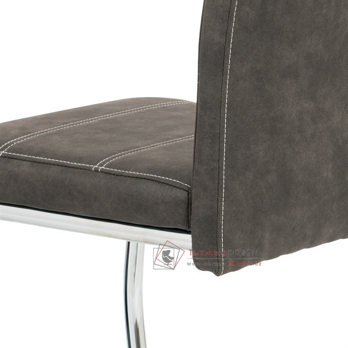 Moderní jídelní židle je čalouněná příjemnou hnědou látkou „COWBOY“ imitující broušenou kůži s dekorativním bílým prošitím sedáku i opěráku.