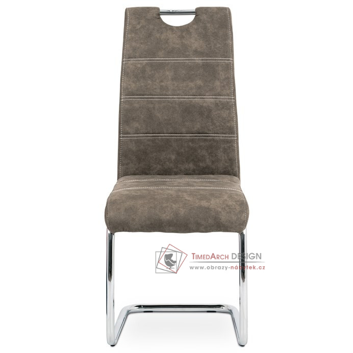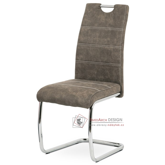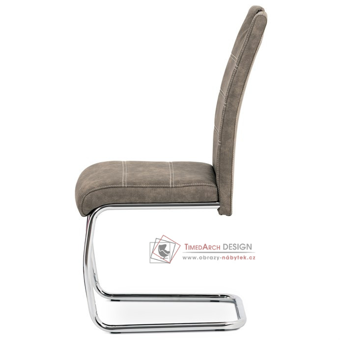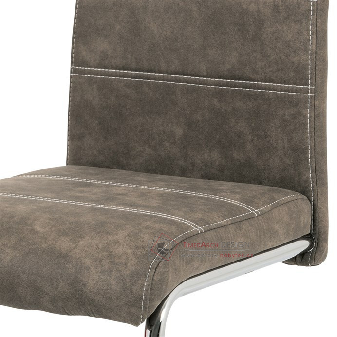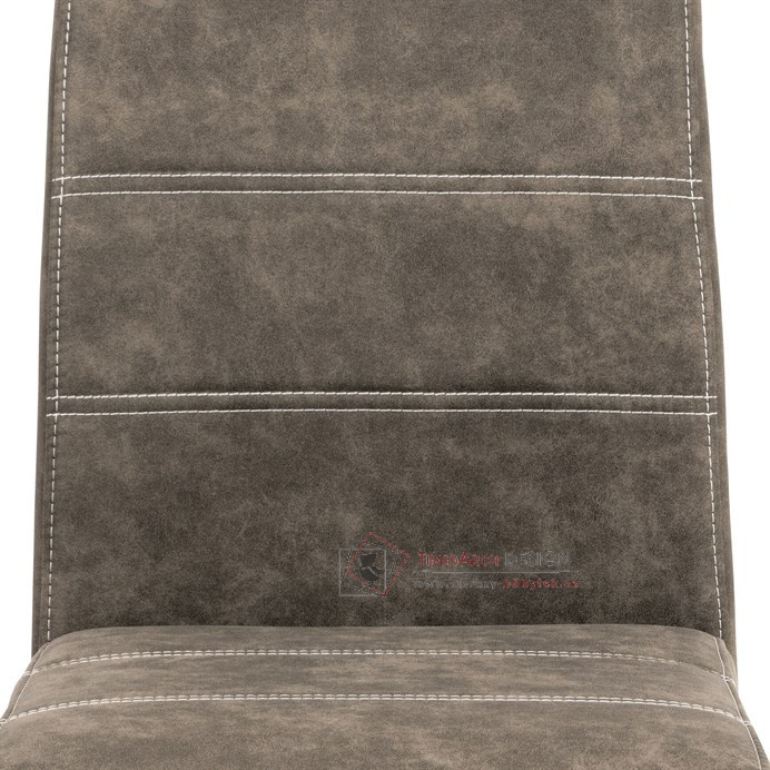 Moderní jídelní židle je čalouněná příjemnou antracitovou látkou „COWBOY“ imitující broušenou kůži s dekorativním bílým prošitím sedáku i opěráku.