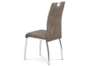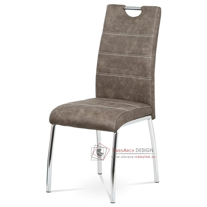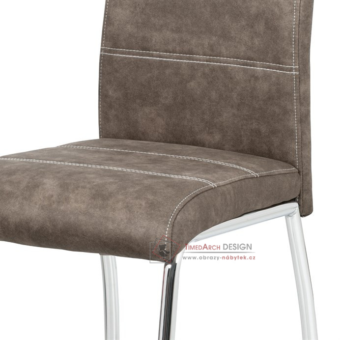 Moderní jídelní židle je čalouněná hnědou látkou s dekorativním bílým prošitím sedáku i opěráku.