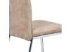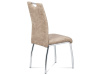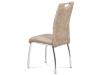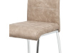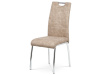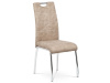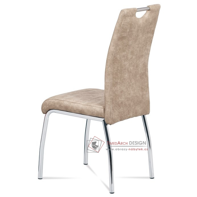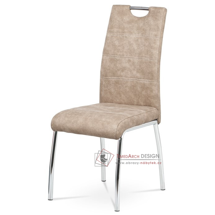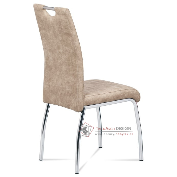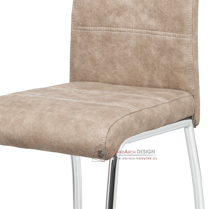 Moderní jídelní židle je čalouněná krémovou látkou COWBOY se vzhledem broušené kůže a s dekorativním bílým prošitím sedáku i opěráku.