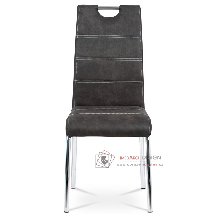 Moderní jídelní židle je čalouněná šedou látkou s dekorativním bílým prošitím sedáku i opěráku.