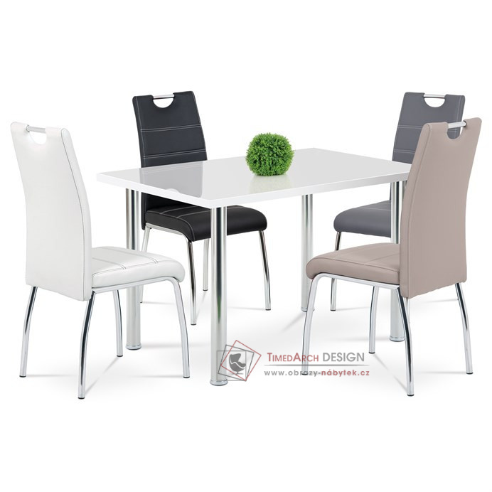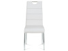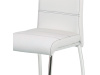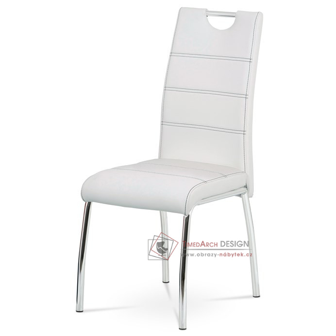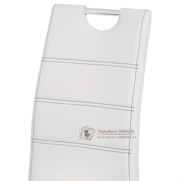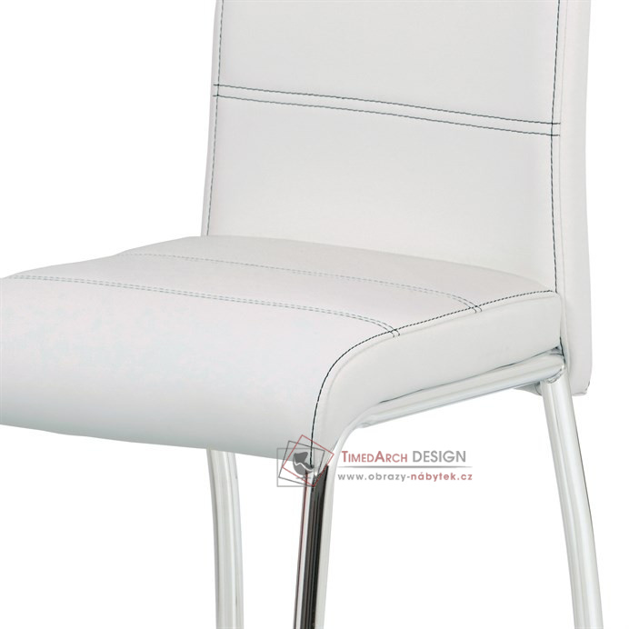 Potah je z bílé ekokůže, s bílým horizontálním a obvodovým prošitím opěráku i sedáku. Polstrování je z PU pěny. Moderní vzhled podtrhuje kovová čtyřnohá podnož s chromovou úpravou. Je kruhového průřezu a na konci nohou jsou plastové kluzáky, které sníží riziko poškození Vaší podlahy na minimum. Pro snazší manipulaci má židle i kovové madlo v horní části opěráku. Nosnost židle je až 110 kg. Díky snadno čistitelnému potahu je židle vhodná do kuchyní a jídelen.