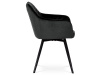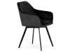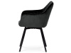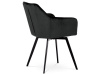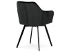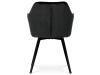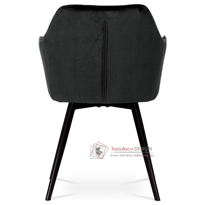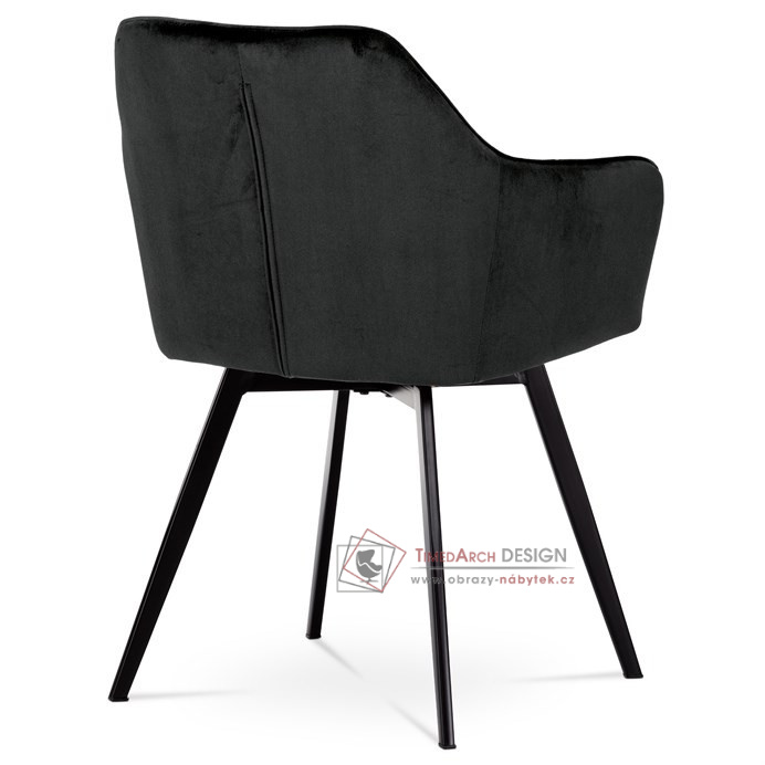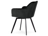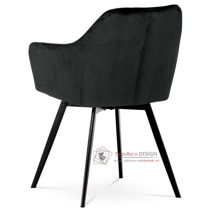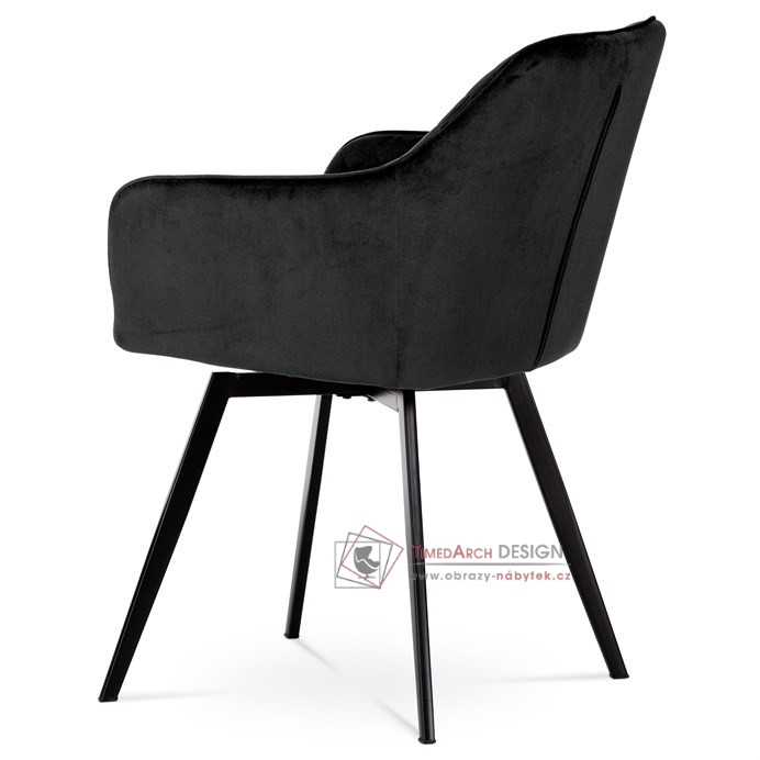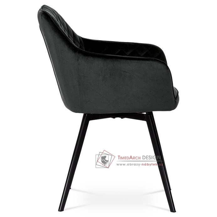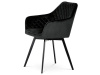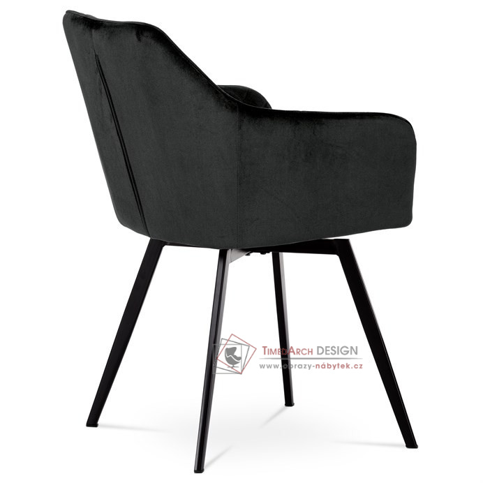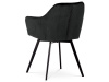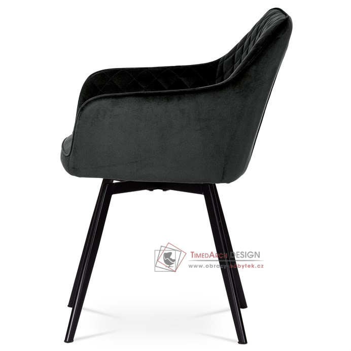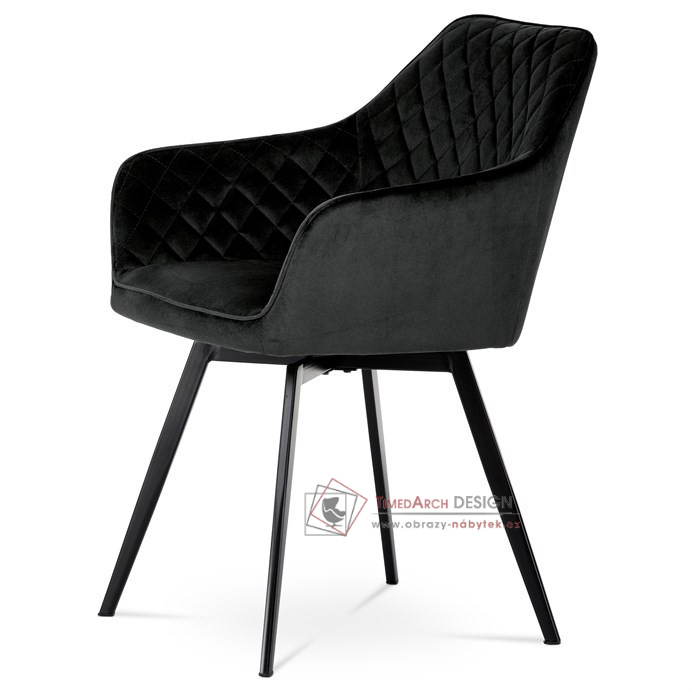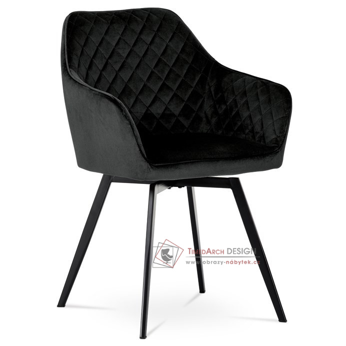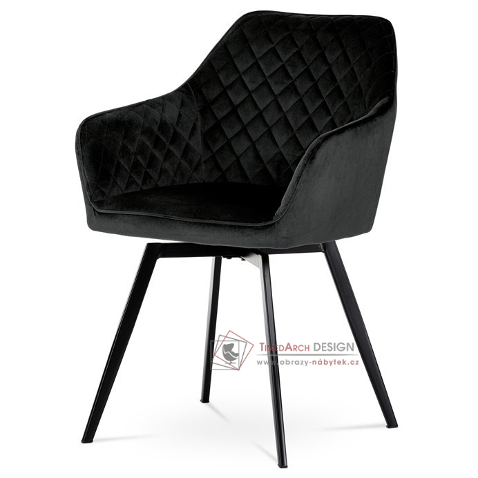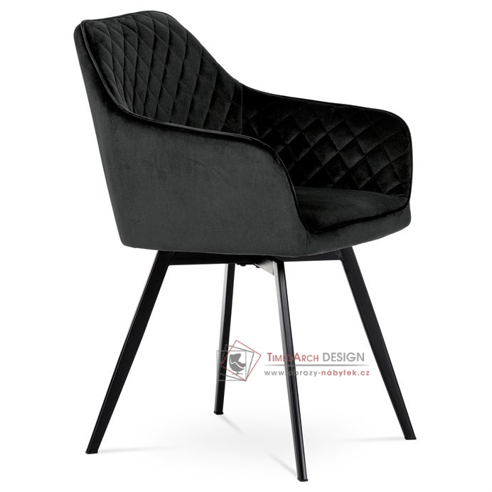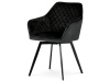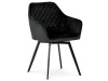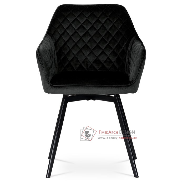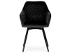 Skořepina sedáku a opěradla má potah z kvalitní látky ve vesmírně černém matném sametu. Polstrování je z PU pěny. Velmi dekorativním prvkem je výrazné kosočtvercové prošití vnitřních ploch v barvě potahu a paspule po obvodu celé skořepiny. Vybraná látka se také velmi dobře čistí. Stabilitu židle zajišťují čtyři kónické kovové nohy obdélníkového průřezu s kvalitním práškovým nástřikem v černé matné barvě. Ukončené jsou černými plastovými kluzáky, zabraňující poškození tvrdých povrchů podlah. Tato provedení produkují z tohoto modelu židle skvělou volbu pro zařízení obývacích či jídelních, ale také zasedacích místností. Nosnost židle je 110 kg. Bonusem této židle je otočný a vratným mechanismus, který umožňuje otáčení o 90° doleva a o 90° doprava a zároveň vždy vrátí sedák do původní polohy. Díky němu žiidle zůstanou vždy srovnané u stolu.