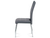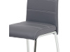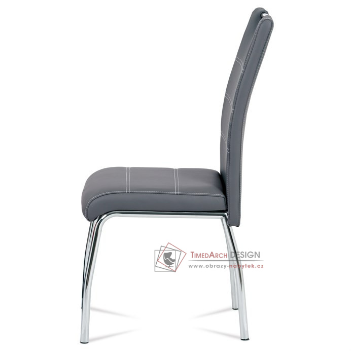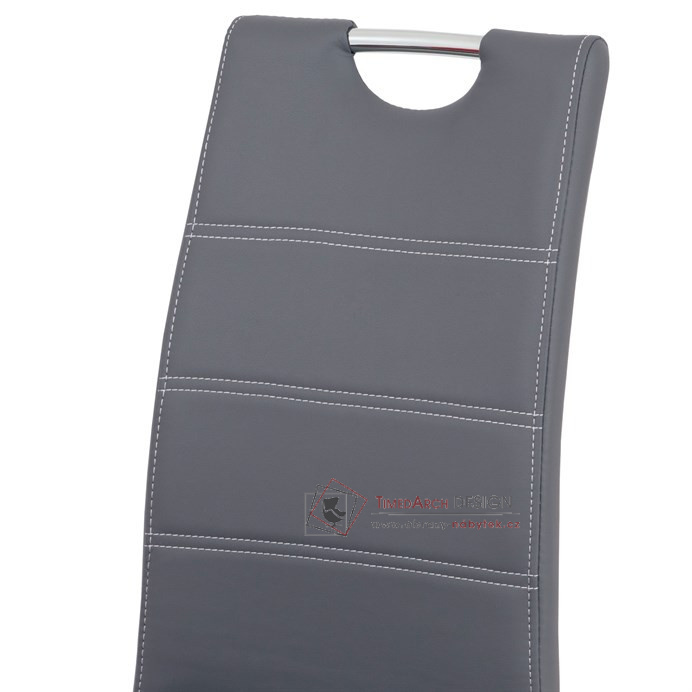 Potah je z šedé ekokůže, s bílým horizontálním a obvodovým prošitím opěráku i sedáku. Polstrování je z PU pěny. Moderní vzhled podtrhuje kovová čtyřnohá podnož s chromovou úpravou. Je kruhového průřezu a na konci nohou jsou plastové kluzáky, které sníží riziko poškození Vaší podlahy na minimum. Pro snazší manipulaci má židle i kovové madlo v horní části opěráku. Nosnost židle je až 110 kg. Díky snadno čistitelnému potahu je židle vhodná do kuchyní a jídelen.