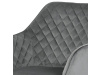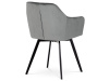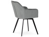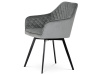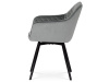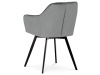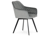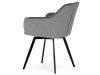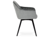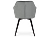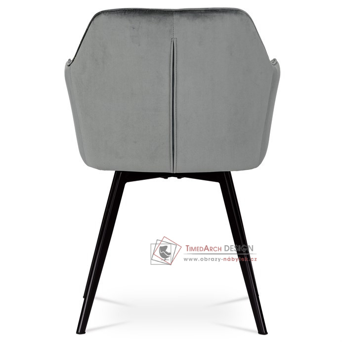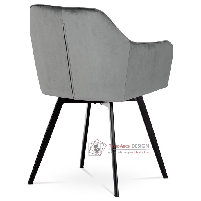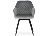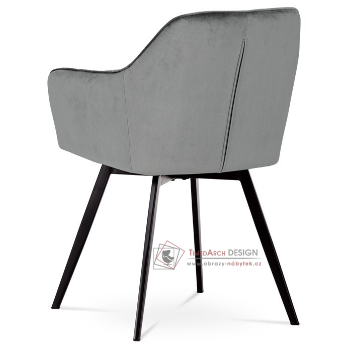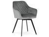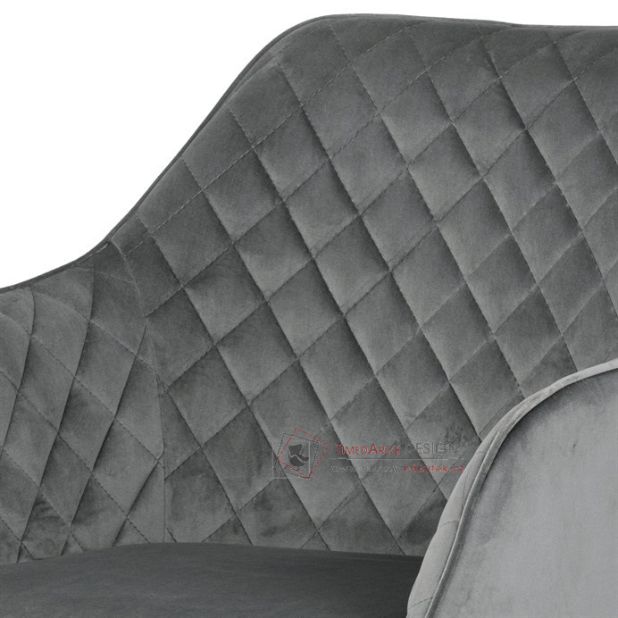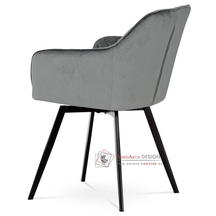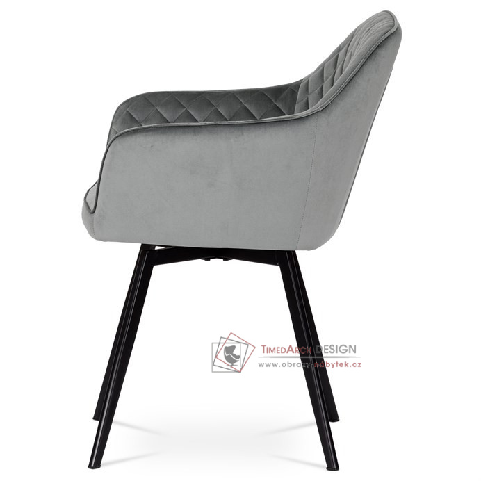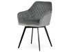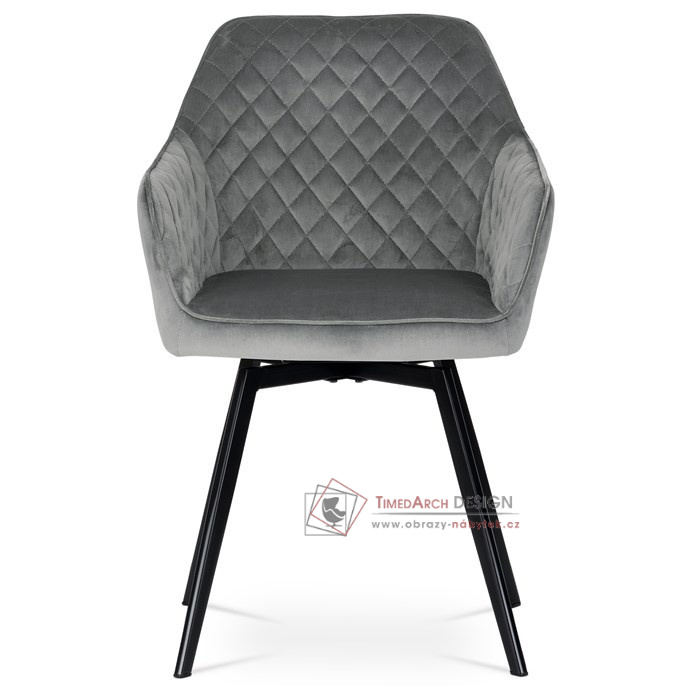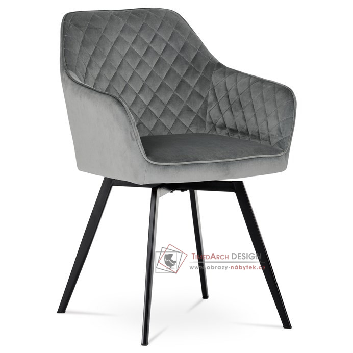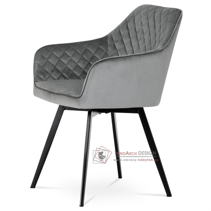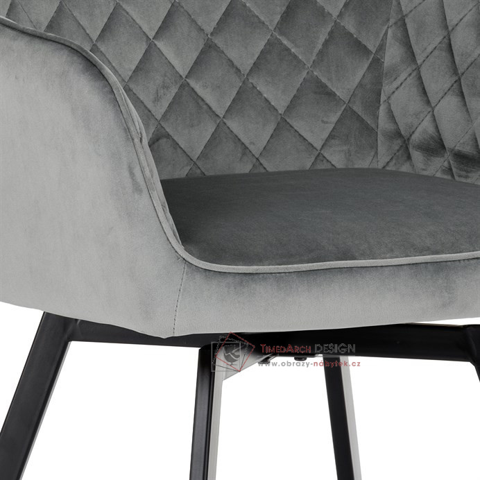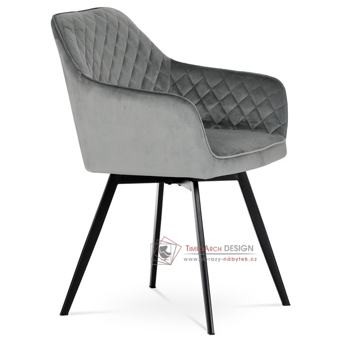 Skořepina sedáku a opěradla má potah z kvalitní látky v stříbřitě šedém matném sametu. Polstrování je z PU pěny. Velmi dekorativním prvkem je výrazné kosočtvercové prošití vnitřních ploch v barvě potahu a paspule po obvodu celé skořepiny. Vybraná látka se také velmi dobře čistí. Stabilitu židle zajišťují čtyři kónické kovové nohy obdélníkového průřezu s kvalitním práškovým nástřikem v černé matné barvě. Ukončené jsou černými plastovými kluzáky, zabraňující poškození tvrdých povrchů podlah. Tato provedení produkují z tohoto modelu židle skvělou volbu pro zařízení obývacích či jídelních, ale také zasedacích místností. Nosnost židle je 110 kg. Bonusem této židle je otočný a vratným mechanismus, který umožňuje otáčení o 90° doleva a o 90° doprava a zároveň vždy vrátí sedák do původní polohy. Díky němu žiidle zůstanou vždy srovnané u stolu.