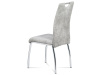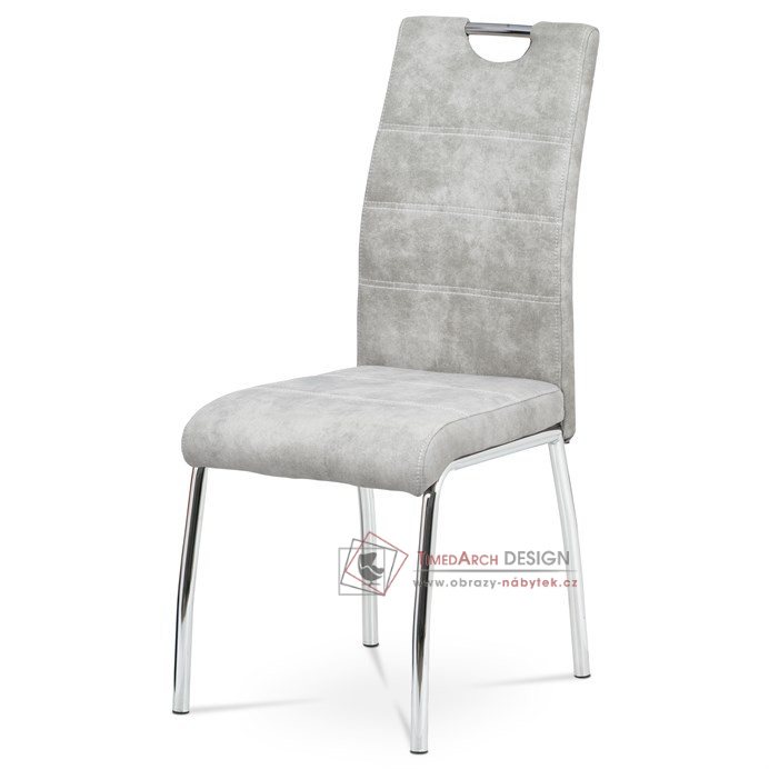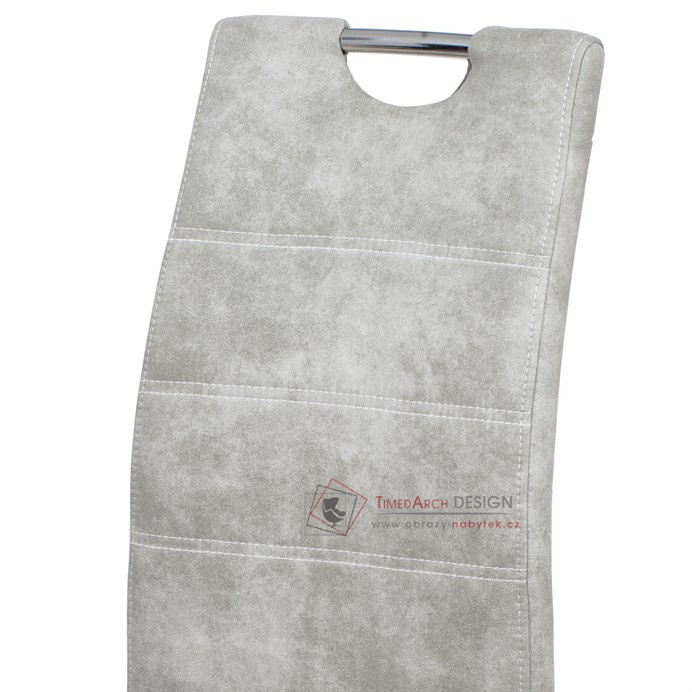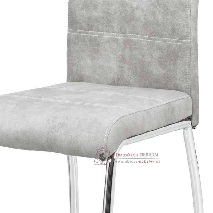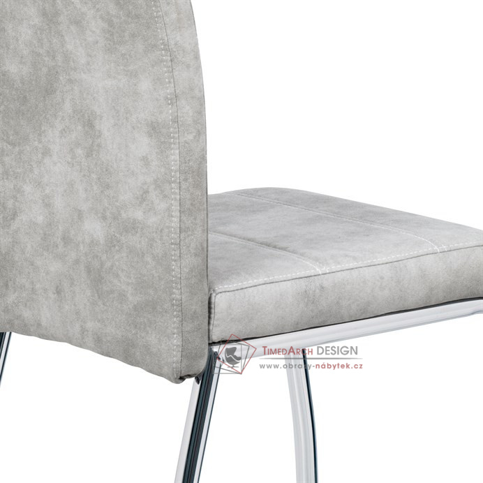Moderní jídelní židle je čalouněná stříbrnou látkou COWBOY v dekoru vintage kůže a s dekorativním bílým prošitím sedáku i opěráku.