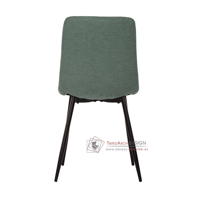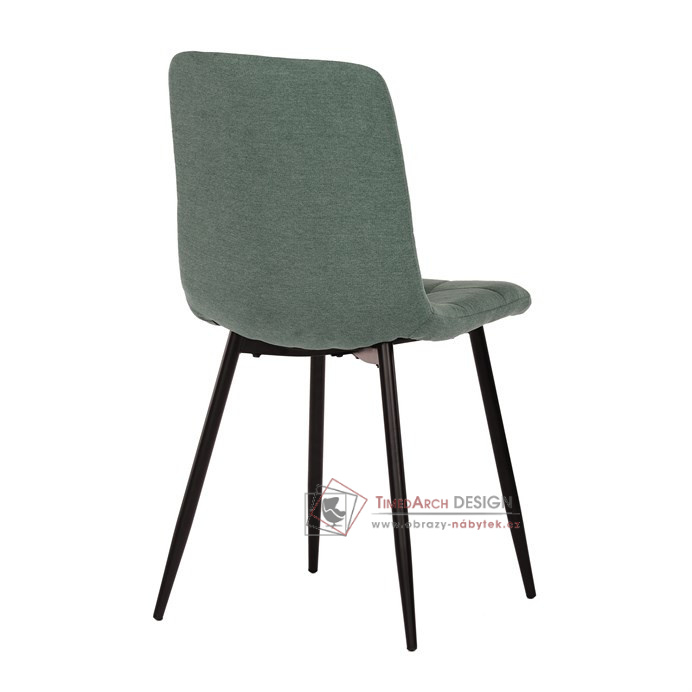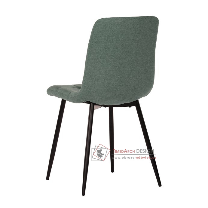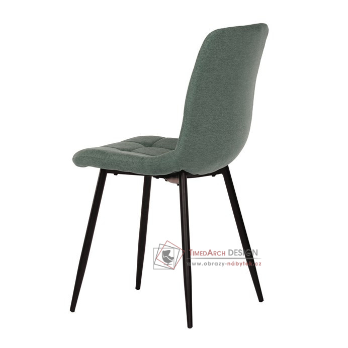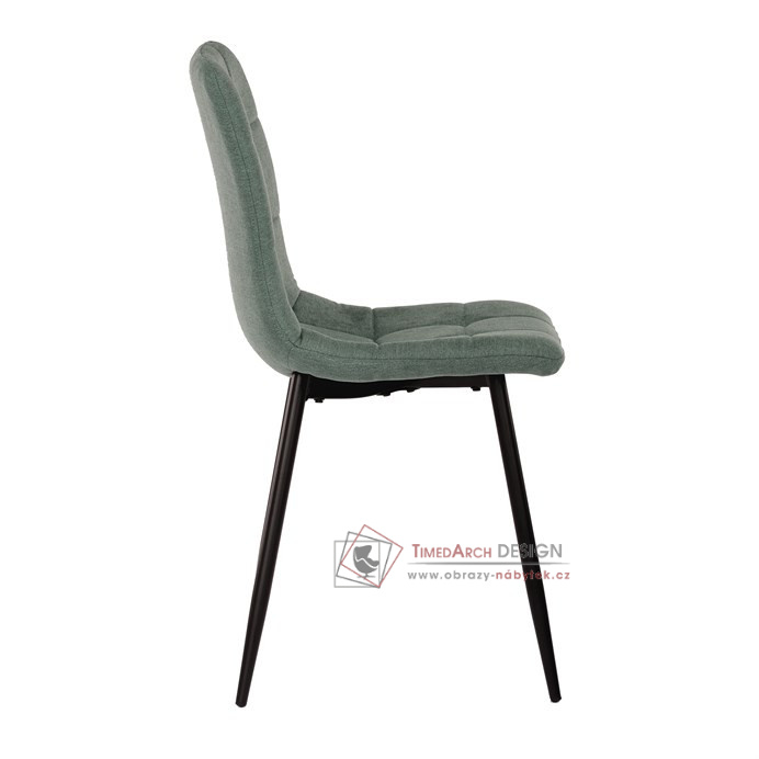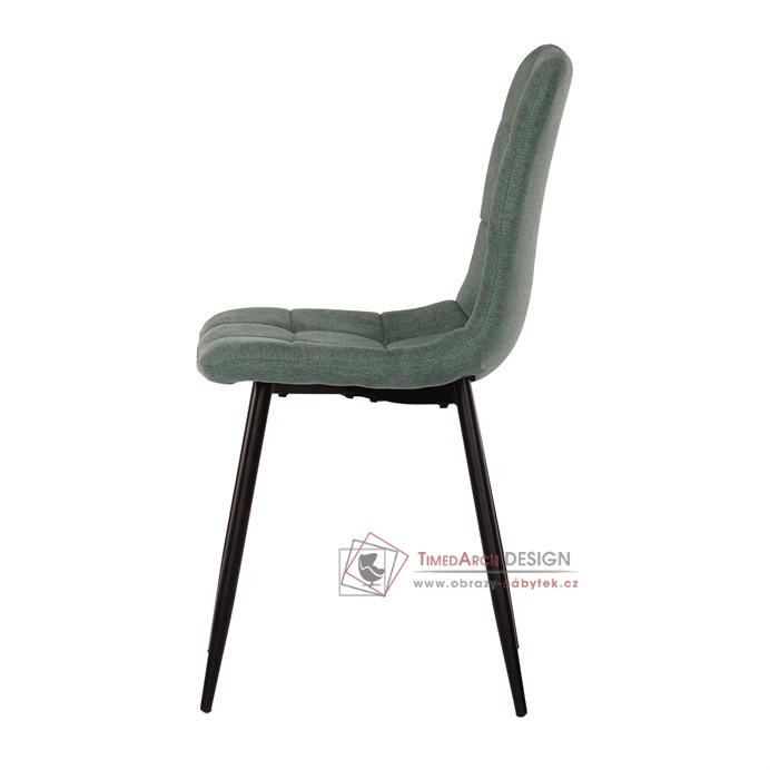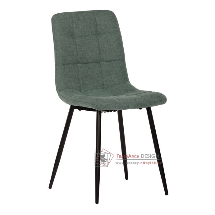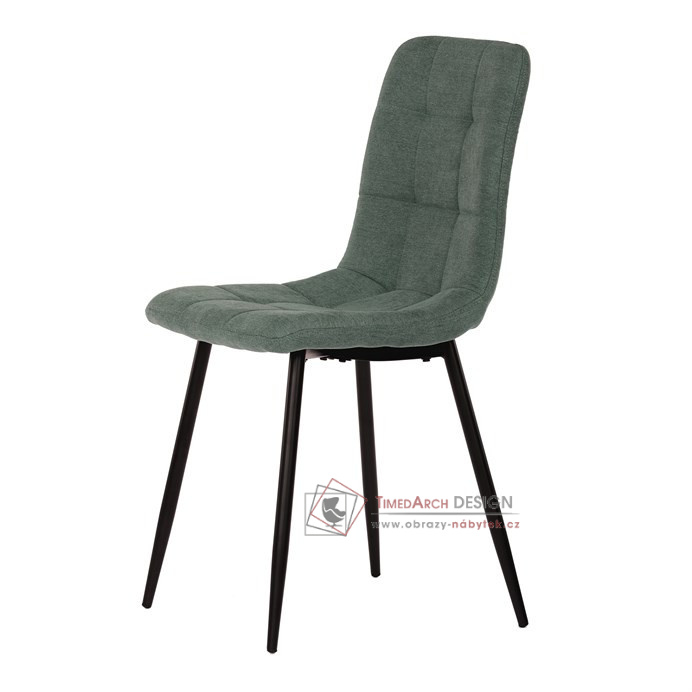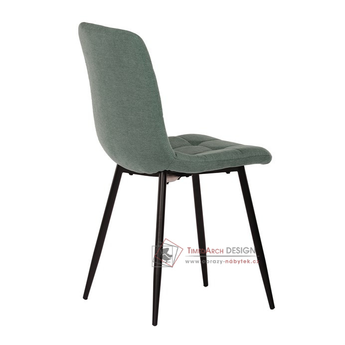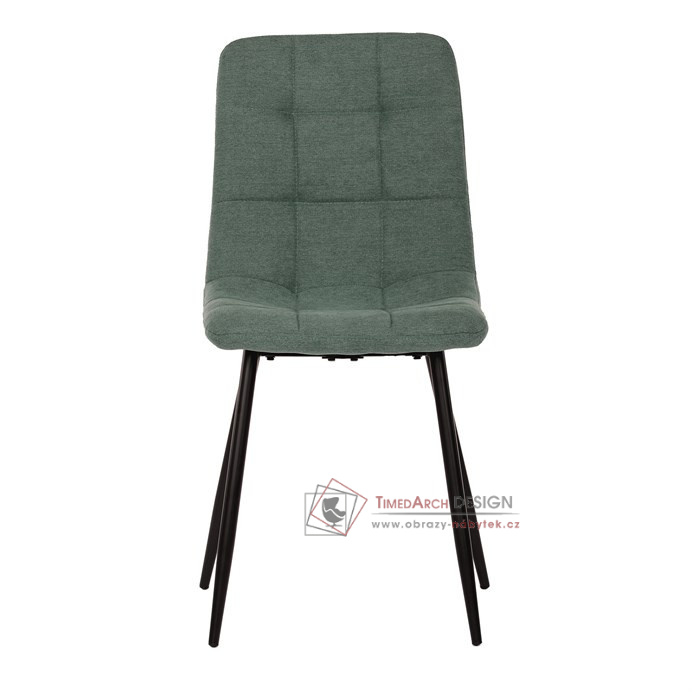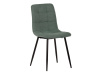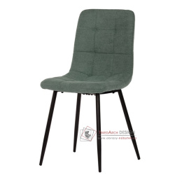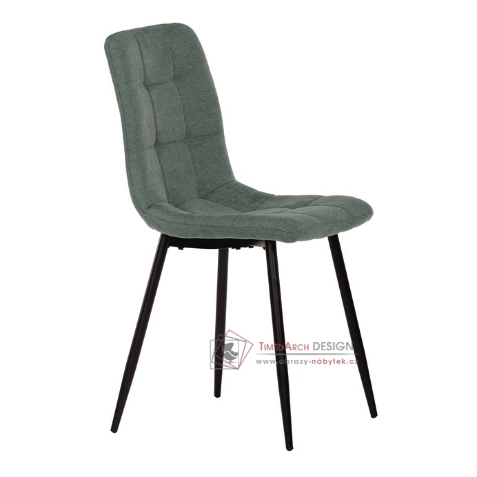 Potah je z jemně hrubé látky v trendy rákosově zeleném odstínu. Velmi dekorativní a výrazné je čtvercové prošívání čelních ploch sedáku i opěradla s čalounickými vtahy. Polstrování je z kvalitní PU pěny. Stabilitu židle zajišťují čtyři kónické kovové nohy s kvalitním práškovým nástřikem v černé matné barvě. Ukončené jsou černými plastovými kluzáky, zabraňující poškození tvrdých povrchů podlah. Nohy jsou kruhového průřezu o nejvyšším průměru 2,5 cm. Tento minimalistický a strohý design jídelních židlí je velmi oblíben pro svoji nadčasovost i pohodlí, které poskytuje a také variabilitu. Můžete ji bez obav použít k široké škále stolů v různých materiálech i provedeních. Maximální nosnost židle je až 120 kg. Základní rozměry – celková šíře 44 cm, celková hloubka 52 cm, celková výška 91 cm a výška sedu 46 cm. Montáž není složitá, zvládne ji i méně zručný nový majitel této židle.