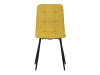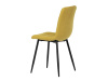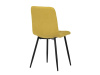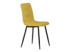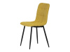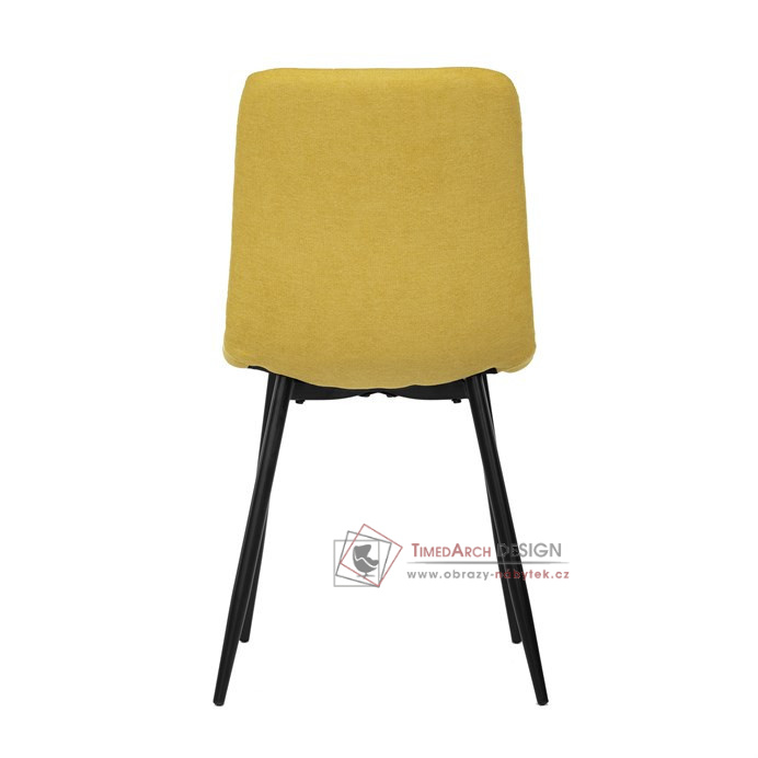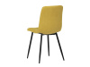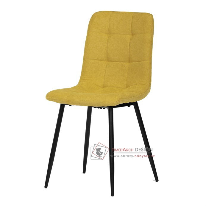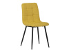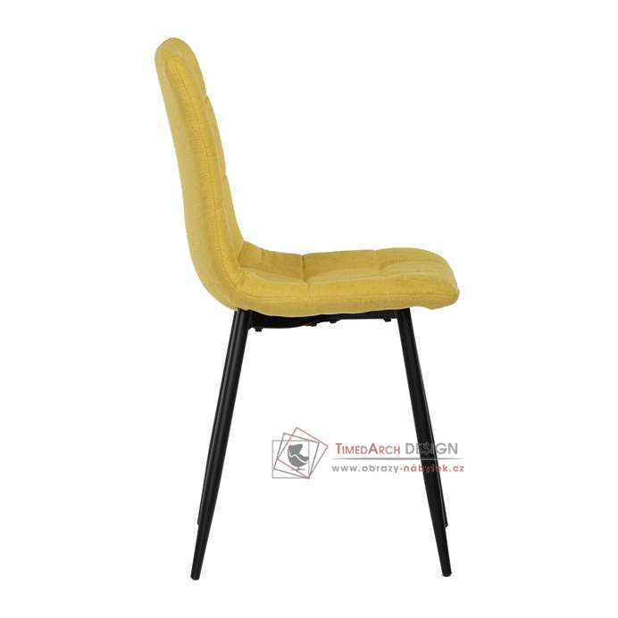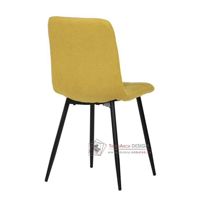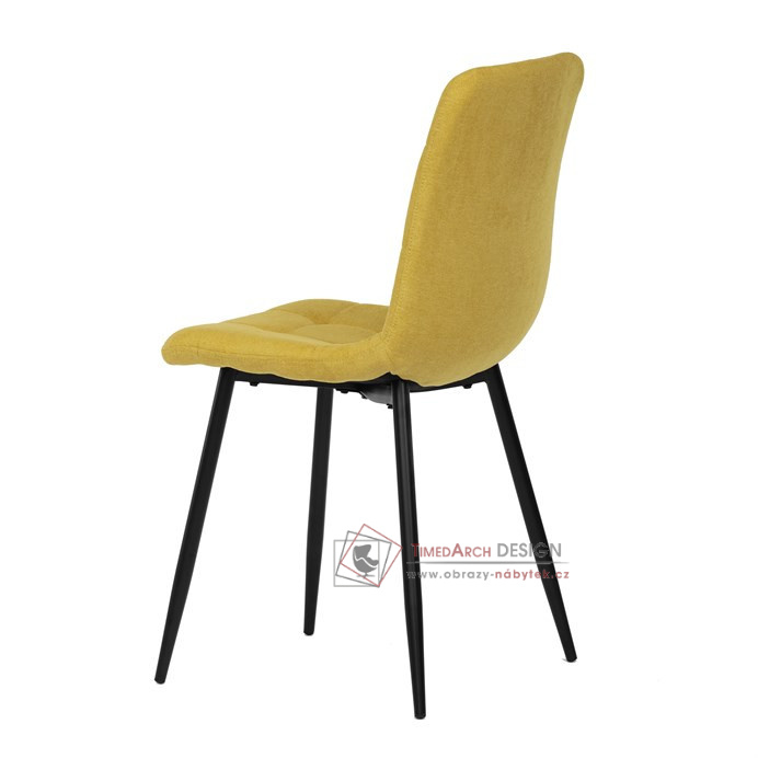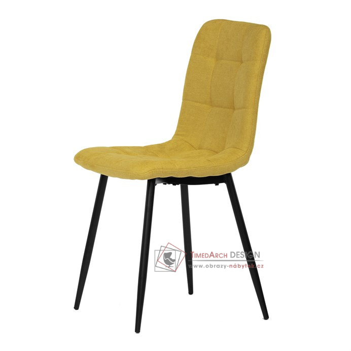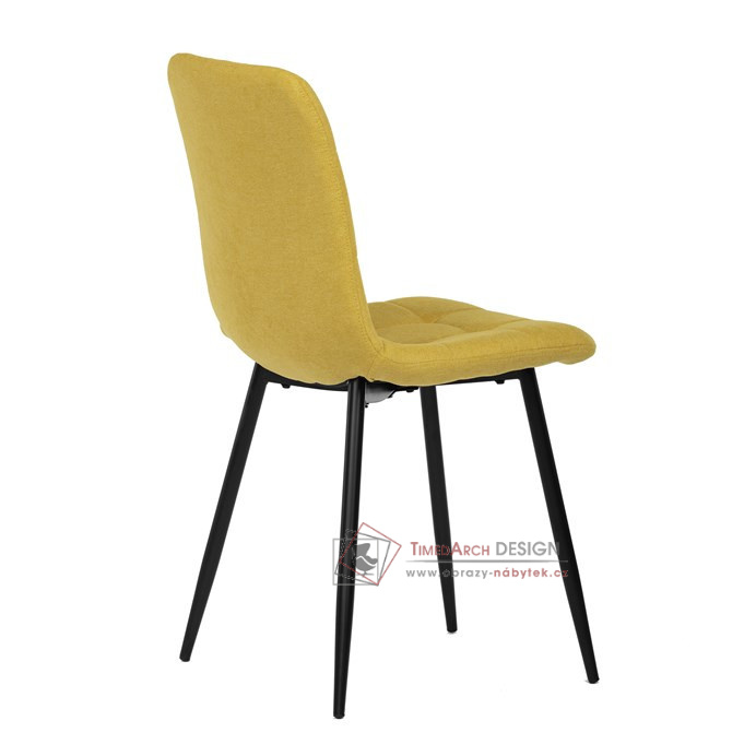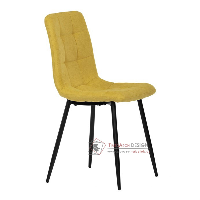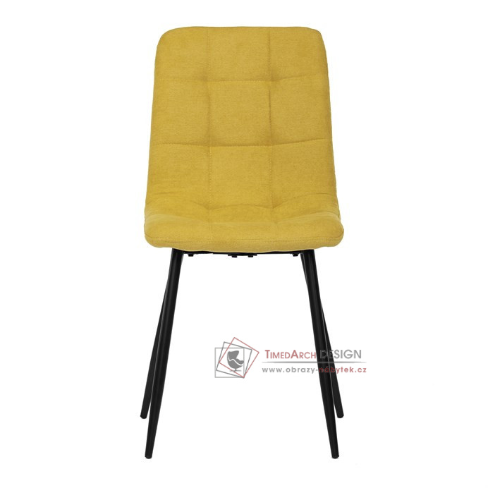 Potah je z jemně hrubé látky ve velmi žádaném hořčicově žlutím odstínu. Velmi dekorativní a výrazné je čtvercové prošívání čelních ploch sedáku i opěradla s čalounickými vtahy. Polstrování je z kvalitní PU pěny. Stabilitu židle zajišťují čtyři kónické kovové nohy s kvalitním práškovým nástřikem v černé matné barvě. Ukončené jsou černými plastovými kluzáky, zabraňující poškození tvrdých povrchů podlah. Nohy jsou kruhového průřezu o nejvyšším průměru 2,5 cm. Tento minimalistický a strohý design jídelních židlí je velmi oblíben pro svoji nadčasovost i pohodlí, které poskytuje a také variabilitu. Můžete ji bez obav použít k široké škále stolů v různých materiálech i provedeních. Maximální nosnost židle je až 120 kg. Základní rozměry – celková šíře 44 cm, celková hloubka 52 cm, celková výška 91 cm a výška sedu 46 cm. Montáž není složitá, zvládne ji i méně zručný nový majitel této židle.