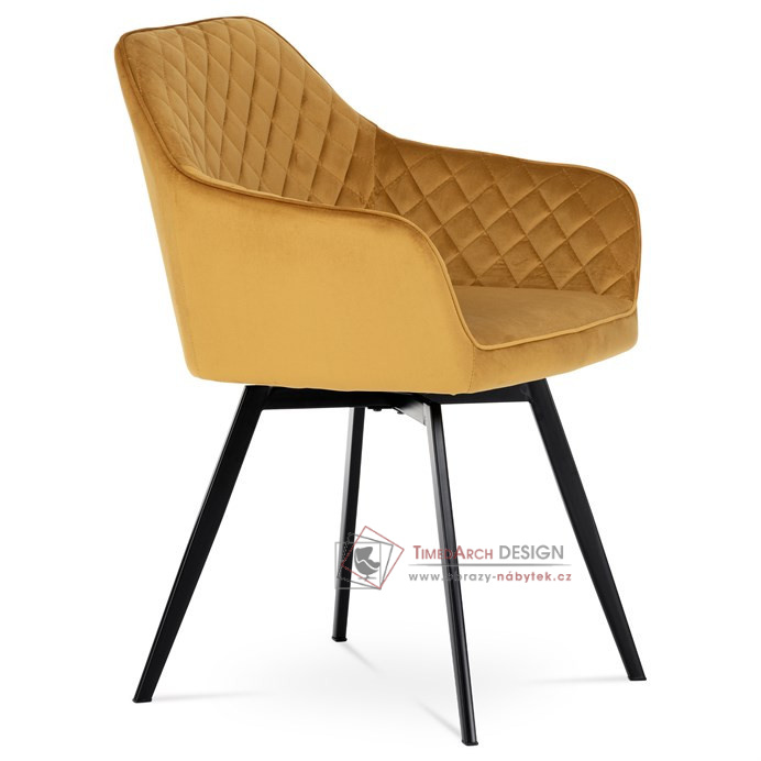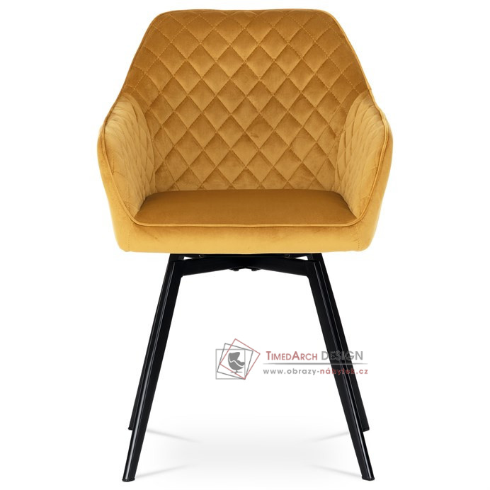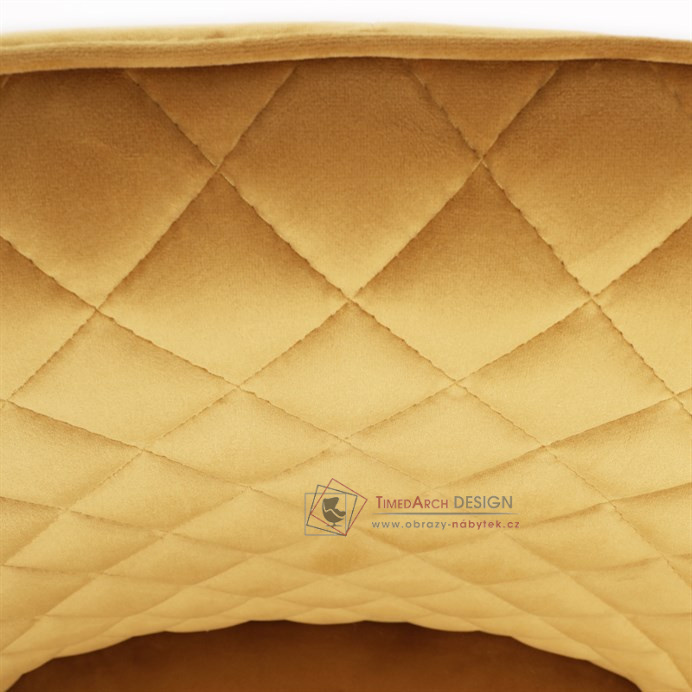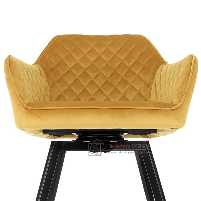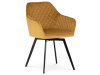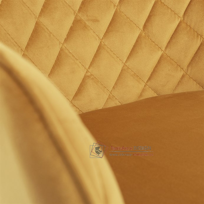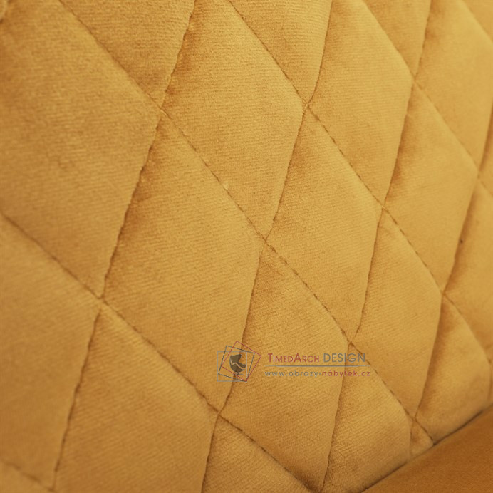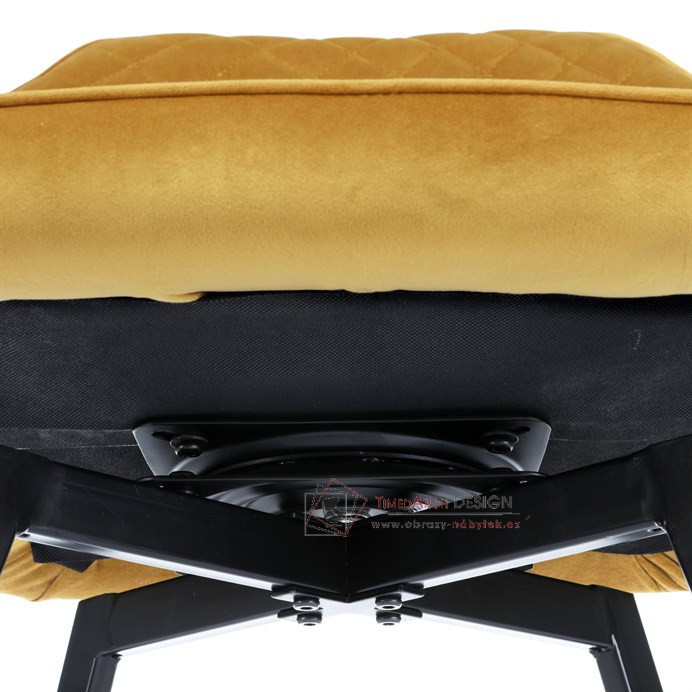 Skořepina sedáku a opěráku má potah z kvalitní látky v trendy hořčicově žlutém matném sametu. Polstrování je z PU pěny. Velmi dekorativním prvkem je výrazné kosočtvercové prošití vnitřních ploch v barvě potahu a paspule po obvodu celé skořepiny. Vybraná látka se také velmi dobře čistí. Stabilitu židle zajišťují čtyři kónické kovové nohy obdélníkového průřezu s kvalitním práškovým nástřikem v černé matné barvě. Ukončené jsou černými plastovými kluzáky, zabraňující poškození tvrdých povrchů podlah. Tato provedení produkují z tohoto modelu židle skvělou volbu pro zařízení obývacích či jídelních, ale také zasedacích místností. Nosnost židle je 110 kg. Bonusem této židle je otočný a vratným mechanismus, který umožňuje otáčení o 90° doleva a o 90° doprava a zároveň vždy vrátí sedák do původní polohy. Díky němu žiidle zůstanou vždy srovnané u stolu.