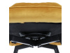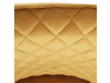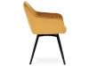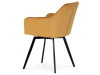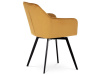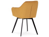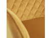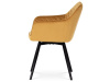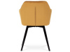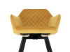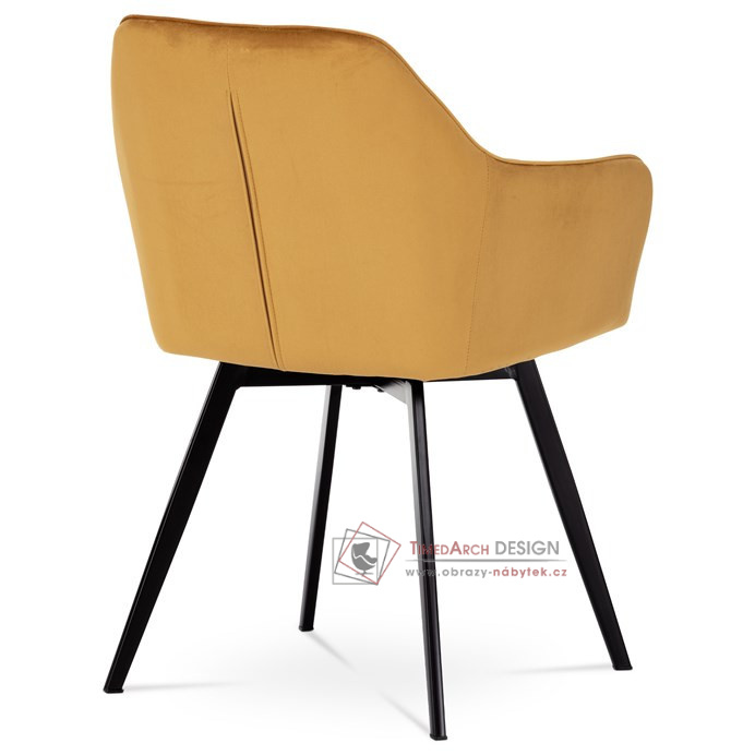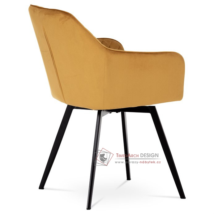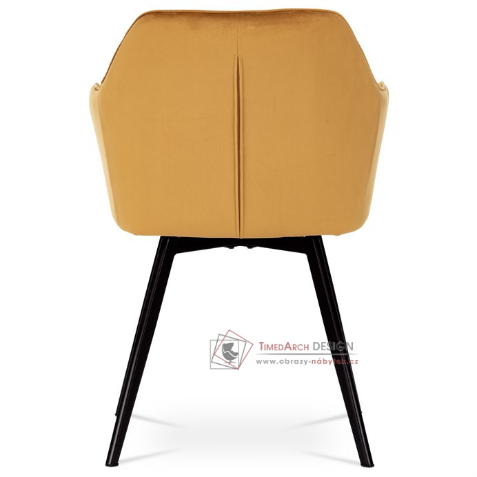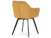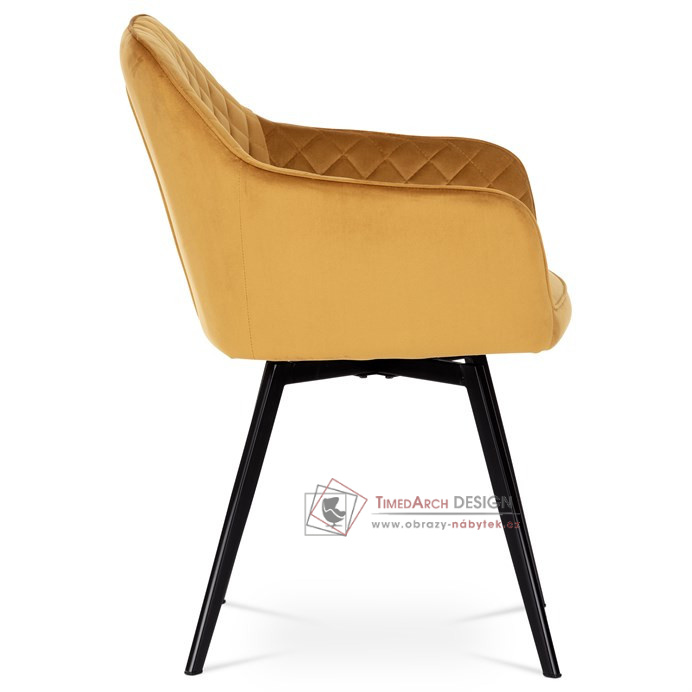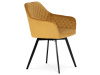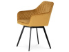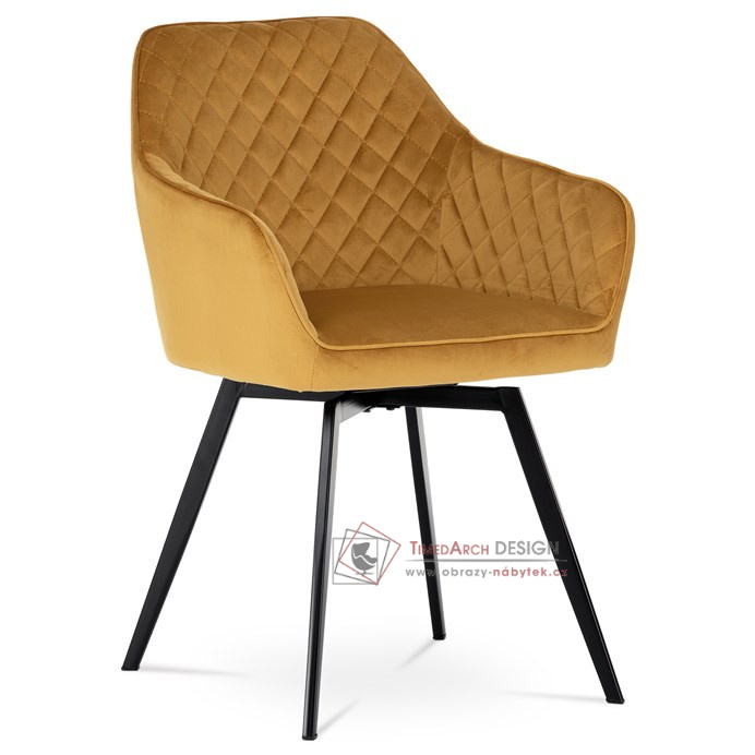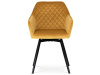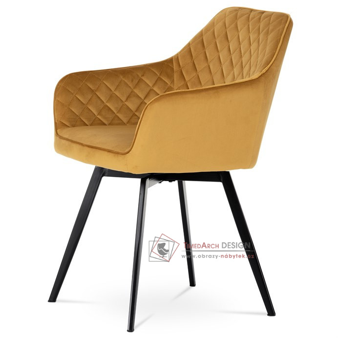 Skořepina sedáku a opěráku má potah z kvalitní látky v trendy hořčicově žlutém matném sametu. Polstrování je z PU pěny. Velmi dekorativním prvkem je výrazné kosočtvercové prošití vnitřních ploch v barvě potahu a paspule po obvodu celé skořepiny. Vybraná látka se také velmi dobře čistí. Stabilitu židle zajišťují čtyři kónické kovové nohy obdélníkového průřezu s kvalitním práškovým nástřikem v černé matné barvě. Ukončené jsou černými plastovými kluzáky, zabraňující poškození tvrdých povrchů podlah. Tato provedení produkují z tohoto modelu židle skvělou volbu pro zařízení obývacích či jídelních, ale také zasedacích místností. Nosnost židle je 110 kg. Bonusem této židle je otočný a vratným mechanismus, který umožňuje otáčení o 90° doleva a o 90° doprava a zároveň vždy vrátí sedák do původní polohy. Díky němu žiidle zůstanou vždy srovnané u stolu.