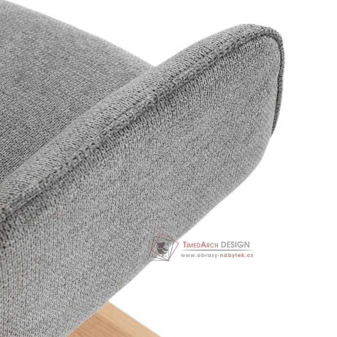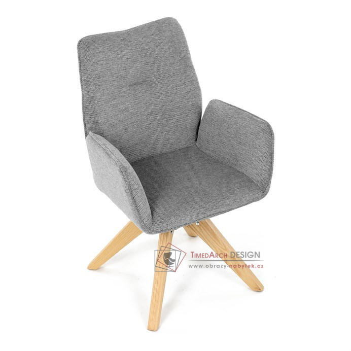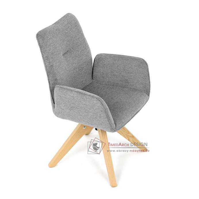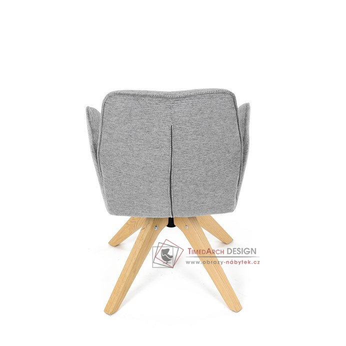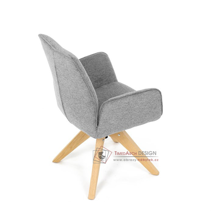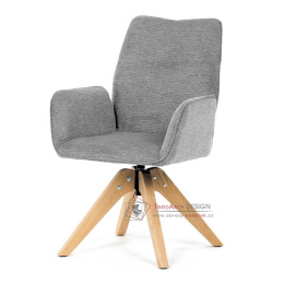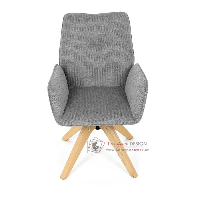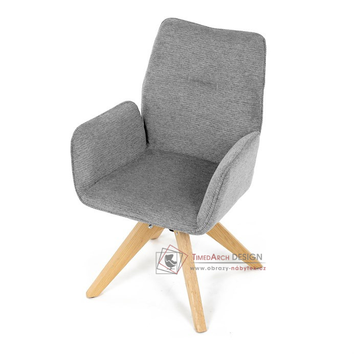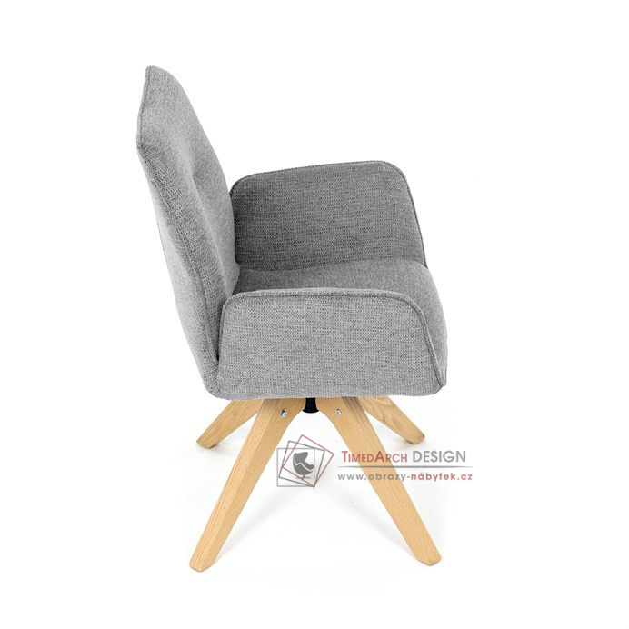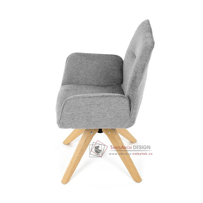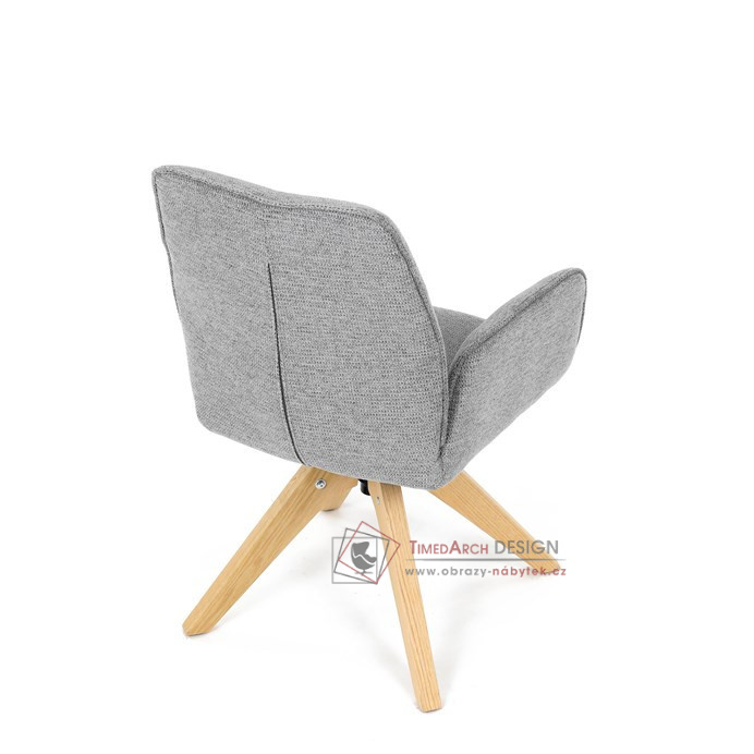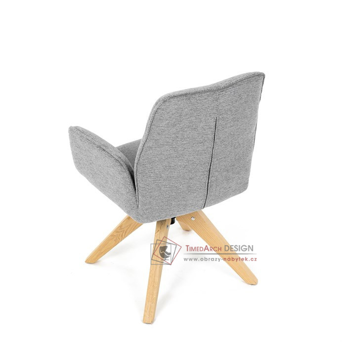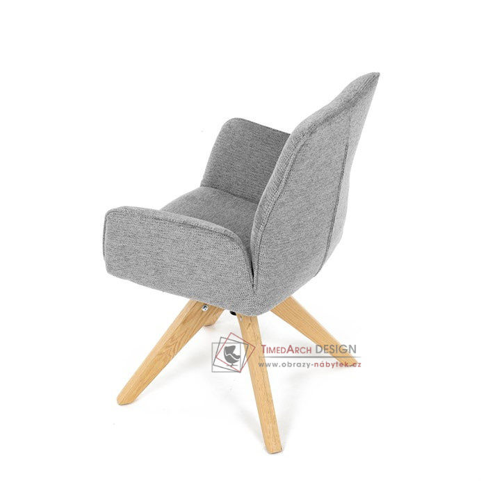 Její pohodlný sedák i opěrák jsou čalouněny voděodolnou látkou v příjemném světle šedém odstínu, což z ní činí skvělý doplněk do jakéhokoliv interiéru. Masivní dřevěné nohy v přírodní barvě dodávají židli stabilitu a odolnost, zatímco otočný mechanismus s funkcí 360° přináší uživatelský komfort. Tato jídelní židle je ideální nejen do domácností, ale také do kaváren či restaurací, kde je požadován moderní a funkční nábytek.