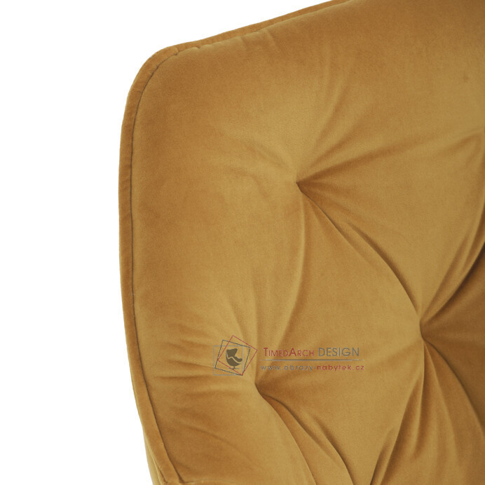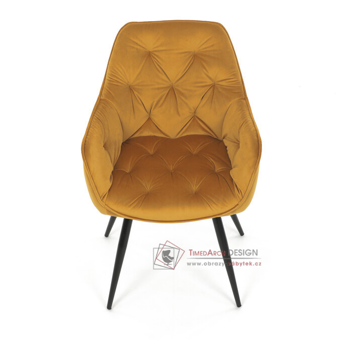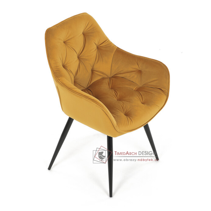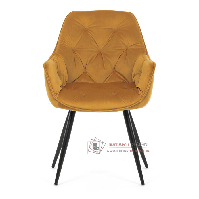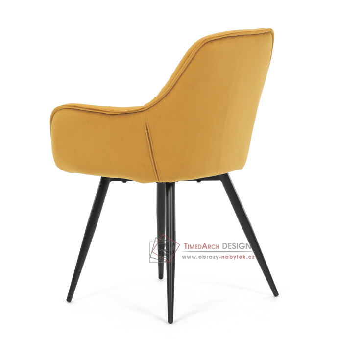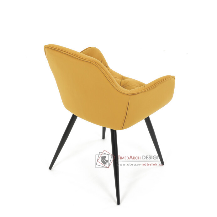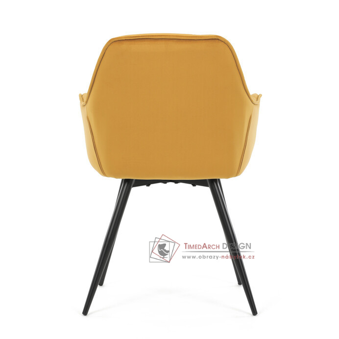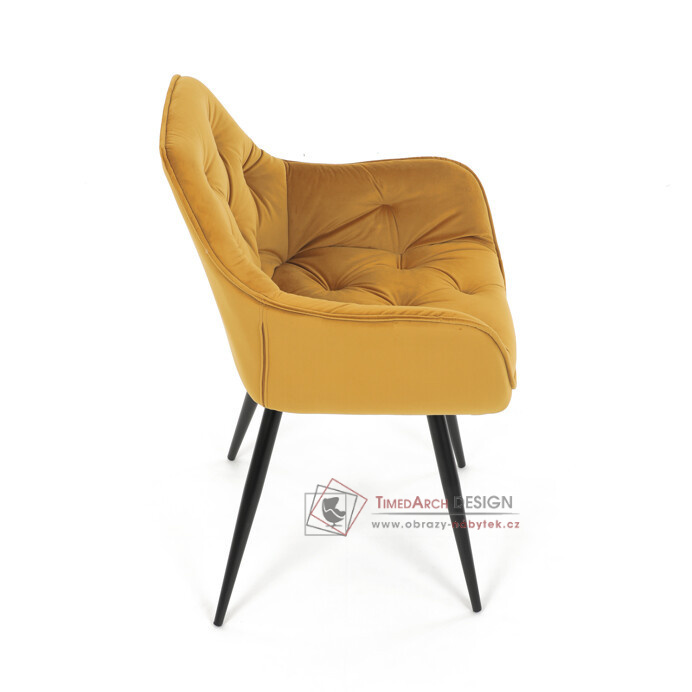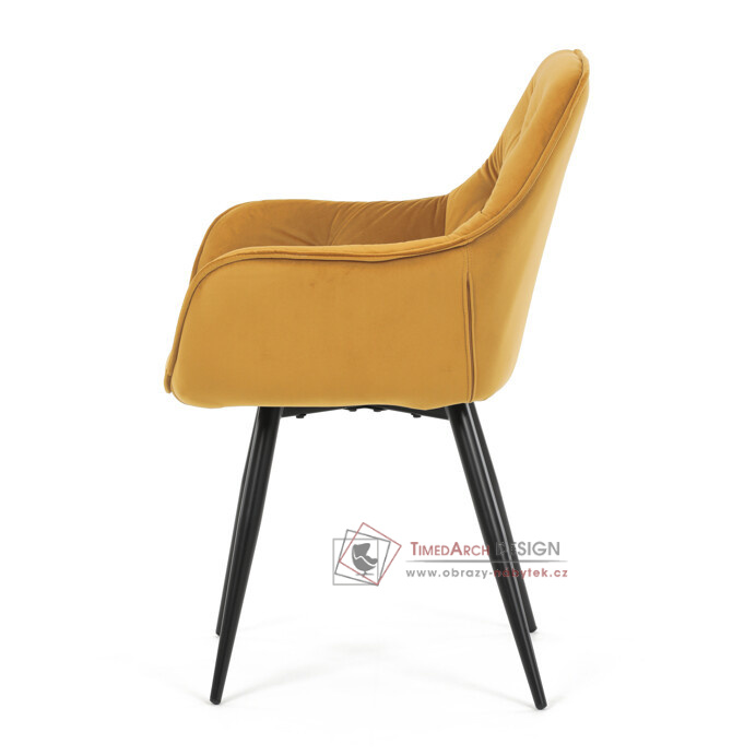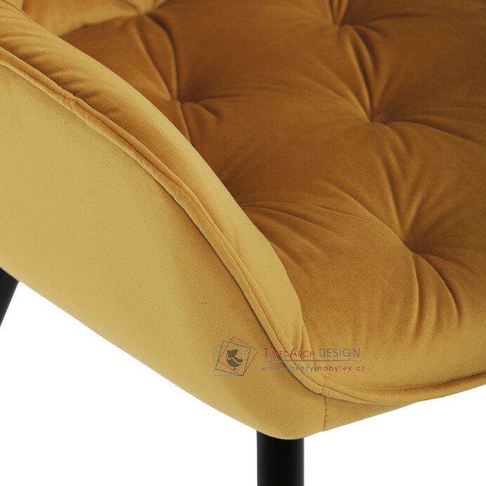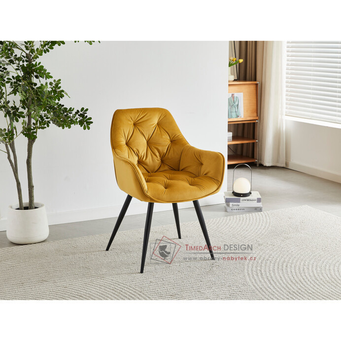 Jídelní židle DCH-421 YEL4 s čalouněním v žluté sametové látce nabízí pohodlné sezení díky měkkému polstrování a ergonomicky tvarovaným područkám.