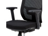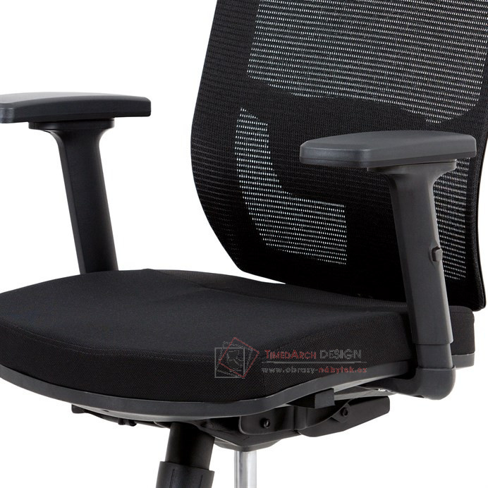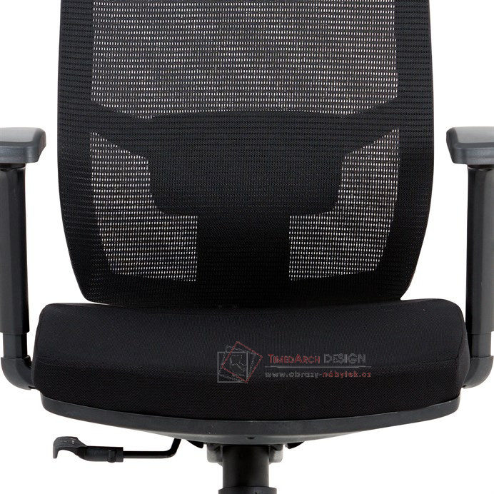 Kancelářská židle se síťovaným opěrákem v černé barvě a černým látkovým sedákem.