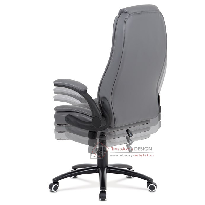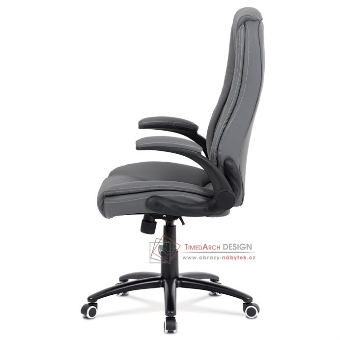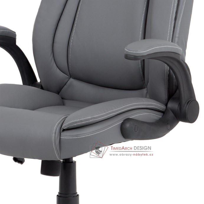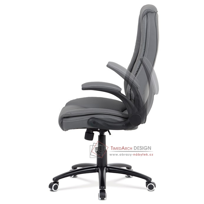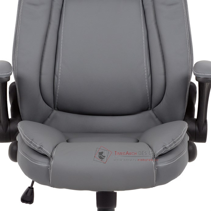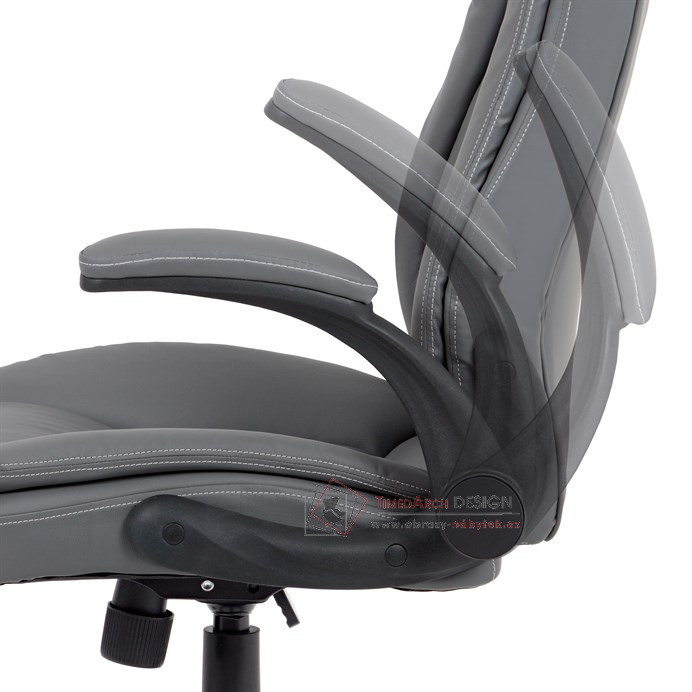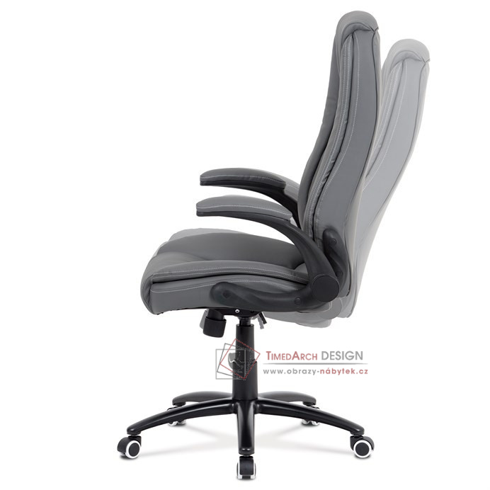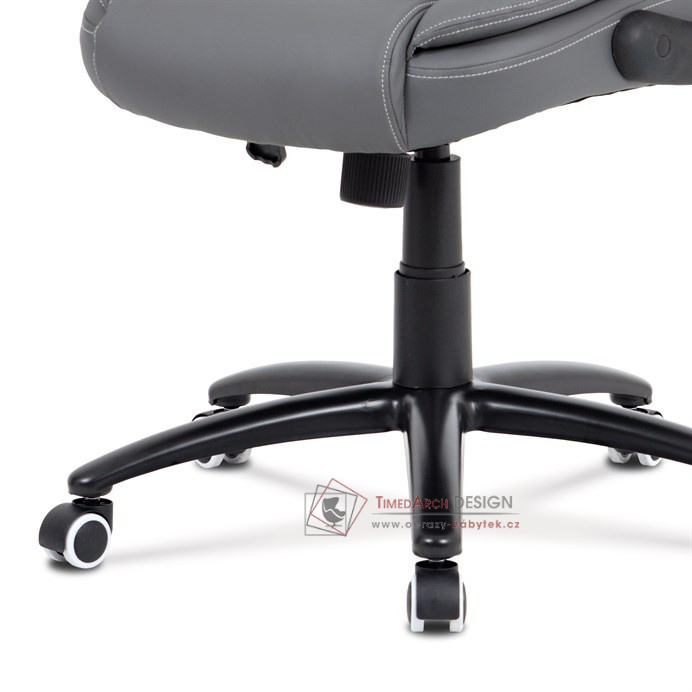 Díky pohodlnému a stylově tvarovanému sedáku a opěráku s elegantním prošitím a s velmi měkkým podhlavníkem se budete cítit maximálně pohodlně. Ruce si můžete pohodlně opřít o odklápěcí plastové područky černé barvy s polstrováním čalouněným šedou ekokůží. Židle má také i snadno omyvatelný zesílený kovový kříž matné černé barvy s plastovými kolečky vhodnými na tvrdé typy podlah (dlažba, parkety, plovoucí podlahy apod.). Židle je výškově nastavitelná, s houpacím mechanismem a předním šroubem upravující tuhost pohupu. Nosnost židle je až 120 kg.