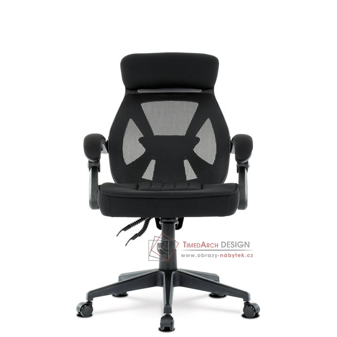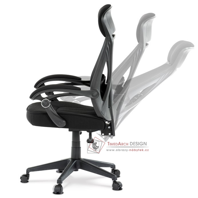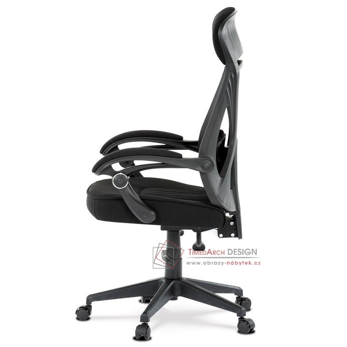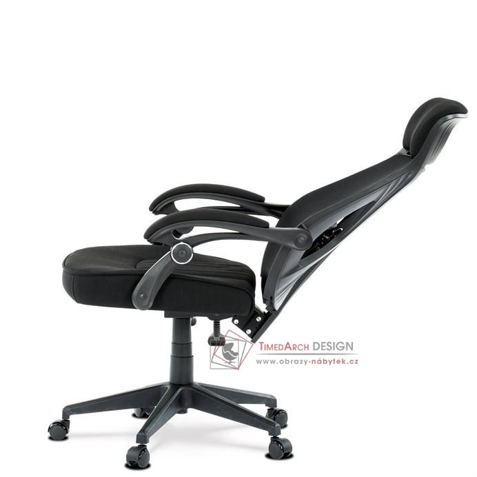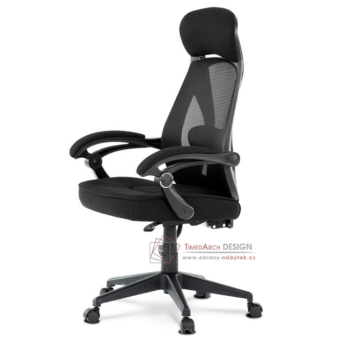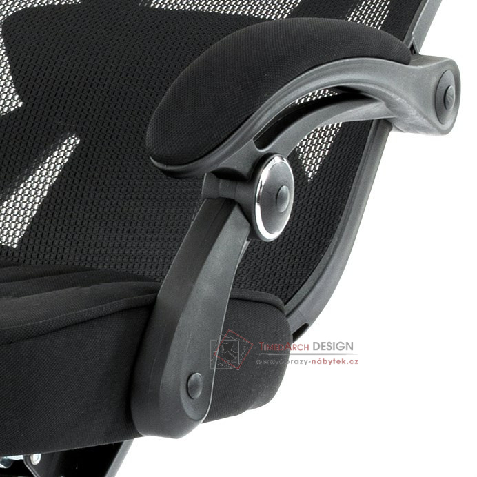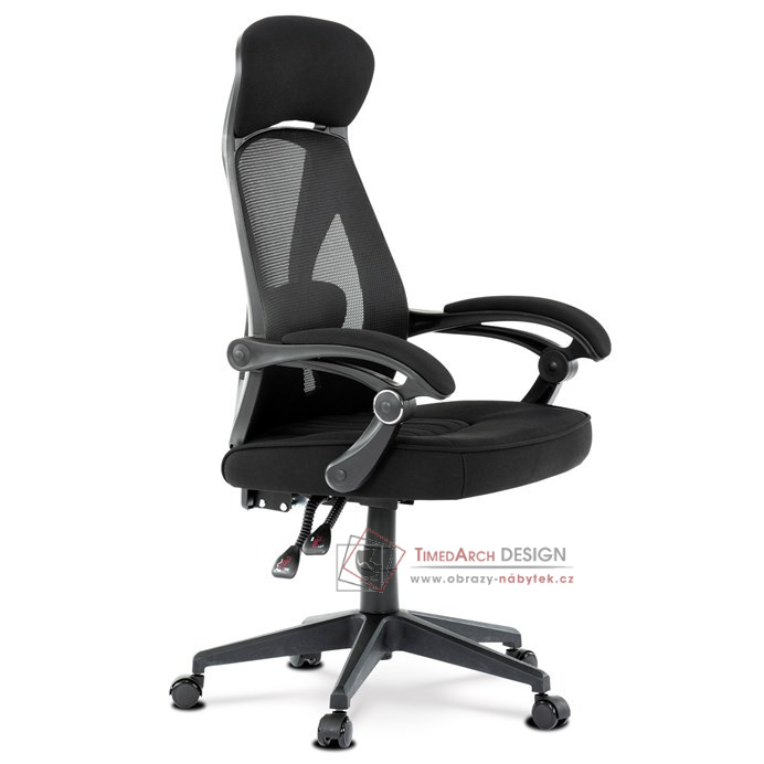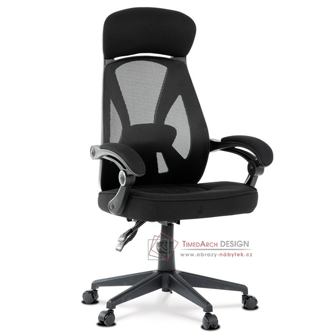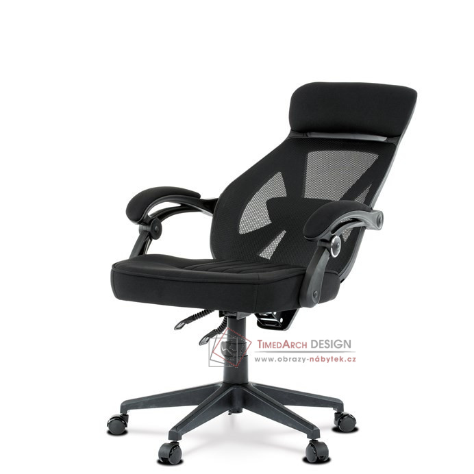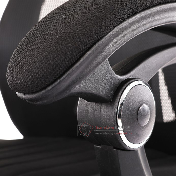 Jedná se o moderní designové křeslo, navržené pro standardní a náročnou kancelářskou práci, ale plně vyhovuje i pro požadavky PC hráčů. To vše v maximálním pohodlí a při dokonalé ergonomii sezení. Potah je kombinací černé, jemně hrubé látky na sedáku, opěrkách, bederní opěrce i o opěrce hlavy a černé síťoviny MESH na vysokém opěráku. Sedák má zvýšené okraje a střed je zpevněn výrazným a dekorativním prošitím. Opěrák je masivní černý plastový výlisek s designovými prolisy na ladných oblých tvarech. Výplň sedáku i hlavové opěrky je z velmi kvalitní a tuhé PU pěny. Křeslo je vybaveno permanent contact mechanismem s plynulou aretací. Při vypnutí je možné se s opěradlem volně pohupovat. Výška sezení se upravuje jednou páčkou na pravé straně přes kvalitní plynový píst. Poloha opěráku se nastavuje druhou páčkou, umístěnou rovněž na pravé straně křesla. Černý plastový kříž je osazen černými plastovými kolečky pr. 5 cm s gumovým obvodem ideálním na tvrdé podlahy. Se stabilitou celých 70 cm průměru kříže si můžete dovolit opravdu hodně jak z kancelářské, tak herní činnosti. Vysoký, prodyšný a ergonomicky navržený opěrák s integrovanou zesílenou opěrkou hlavy, polstrovanou a výškově nastavitelnou bederní opěrkou slouží nejen jako výborná opora celých zad a také podporuje správné držení páteře. Područky jsou plastové, polstrované a potažené černou látkou. Šíře je 7,5 cm, délka ložné plochy 32 cm a výška 3 cm. Při sklápění sedáku se pohybují a kopírují jeho pohyb a polohu. Nosnost židle je až 130 kg. Toto křeslo je skvělou volbou, ať stojí za kancelářským nebo hracím stolem. Svým černým provedením s velmi decentními chromovými doplňky na područkách působí vždy velmi luxusně. Kvalita zpracování, důraz na pohodlí a ergonomii, to zaručuje pohodu při denní kancelářské práci i herních večerech.