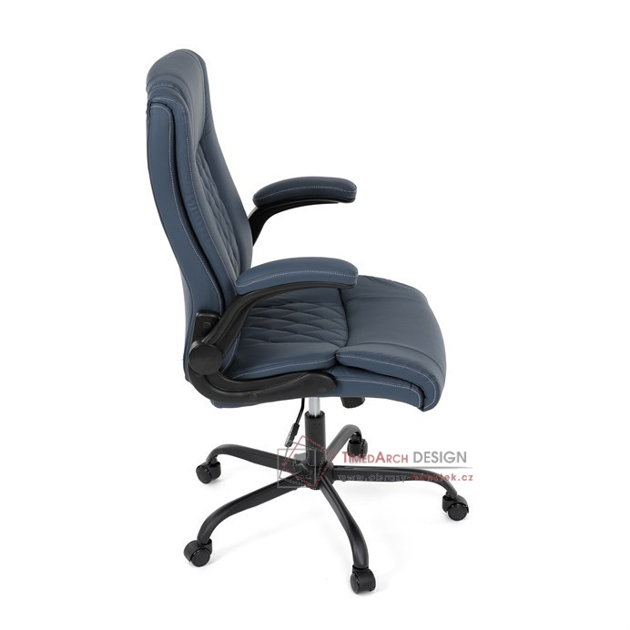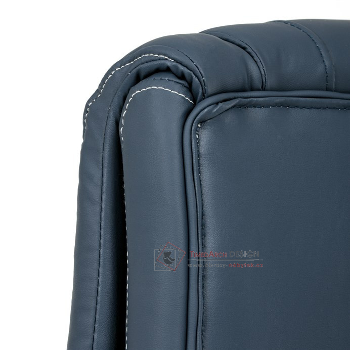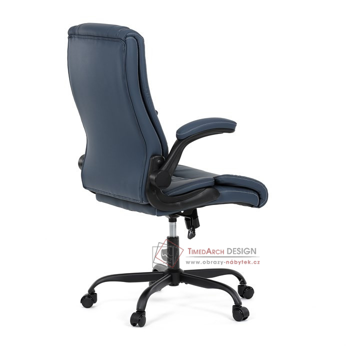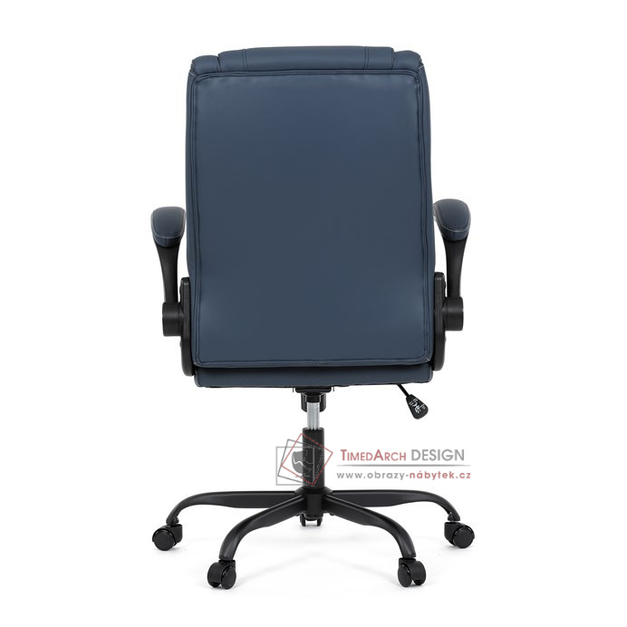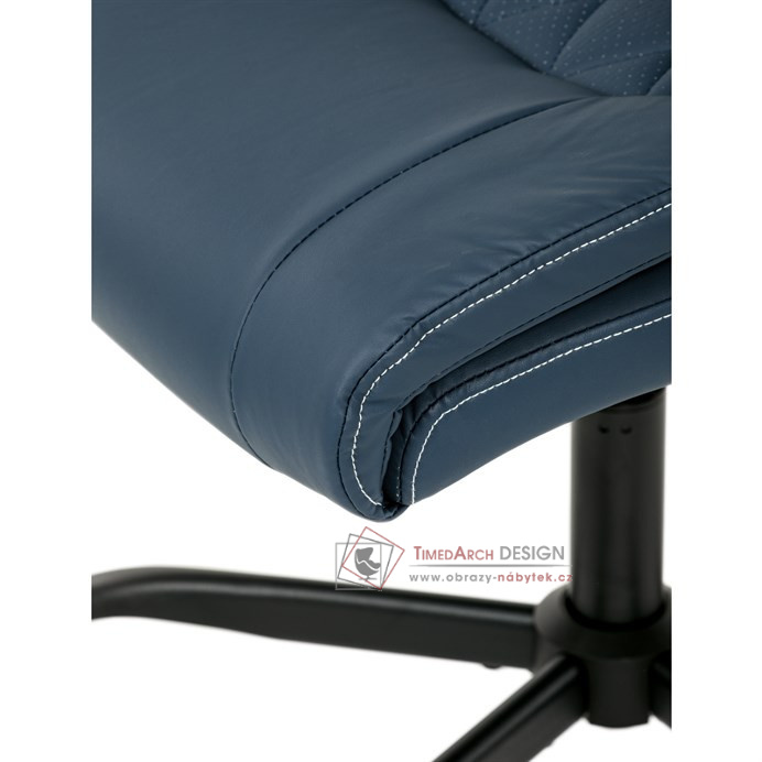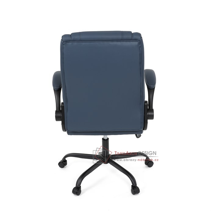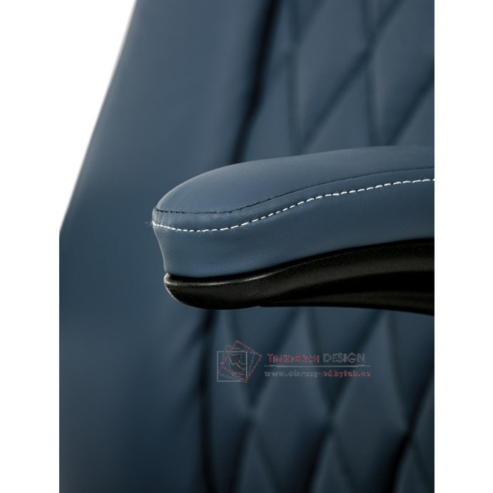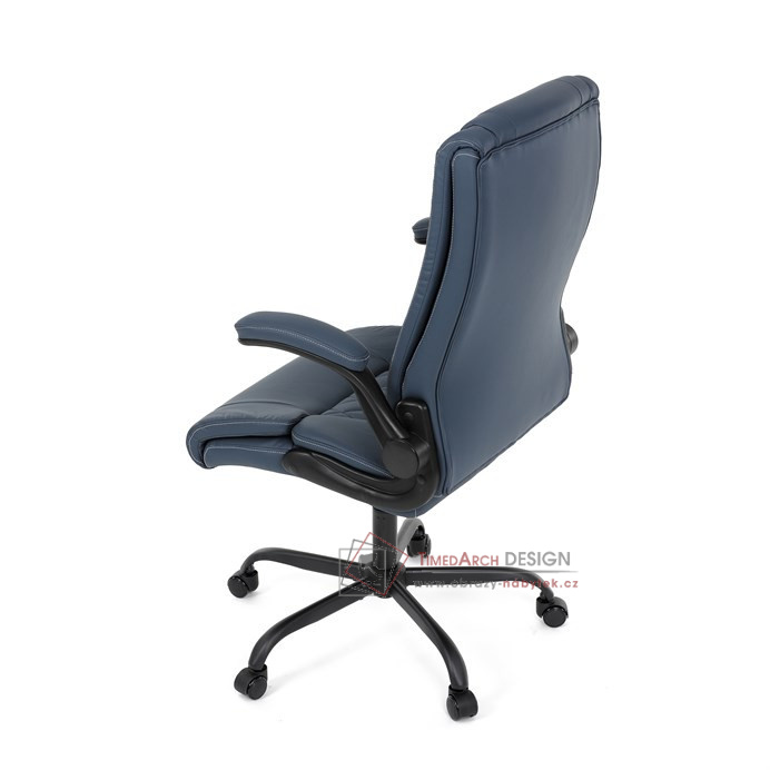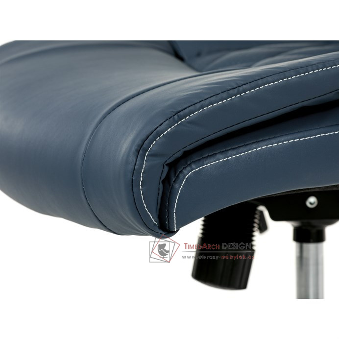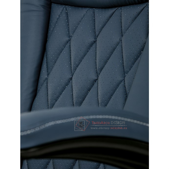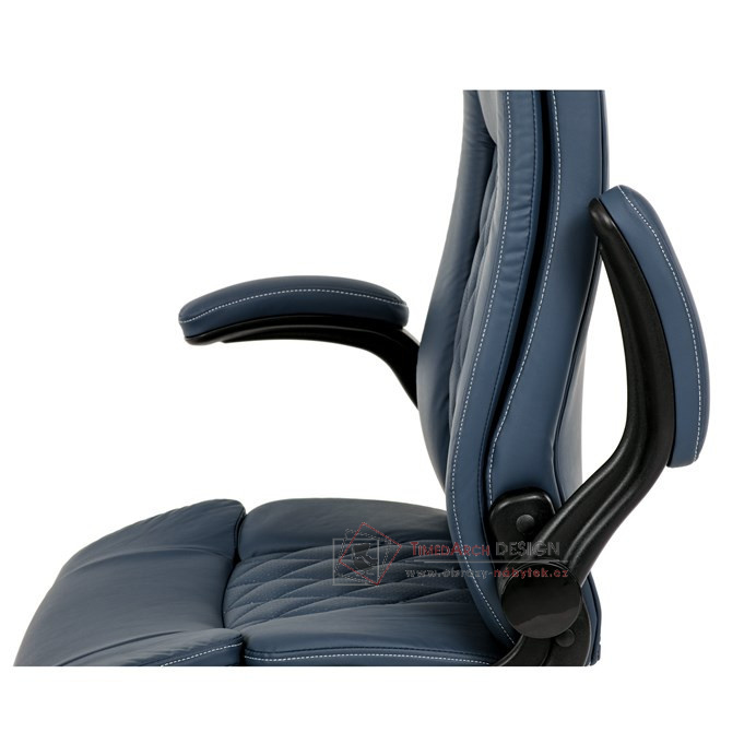 Židle je opatřena houpacím mechanismem a je očalouněna ekokůží modré barvy. Odklápěcí područky. Ozdobné prošití opěráku.