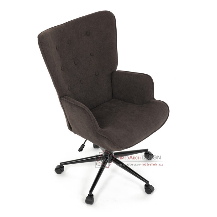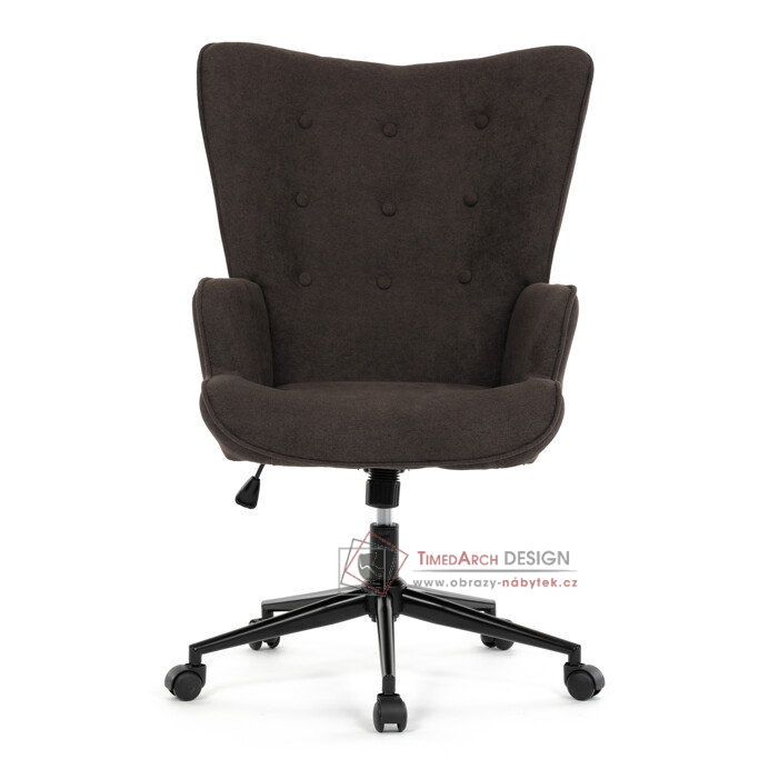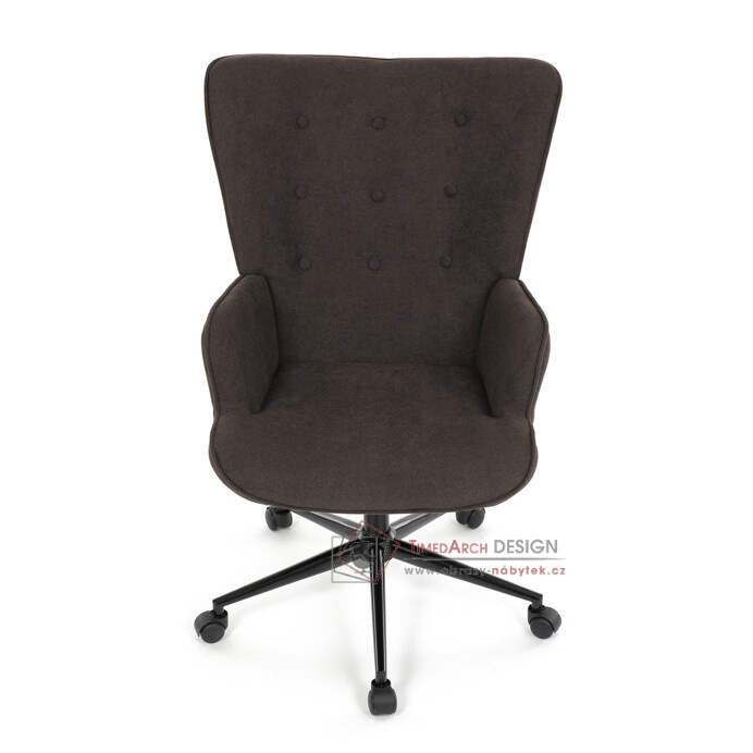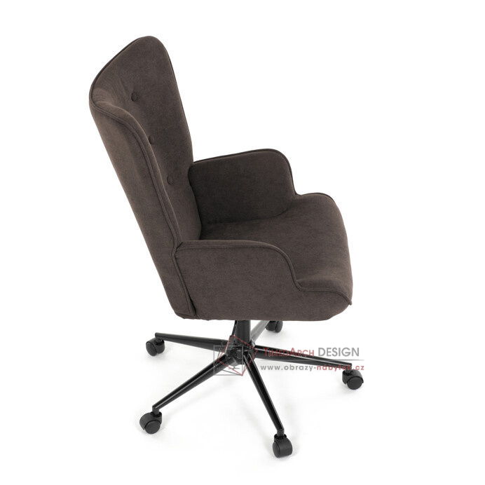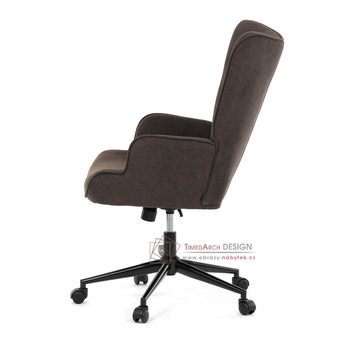 Křeslo je očalouněné látkou tmavě hnědé barvy.