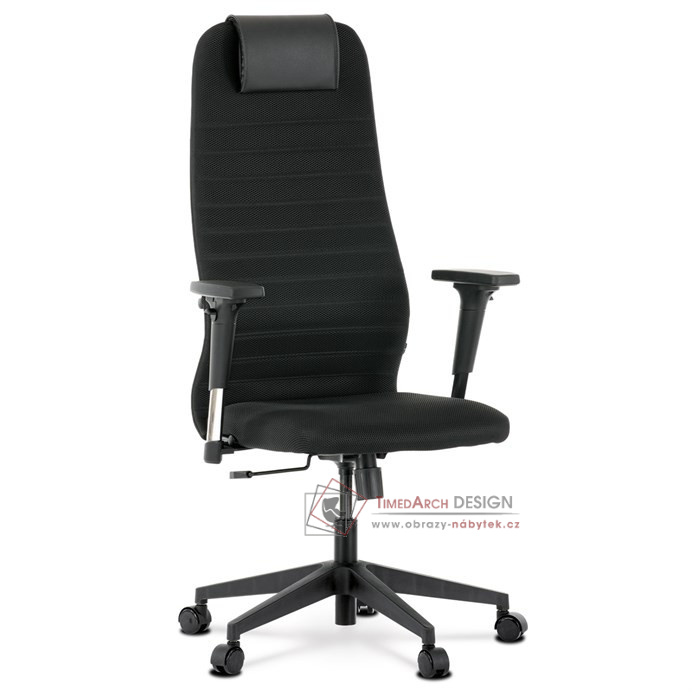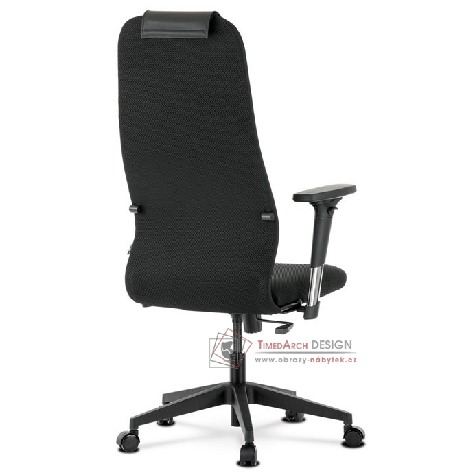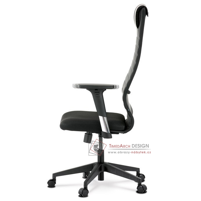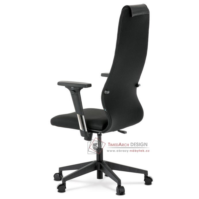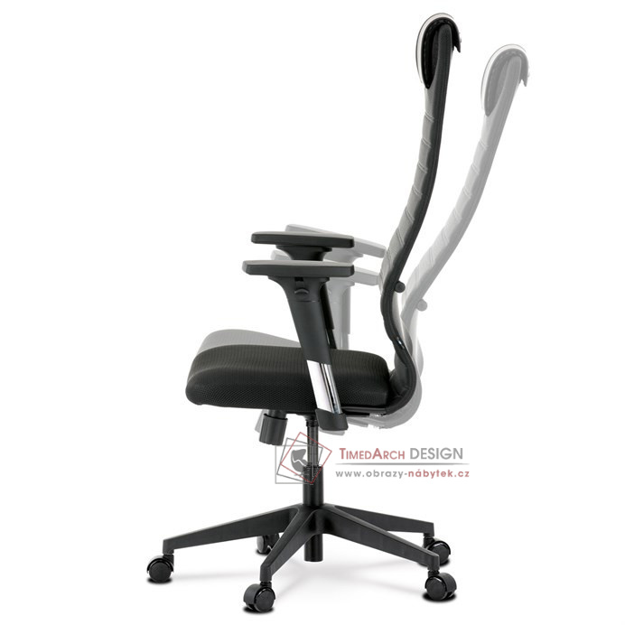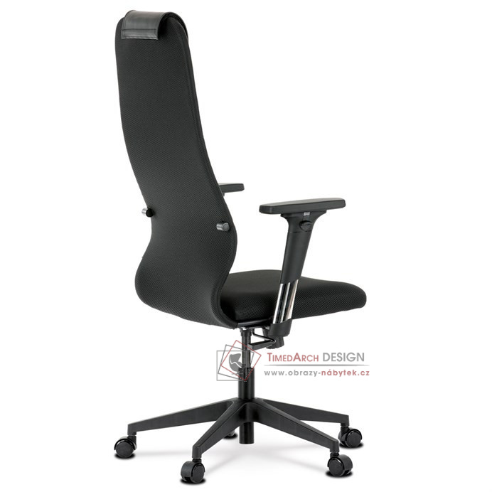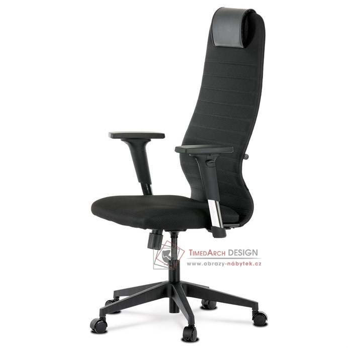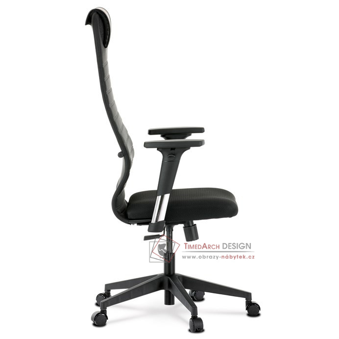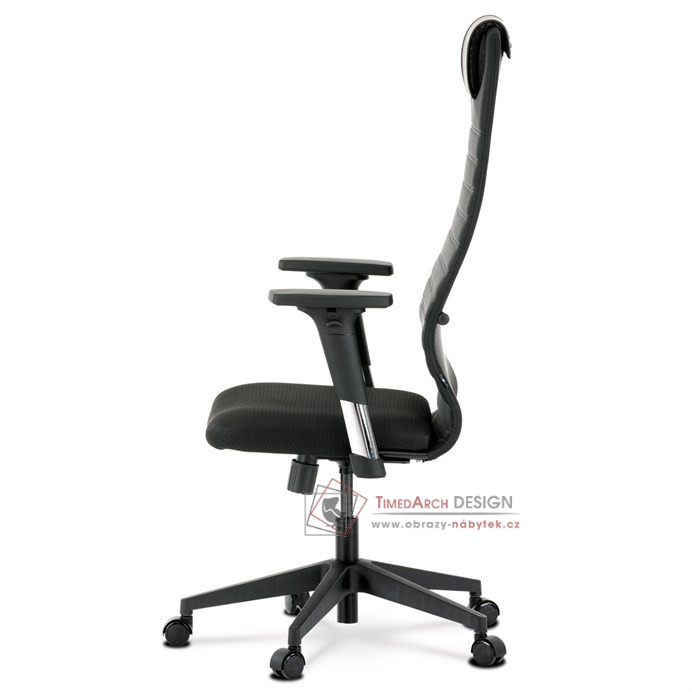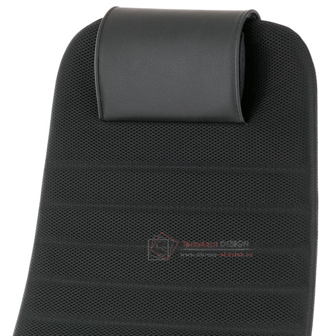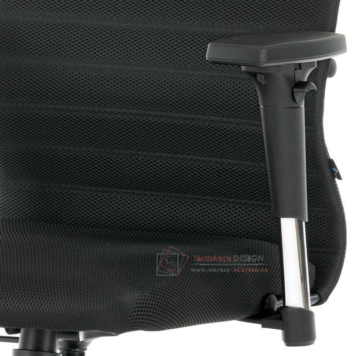 Jedná se o moderní designové křeslo, navržené pro kancelářskou práci s významným zaměřením na maximálním pohodlí a nadstandardní ergonomii sezení. Tou je ergonomický tvar opěráku a sedáku, který přesně odpovídá anatomickému tvaru lidského těla, podporuje a odlehčuje páteř. Dále měkká opěrka hlavy, která poskytuje ideální oporu hlavě, uvolňuje napětí z krku a ramen. Jedinečný tvar přední části sedáku eliminuje mačkání cév nohou při zachování pocitu lehkosti v nich. V neposlední řadě i pevná bederní opěrka pro větší pohodlí a jako bonus možnost nastavení hloubky sedu při montáži. Rám křesla je tvořen z kovového profilu s černým polymerovým povlakem a překližkou. Potah sedáku i opěráku je z odolné černé látky MESH, výplň z vysoce kvalitní PU pěny. Na opěráku v tenké vrstvě, aby umožnila tělu „dýchat“. Hlavová opěrka je z černé ekokůže, vyplněná PU pěnou. Na zadní straně opěráku je uchycena pomocí suchého zipu. Židle je vybavena houpacím mechanismem s nastavením protiváhy a aretací v základní poloze. Tuhost protiváhy lze regulovat velkým plastovým šroubem, umístěným pod sedákem. Výška sezení se upravuje páčkou na pravé straně přes kvalitní plynový píst. Masivní černý plastový kříž o průměru 64 cm je osazen černými kolečky vhodnými na koberce. Područky jsou výškově nastavitelné z černého plastu. Opěrka je měkčená a navíc posuvná vpřed / vzad. Šíře područky je 9 cm, delká 25 cm a výška 3 cm. Nosnost židle je 120 kg