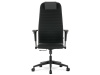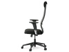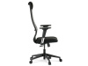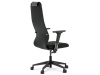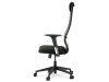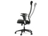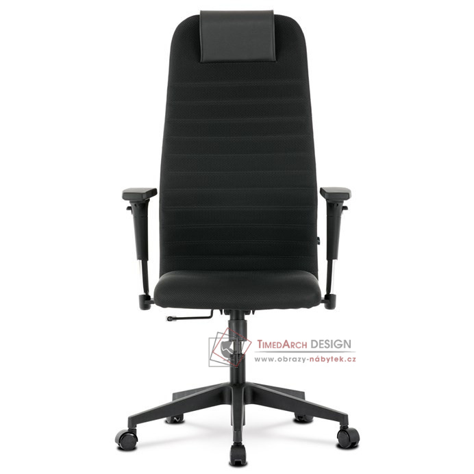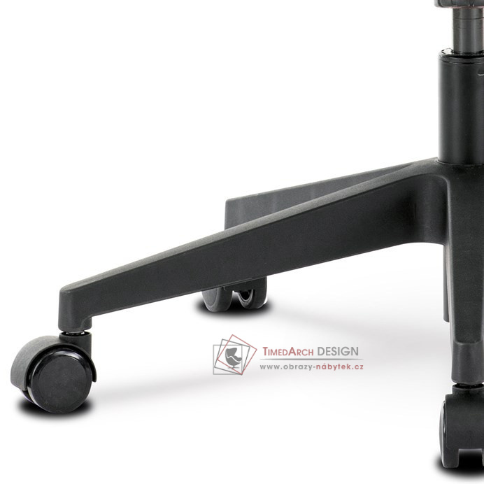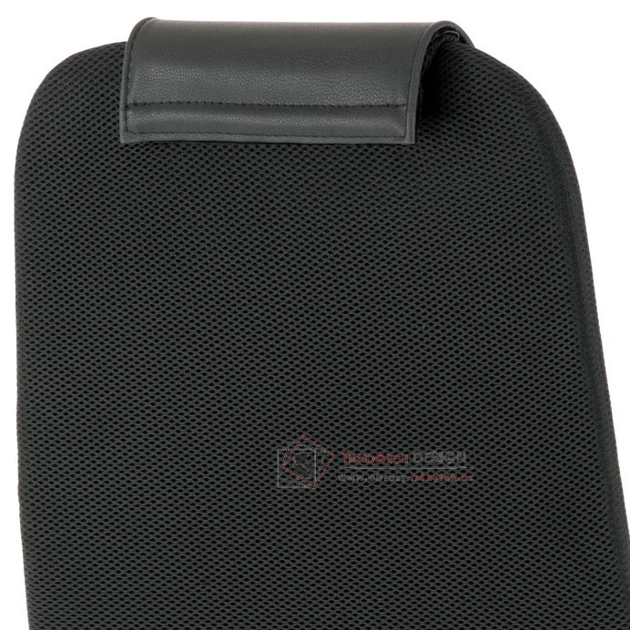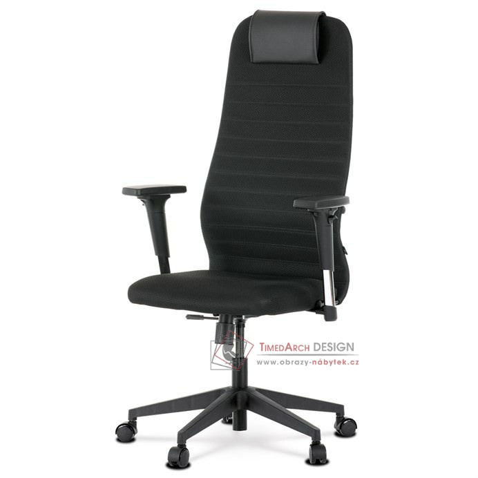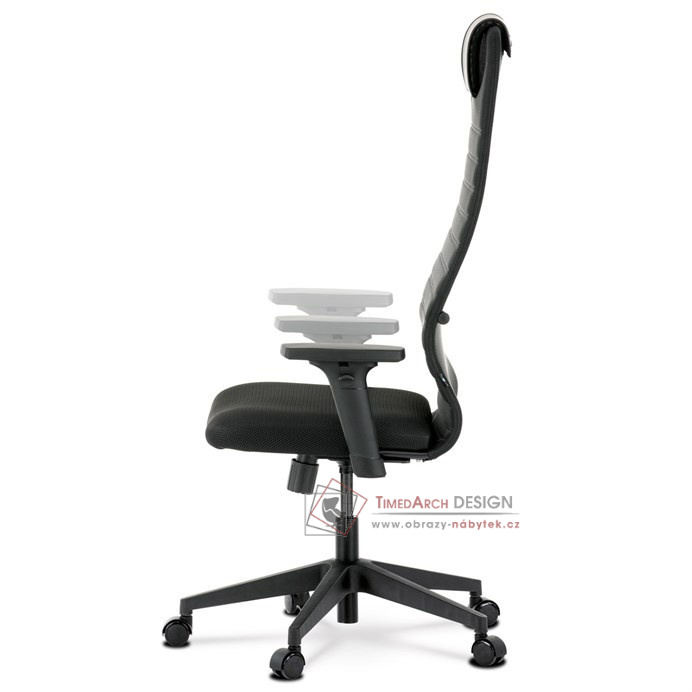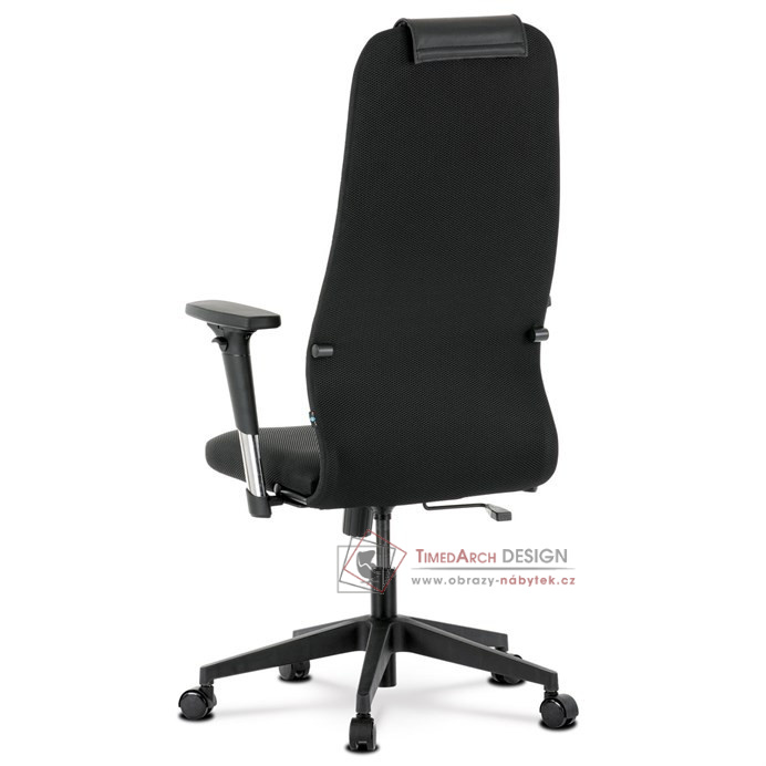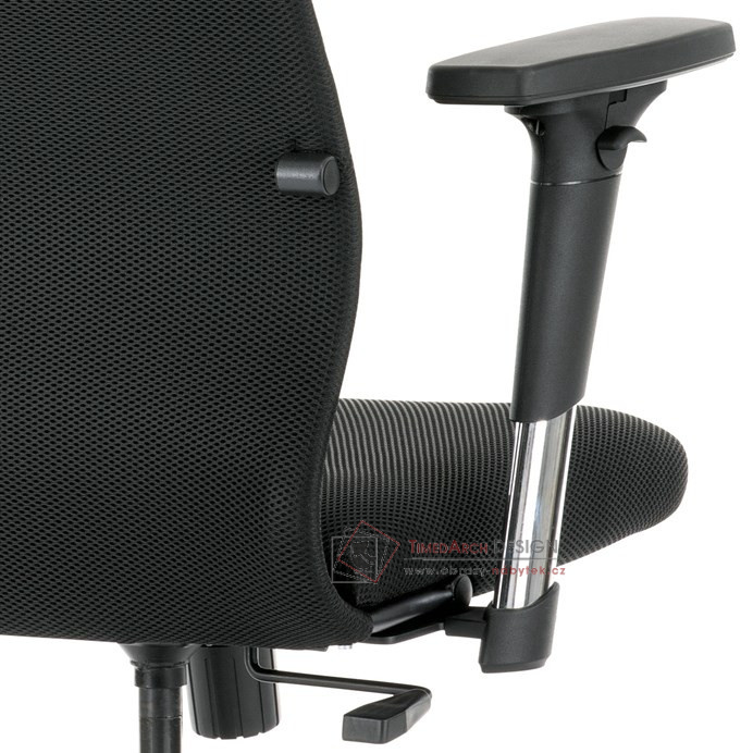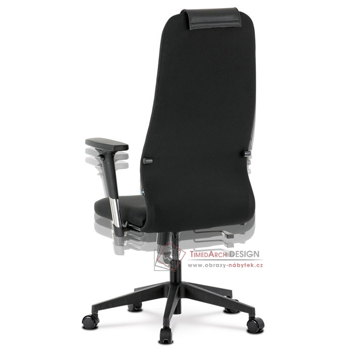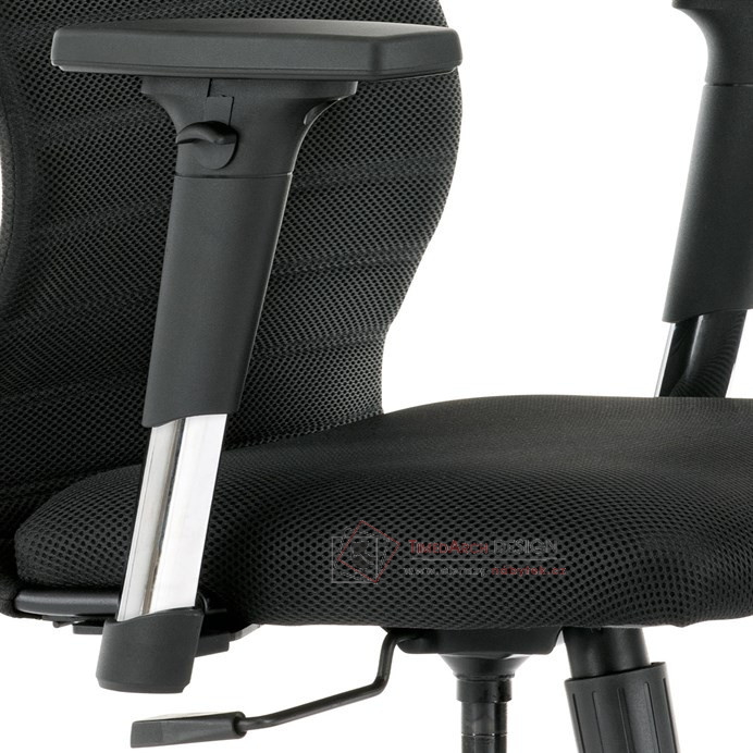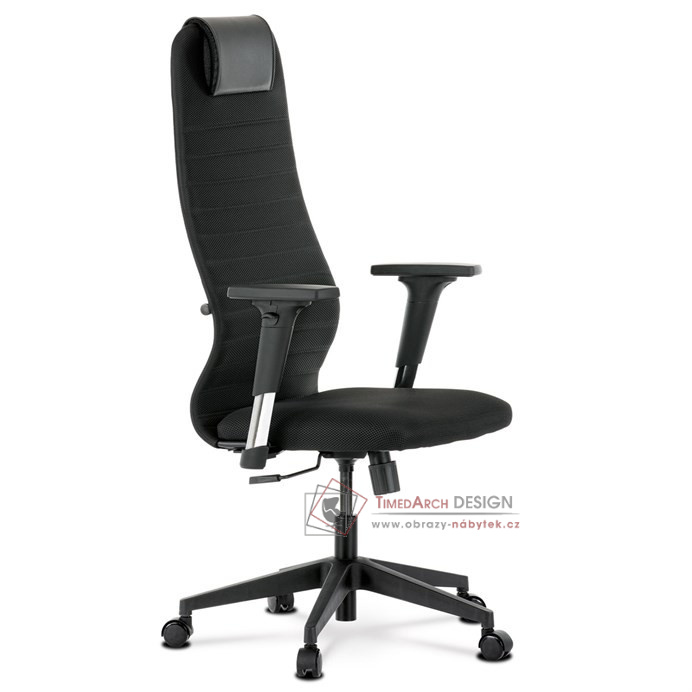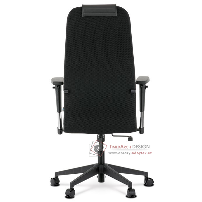 Jedná se o moderní designové křeslo, navržené pro kancelářskou práci s významným zaměřením na maximálním pohodlí a nadstandardní ergonomii sezení. Tou je ergonomický tvar opěráku a sedáku, který přesně odpovídá anatomickému tvaru lidského těla, podporuje a odlehčuje páteř. Dále měkká opěrka hlavy, která poskytuje ideální oporu hlavě, uvolňuje napětí z krku a ramen. Jedinečný tvar přední části sedáku eliminuje mačkání cév nohou při zachování pocitu lehkosti v nich. V neposlední řadě i pevná bederní opěrka pro větší pohodlí a jako bonus možnost nastavení hloubky sedu při montáži. Rám křesla je tvořen z kovového profilu s černým polymerovým povlakem a překližkou. Potah sedáku i opěráku je z odolné černé látky MESH, výplň z vysoce kvalitní PU pěny. Na opěráku v tenké vrstvě, aby umožnila tělu „dýchat“. Hlavová opěrka je z černé ekokůže, vyplněná PU pěnou. Na zadní straně opěráku je uchycena pomocí suchého zipu. Židle je vybavena houpacím mechanismem s nastavením protiváhy a aretací v základní poloze. Tuhost protiváhy lze regulovat velkým plastovým šroubem, umístěným pod sedákem. Výška sezení se upravuje páčkou na pravé straně přes kvalitní plynový píst. Masivní černý plastový kříž o průměru 64 cm je osazen černými kolečky vhodnými na koberce. Područky jsou výškově nastavitelné z černého plastu. Opěrka je měkčená a navíc posuvná vpřed / vzad. Šíře područky je 9 cm, delká 25 cm a výška 3 cm. Nosnost židle je 120 kg