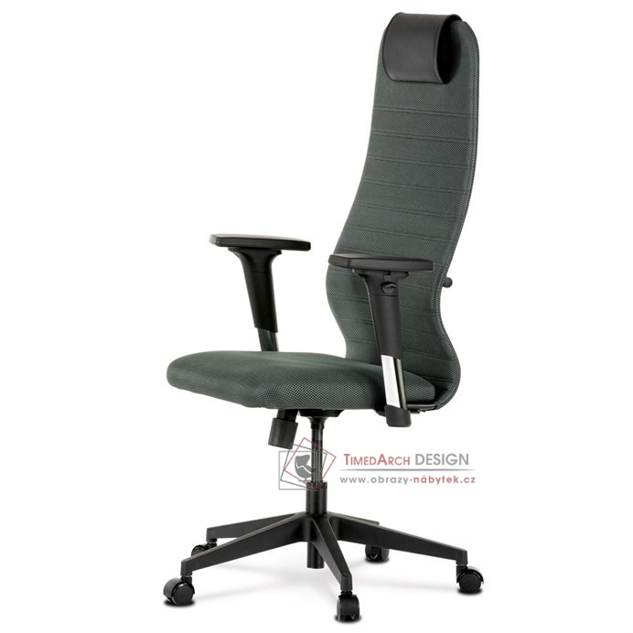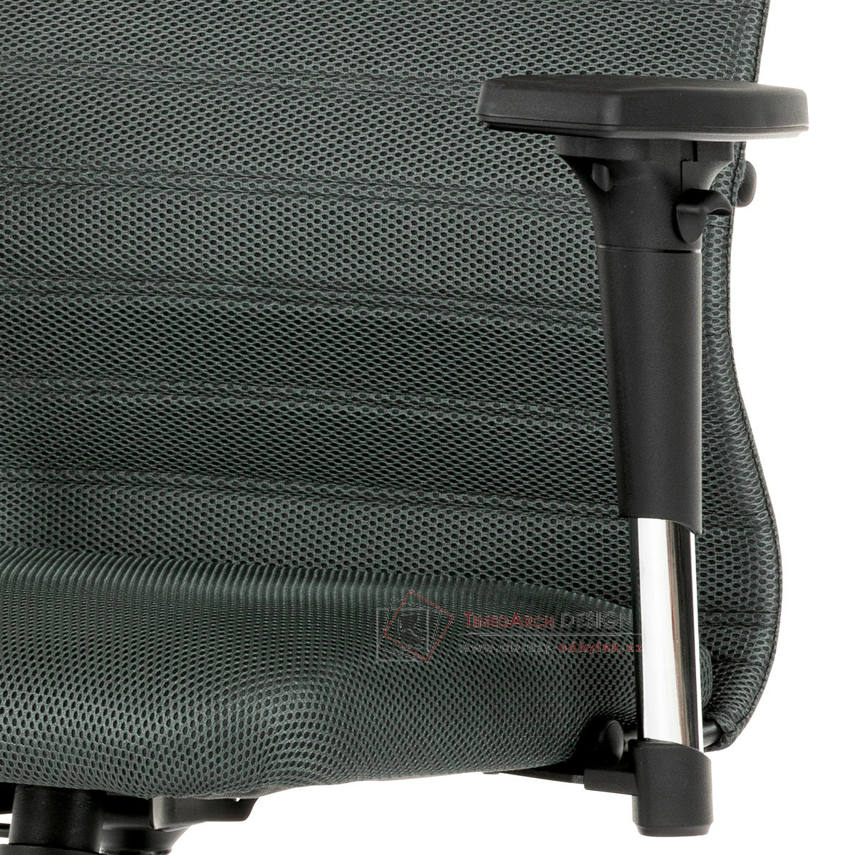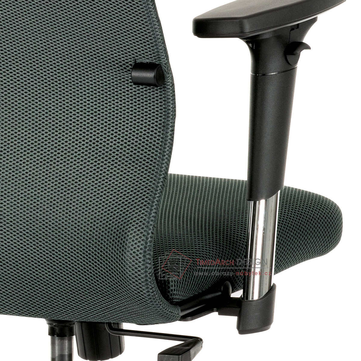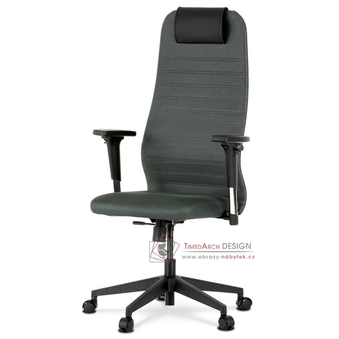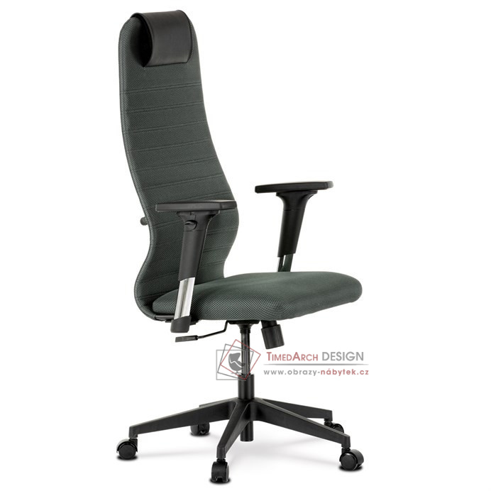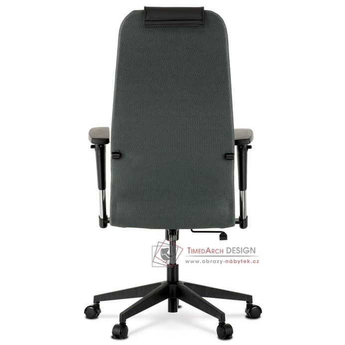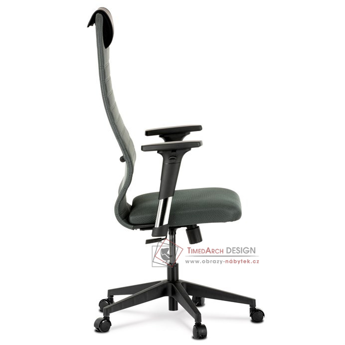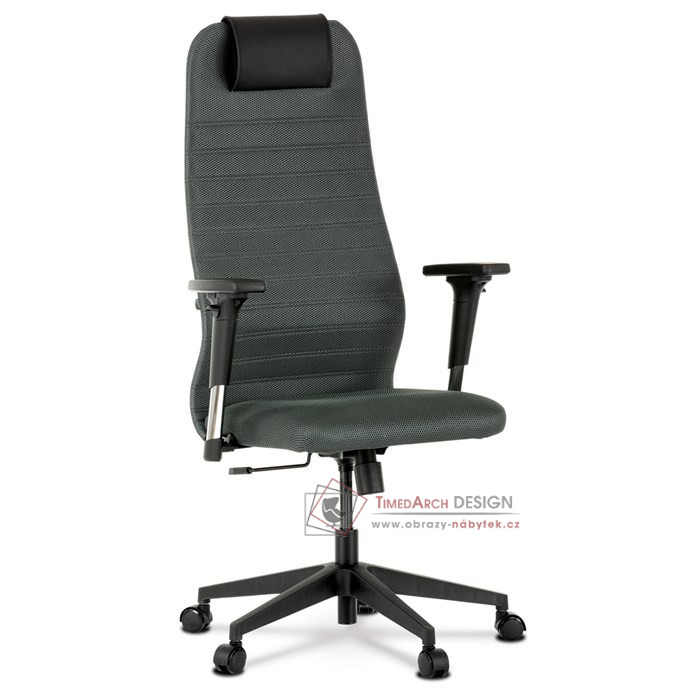 Jedná se o moderní designové křeslo, navržené pro kancelářskou práci s významným zaměřením na maximálním pohodlí a nadstandardní ergonomii sezení. Tou je ergonomický tvar opěráku a sedáku, který přesně odpovídá anatomickému tvaru lidského těla, podporuje a odlehčuje páteř. Dále měkká opěrka hlavy, která poskytuje ideální oporu hlavě, uvolňuje napětí z krku a ramen. Jedinečný tvar přední části sedáku eliminuje mačkání cév nohou při zachování pocitu lehkosti v nich. V neposlední řadě i pevná bederní opěrka pro větší pohodlí a jako bonus možnost nastavení hloubky sedu při montáži. Rám křesla je tvořen z kovového profilu s černým polymerovým povlakem a překližkou. Potah sedáku i opěráku je z odolné tmavě šedé látky MESH, výplň z vysoce kvalitní PU pěny. Na opěráku v tenké vrstvě, aby umožnila tělu „dýchat“. Hlavová opěrka je z černé ekokůže, vyplněná PU pěnou. Na zadní straně opěráku je uchycena pomocí suchého zipu. Židle je vybavena houpacím mechanismem s nastavením protiváhy a aretací v základní poloze. Tuhost protiváhy lze regulovat velkým plastovým šroubem, umístěným pod sedákem. Výška sezení se upravuje páčkou na pravé straně přes kvalitní plynový píst. Masivní černý plastový kříž o průměru 64 cm je osazen černými kolečky vhodnými na koberce. Područky jsou výškově nastavitelné z černého plastu. Opěrka je měkčená a navíc posuvná vpřed / vzad. Šíře područky je 9 cm, delká 25 cm a výška 3 cm. Nosnost židle je 120 kg.