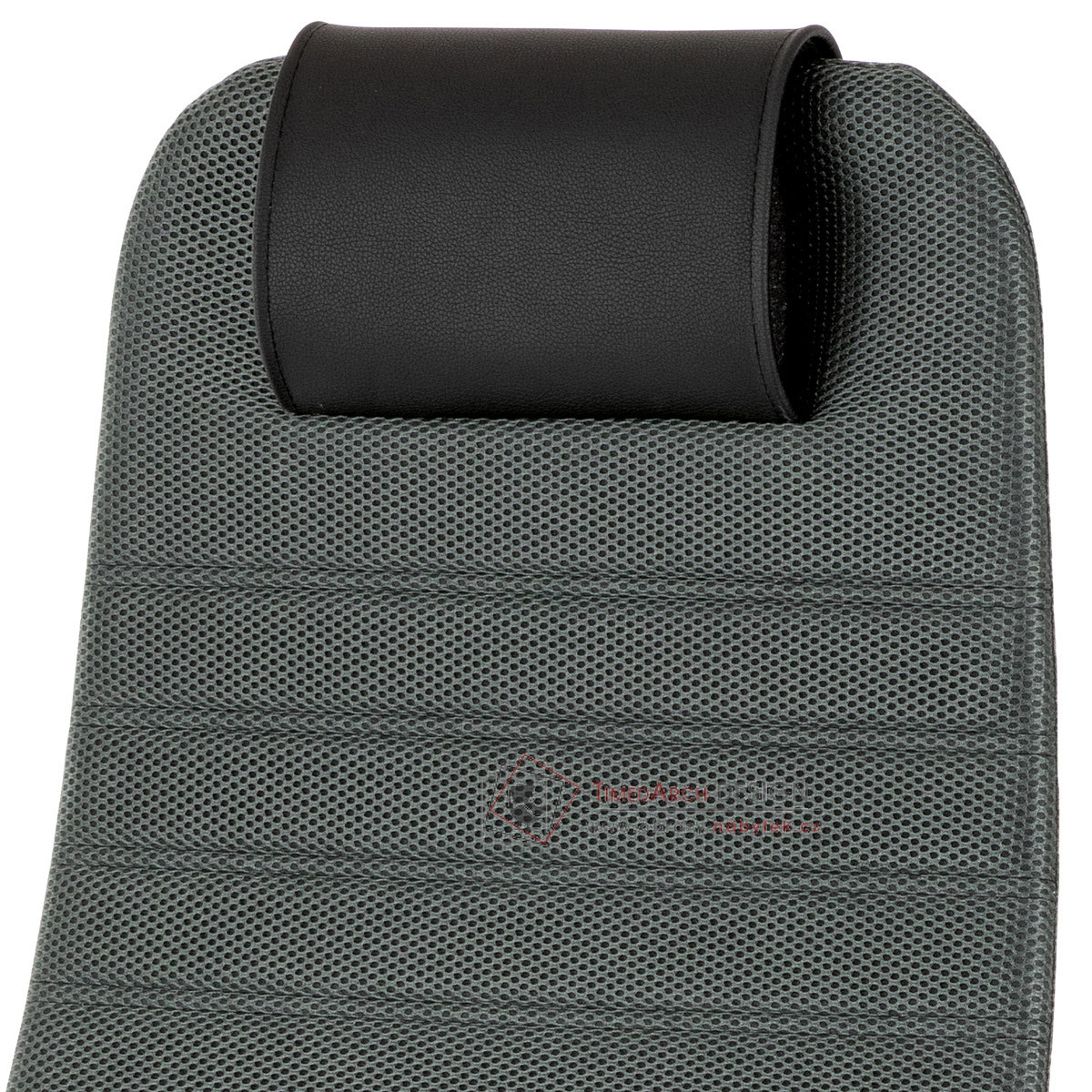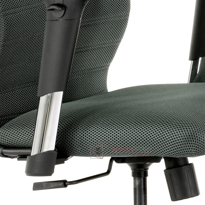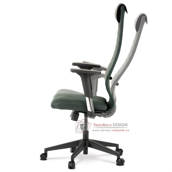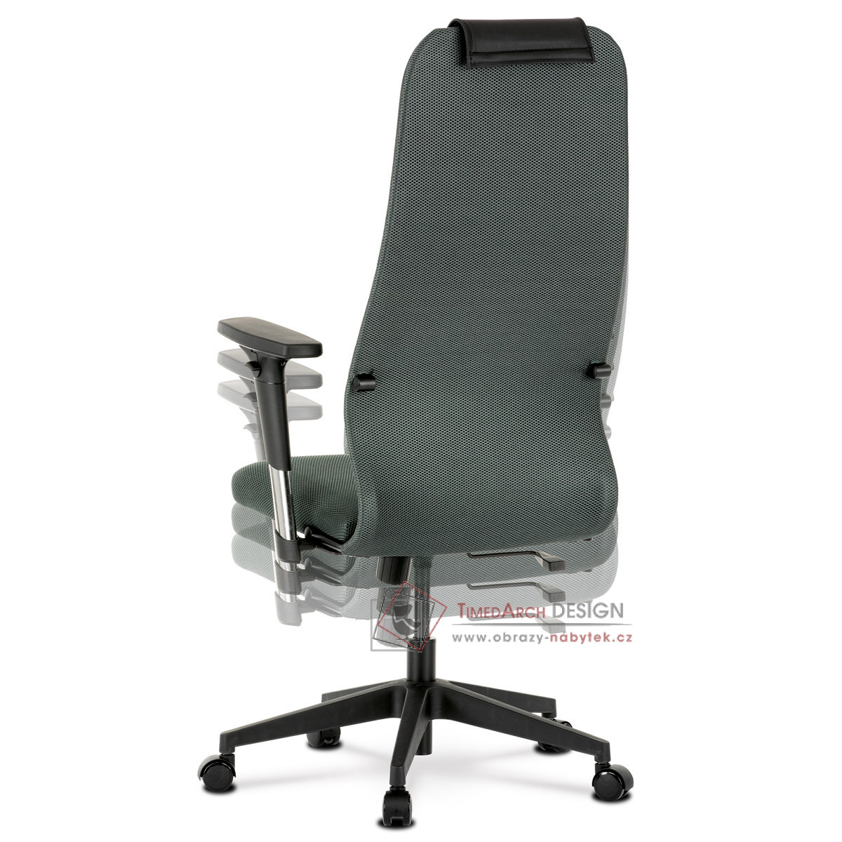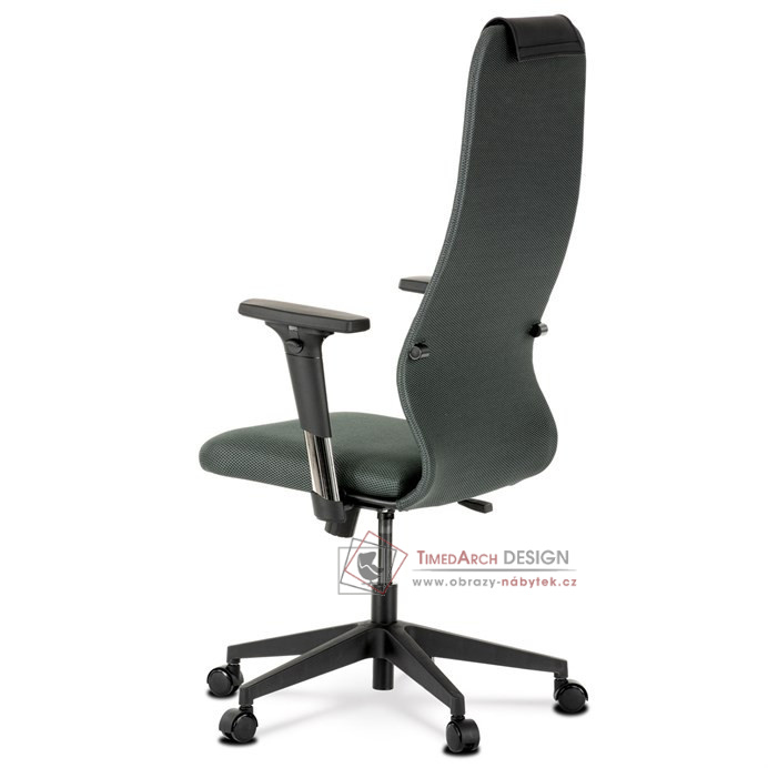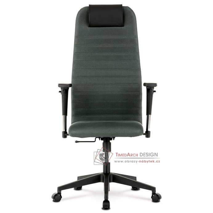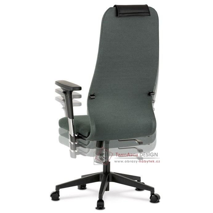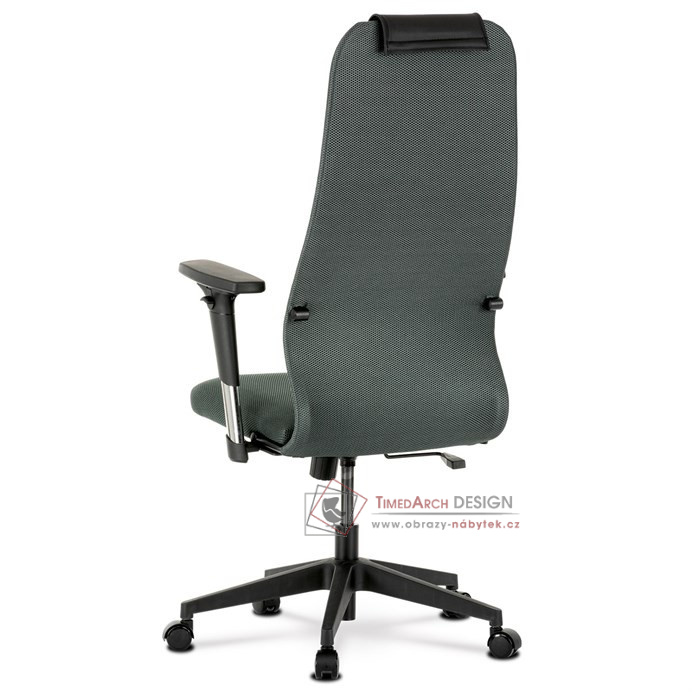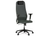 Jedná se o moderní designové křeslo, navržené pro kancelářskou práci s významným zaměřením na maximálním pohodlí a nadstandardní ergonomii sezení. Tou je ergonomický tvar opěráku a sedáku, který přesně odpovídá anatomickému tvaru lidského těla, podporuje a odlehčuje páteř. Dále měkká opěrka hlavy, která poskytuje ideální oporu hlavě, uvolňuje napětí z krku a ramen. Jedinečný tvar přední části sedáku eliminuje mačkání cév nohou při zachování pocitu lehkosti v nich. V neposlední řadě i pevná bederní opěrka pro větší pohodlí a jako bonus možnost nastavení hloubky sedu při montáži. Rám křesla je tvořen z kovového profilu s černým polymerovým povlakem a překližkou. Potah sedáku i opěráku je z odolné tmavě šedé látky MESH, výplň z vysoce kvalitní PU pěny. Na opěráku v tenké vrstvě, aby umožnila tělu „dýchat“. Hlavová opěrka je z černé ekokůže, vyplněná PU pěnou. Na zadní straně opěráku je uchycena pomocí suchého zipu. Židle je vybavena houpacím mechanismem s nastavením protiváhy a aretací v základní poloze. Tuhost protiváhy lze regulovat velkým plastovým šroubem, umístěným pod sedákem. Výška sezení se upravuje páčkou na pravé straně přes kvalitní plynový píst. Masivní černý plastový kříž o průměru 64 cm je osazen černými kolečky vhodnými na koberce. Područky jsou výškově nastavitelné z černého plastu. Opěrka je měkčená a navíc posuvná vpřed / vzad. Šíře područky je 9 cm, delká 25 cm a výška 3 cm. Nosnost židle je 120 kg.