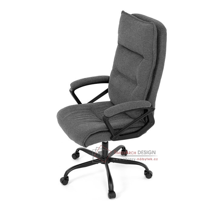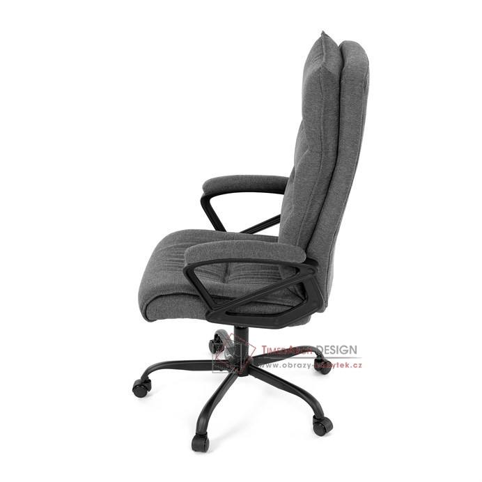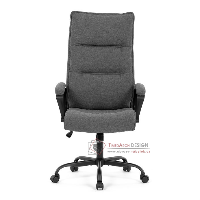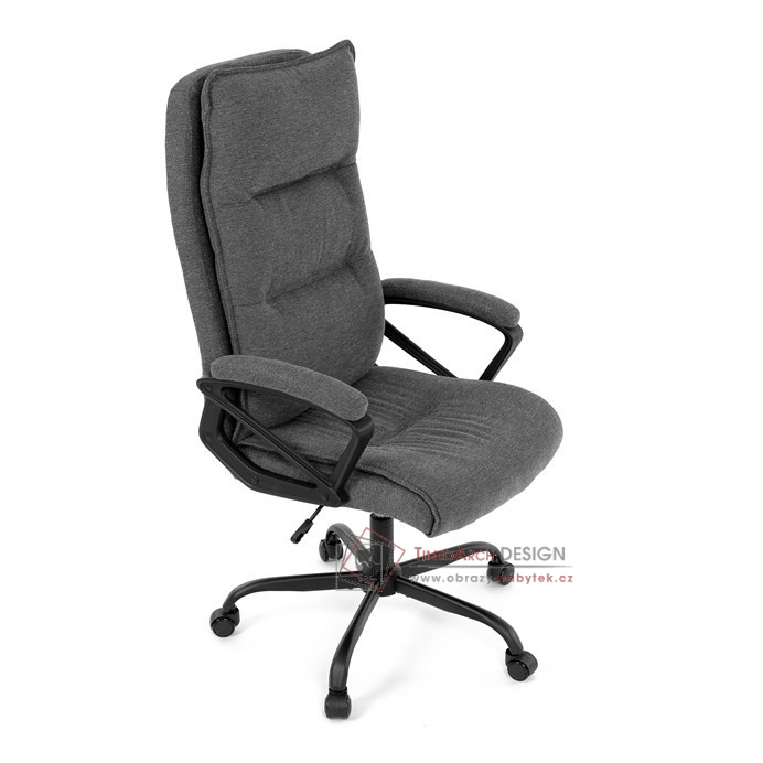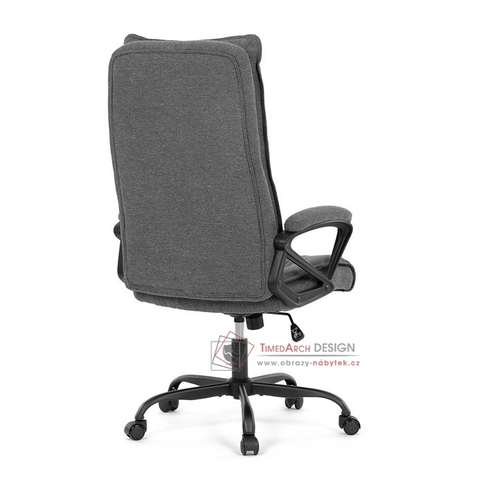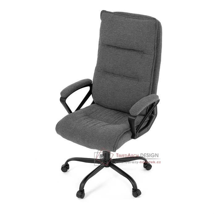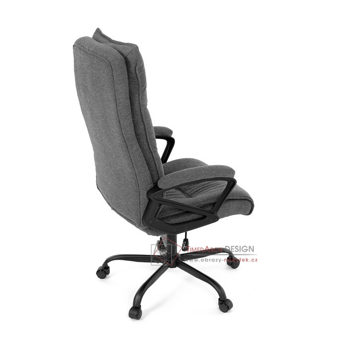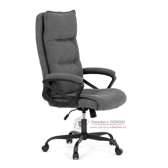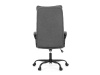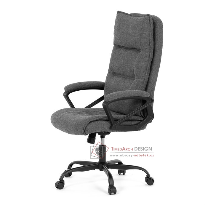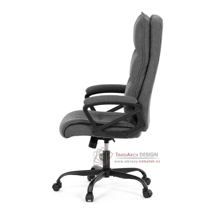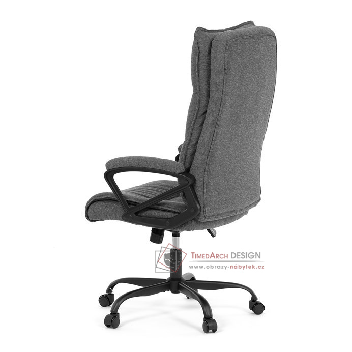 Sedák a opěrák židle je očalouněný látkou barvy šedé. Kolečka na tvrdé podlahy. Čalouněné područky.