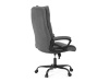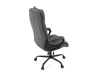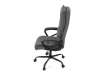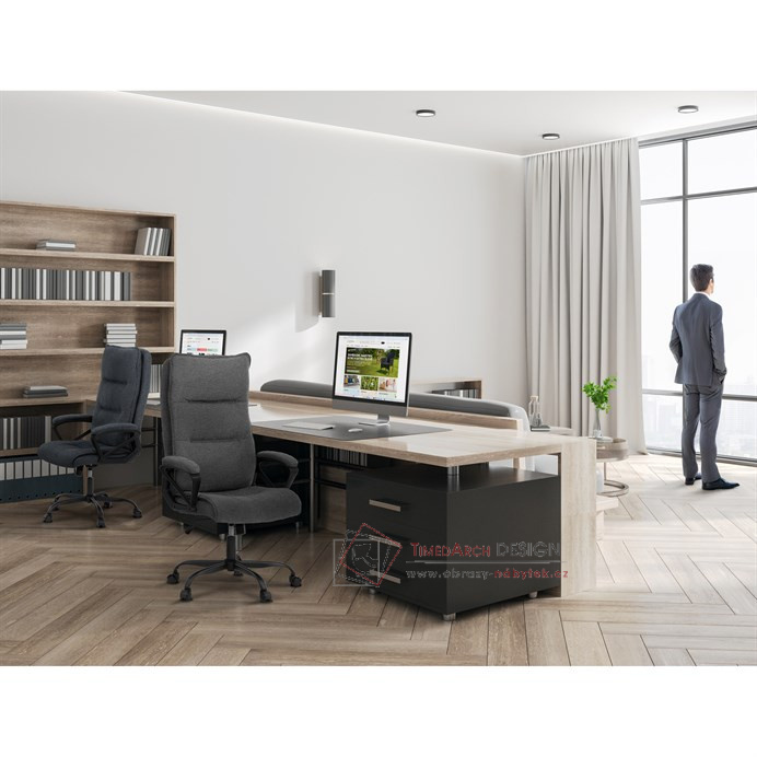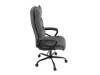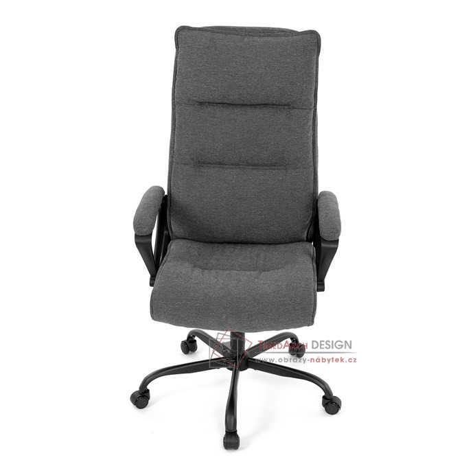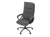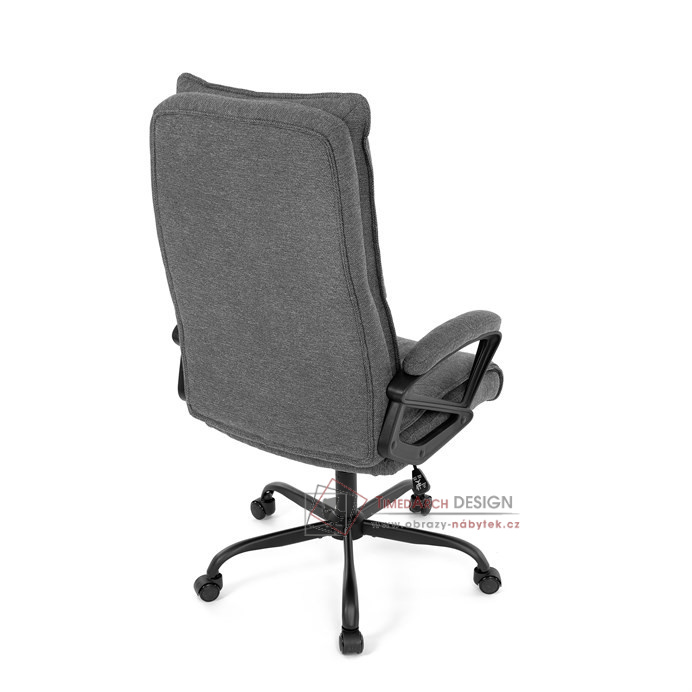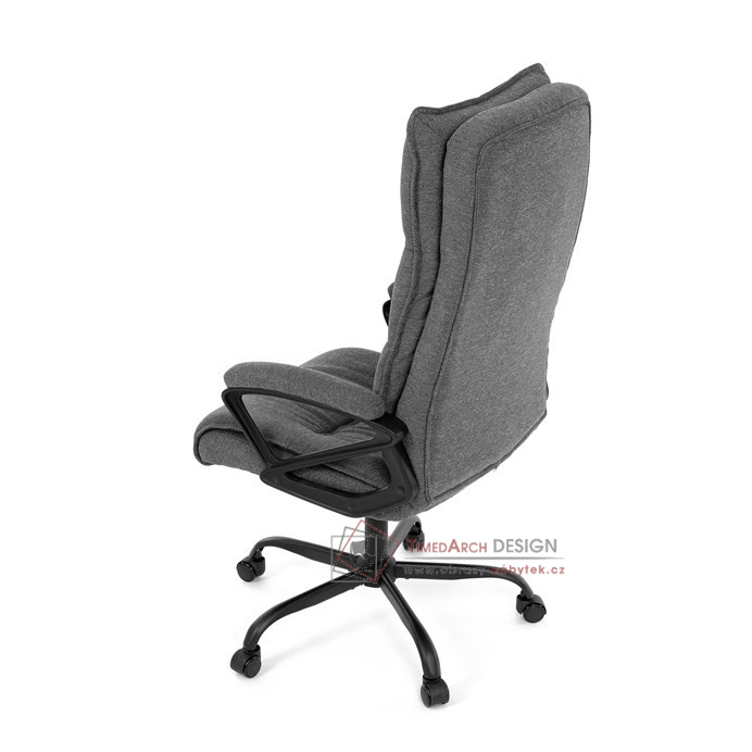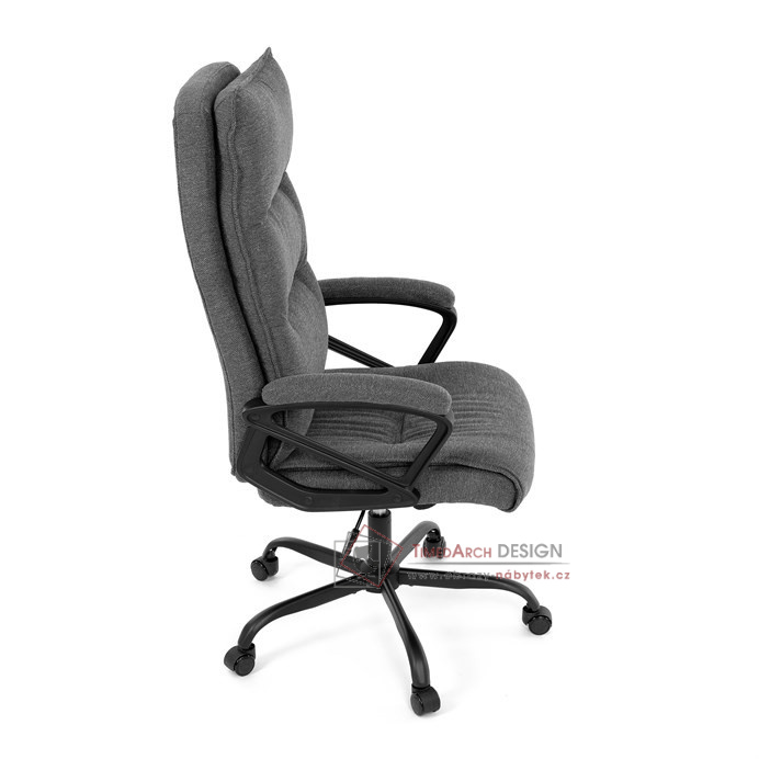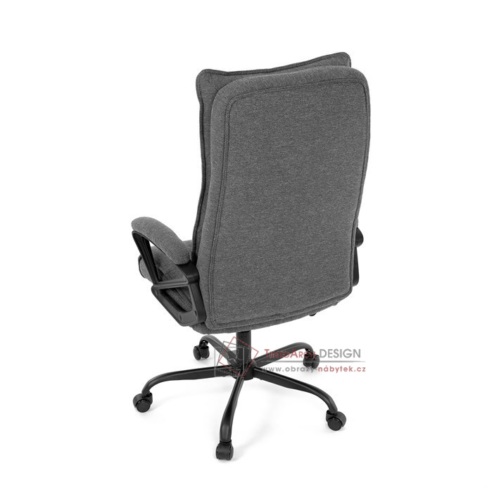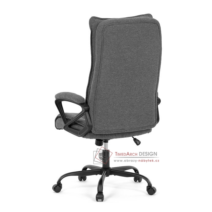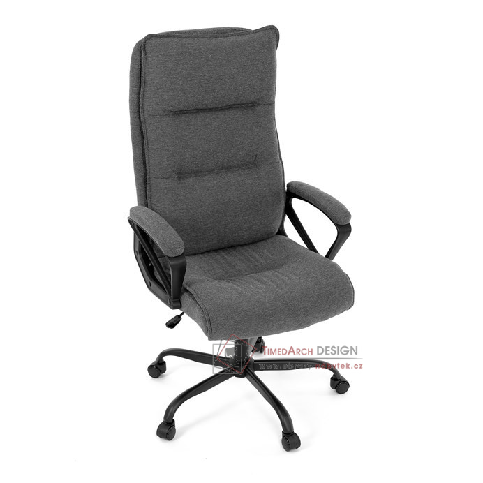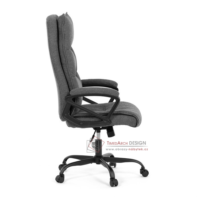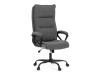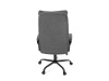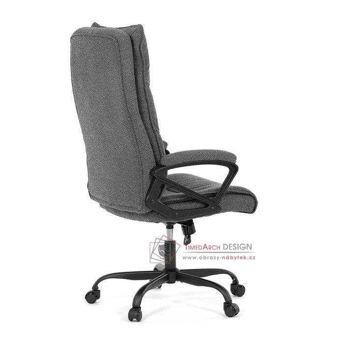 Sedák a opěrák židle je očalouněný látkou barvy šedé. Kolečka na tvrdé podlahy. Čalouněné područky.