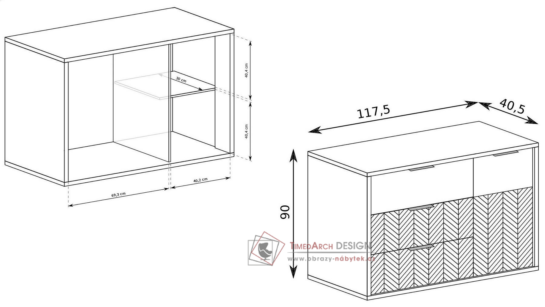 Kolekce KERBIS ve stylu moderní elegance. Charakteristickým znakem nábytku je jeho stylové a elegantní zdobení na přední části ve vzoru rybí kosti.