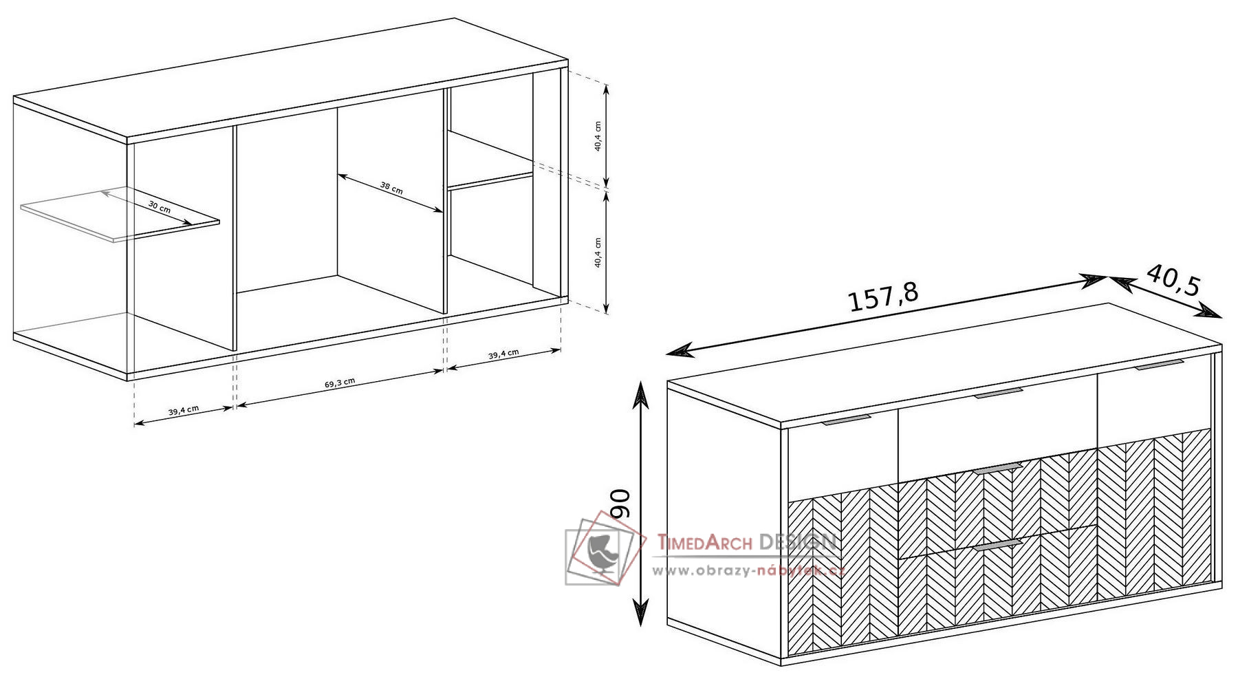 Kolekce KERBIS ve stylu moderní elegance. Charakteristickým znakem nábytku je jeho stylové a elegantní zdobení na přední části ve vzoru rybí kosti.