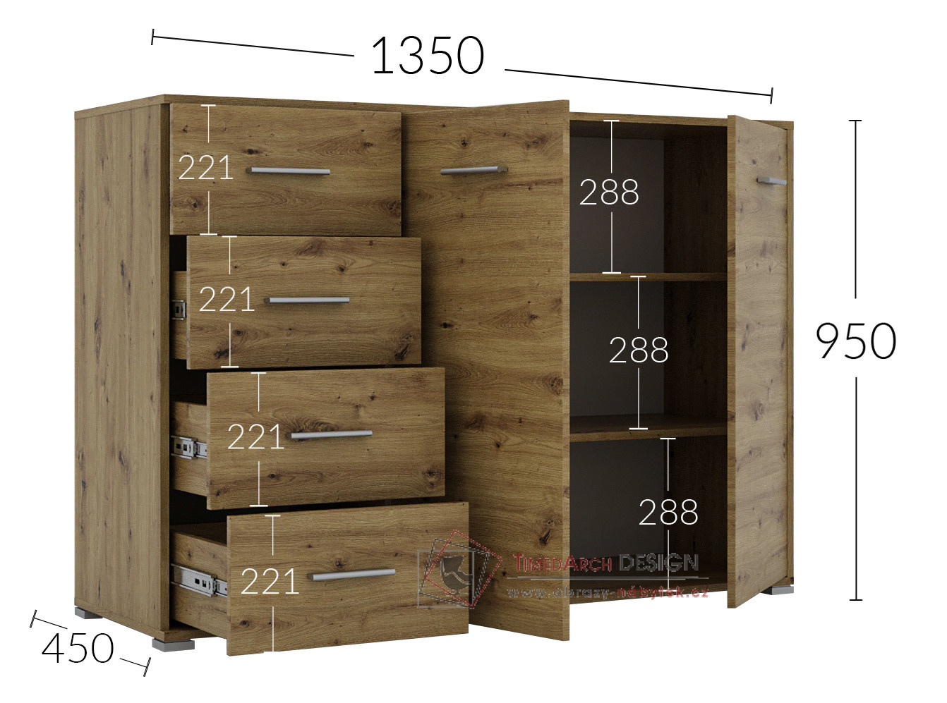 Komoda dvoudveřová se čtyřmi zásuvkami EMONAK je vyrobená z kvalitní laminované DTD v barevném provedení bílý mat (nymfea alba).