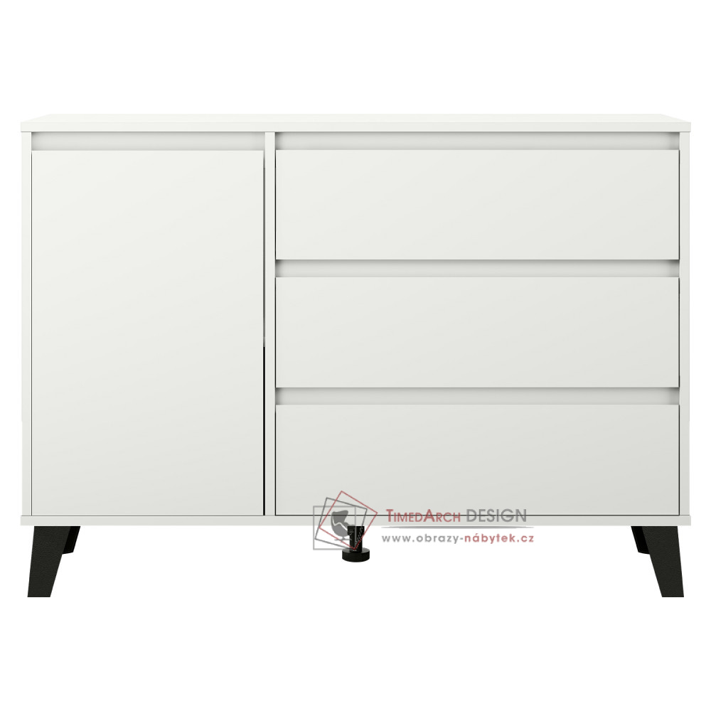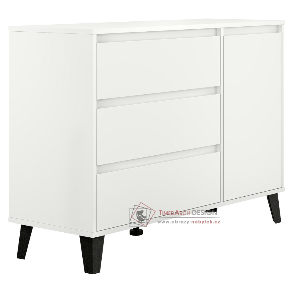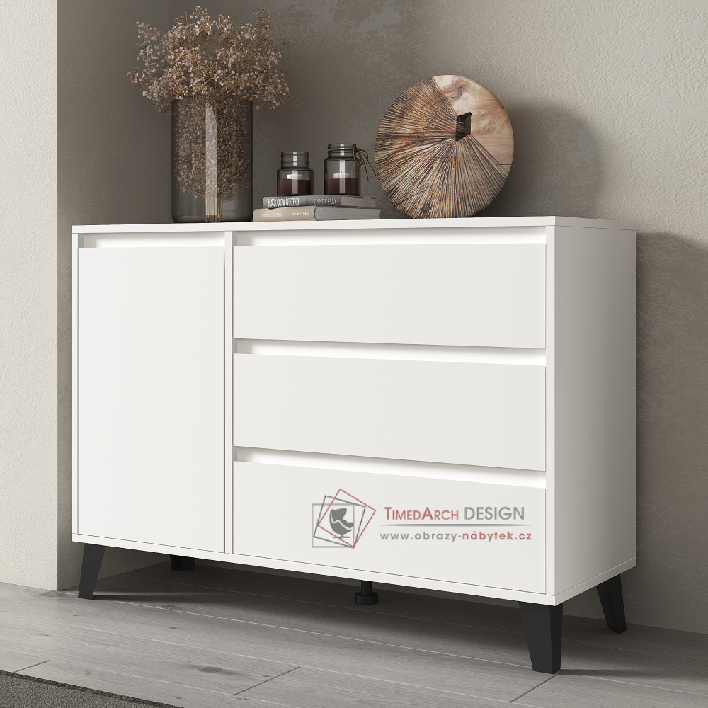 Ideální pro zařízení obývacích pokojů, ložnic, studentských pokojů, dětských pokojů, síní nebo jídelen. Vyrobena v nadčasovém designu z laminované dřevotřísky v bílém provedení. Komoda BOGAN NEW 1D3S je univerzální, nabízí úložný prostor v podobě tří šuplíků a dvířek, které s lehkostí otevřete pomocí jednoduchých zafrézovaných žlábků ve dvířkách. Na stylovém vzhledu se podepisují černé nožičky.
