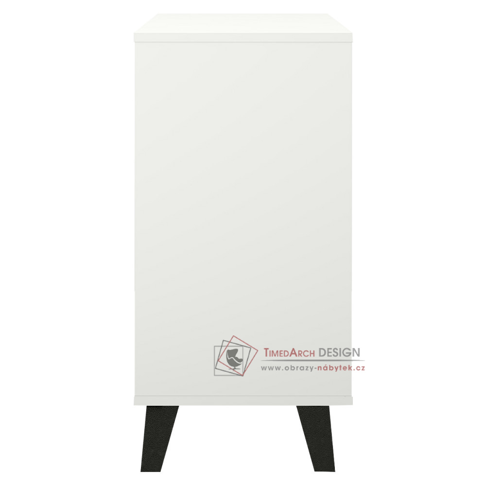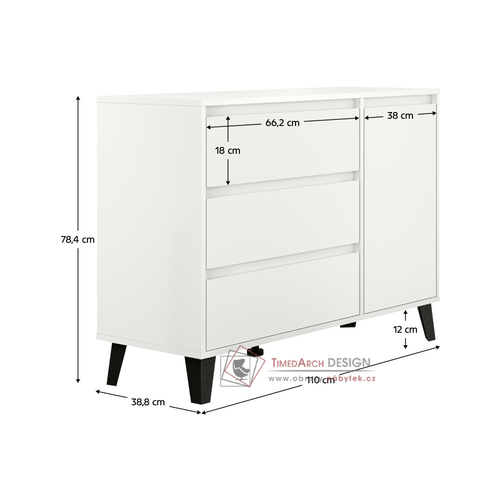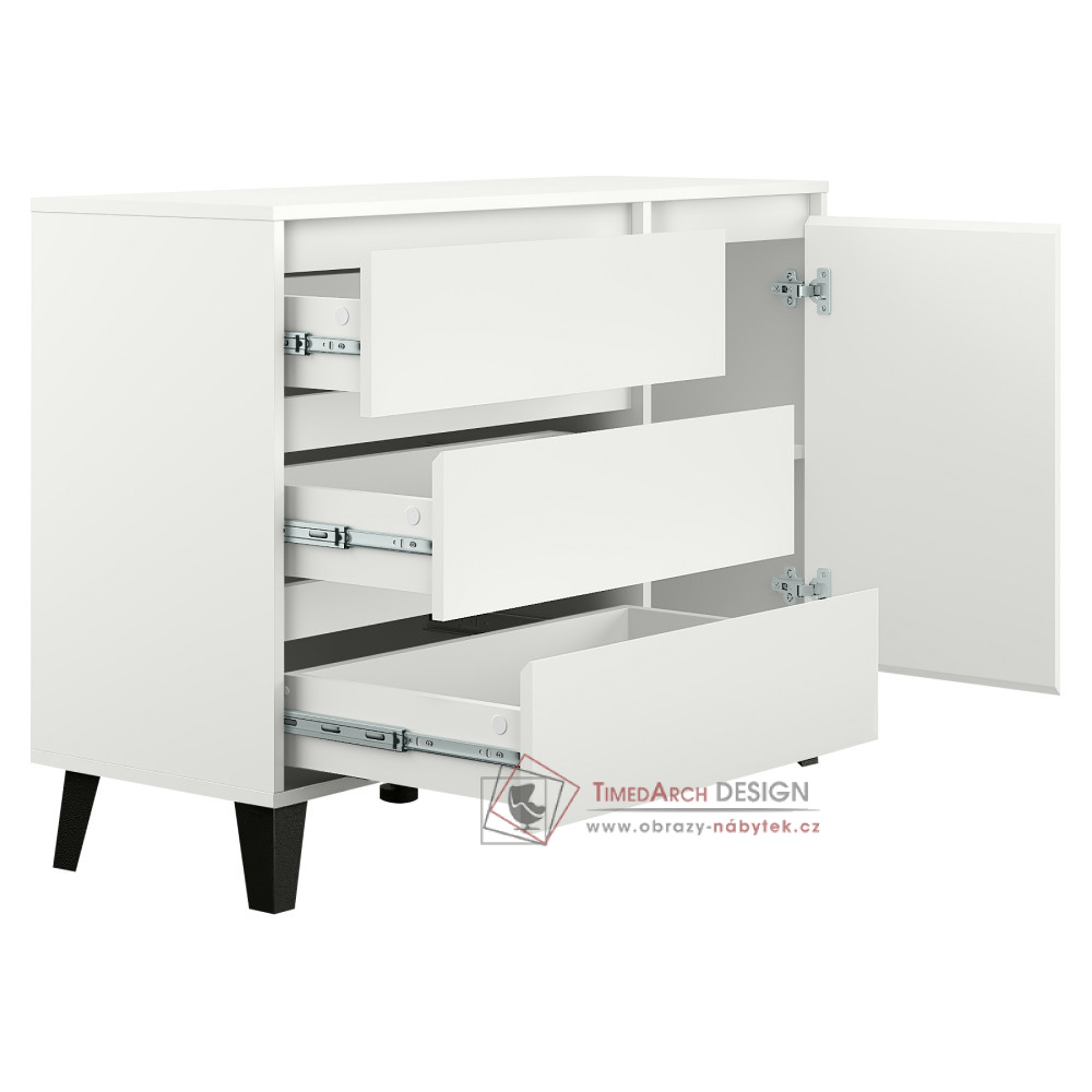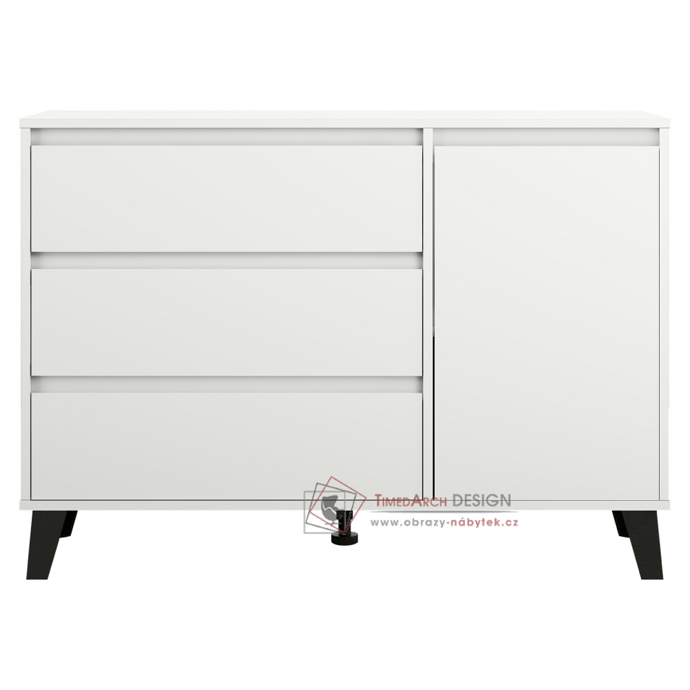 Ideální pro zařízení obývacích pokojů, ložnic, studentských pokojů, dětských pokojů, síní nebo jídelen. Vyrobena v nadčasovém designu z laminované dřevotřísky v bílém provedení. Komoda BOGAN NEW 1D3S je univerzální, nabízí úložný prostor v podobě tří šuplíků a dvířek, které s lehkostí otevřete pomocí jednoduchých zafrézovaných žlábků ve dvířkách. Na stylovém vzhledu se podepisují černé nožičky.