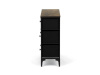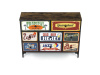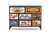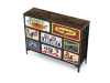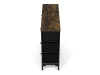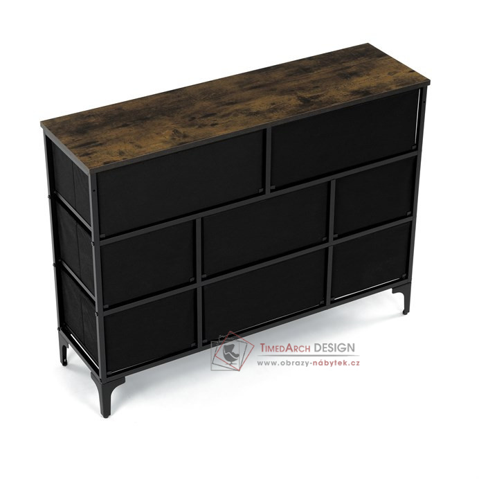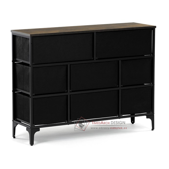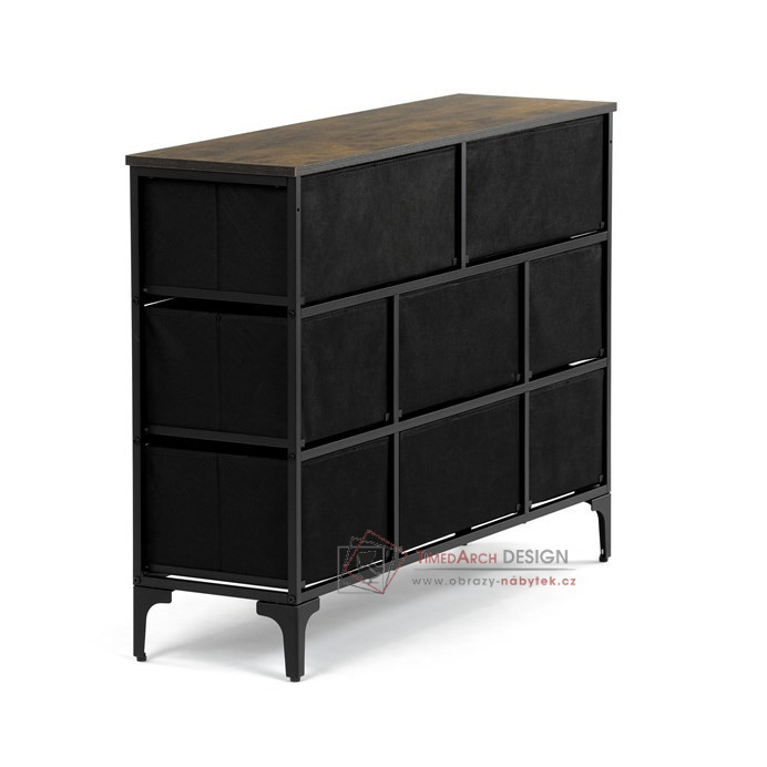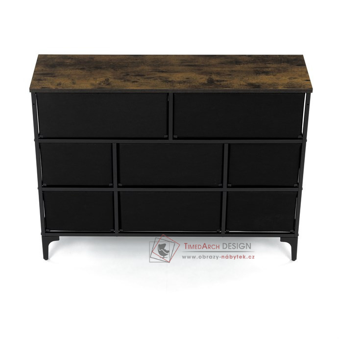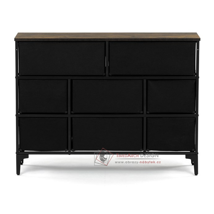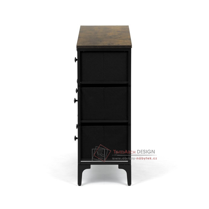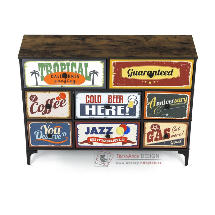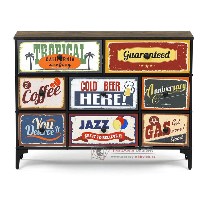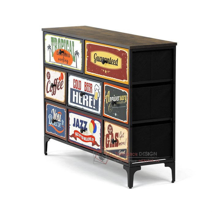 Textilní čela zásuvek s výplní HDF a vintage potiskem navozují atmosféru starých amerických barů a jazzových klubů. Kombinace černé kovové konstrukce, desky v dekoru starého dřeva a zdobných noh dodává nábytku robustní, ale zároveň elegantní vzhled. Korpus zásuvek je vyroben z netkané textilie s výplní HDF, což zajišťuje jejich lehkost a snadnou manipulaci. Ideální doplněk do obývacího pokoje nebo stylové kavárny, kde se stane nepřehlédnutelným prvkem.