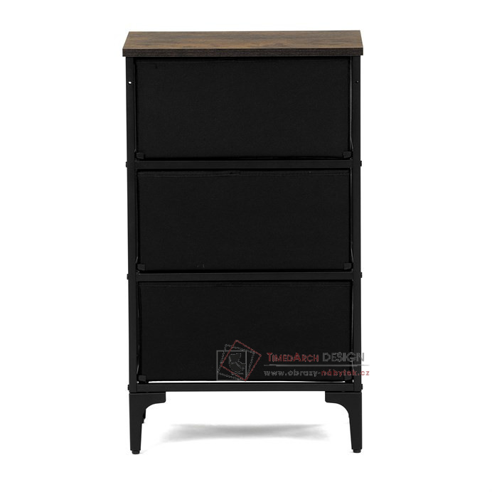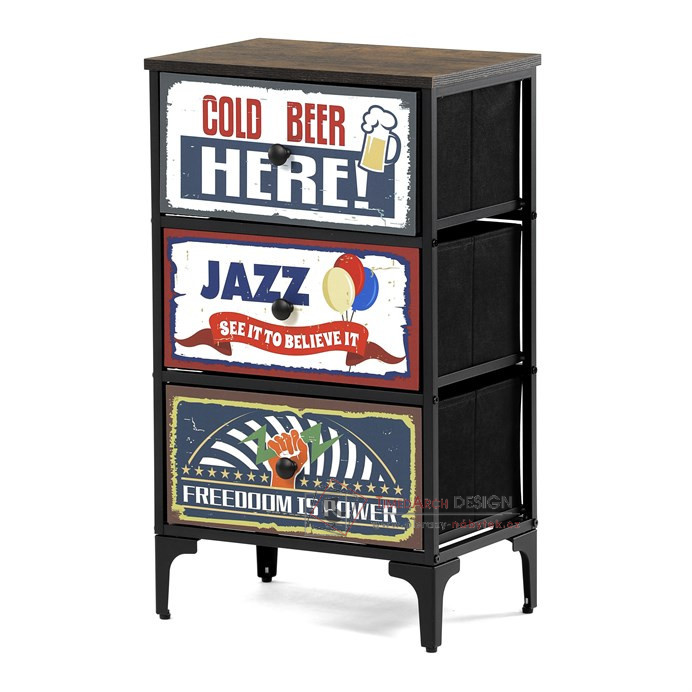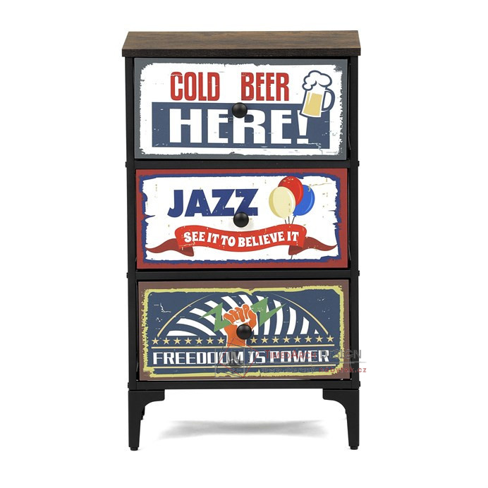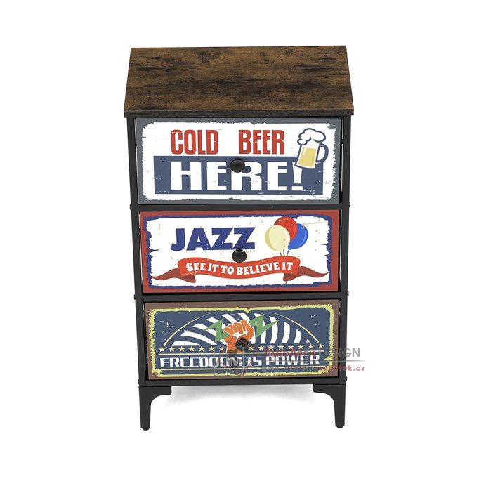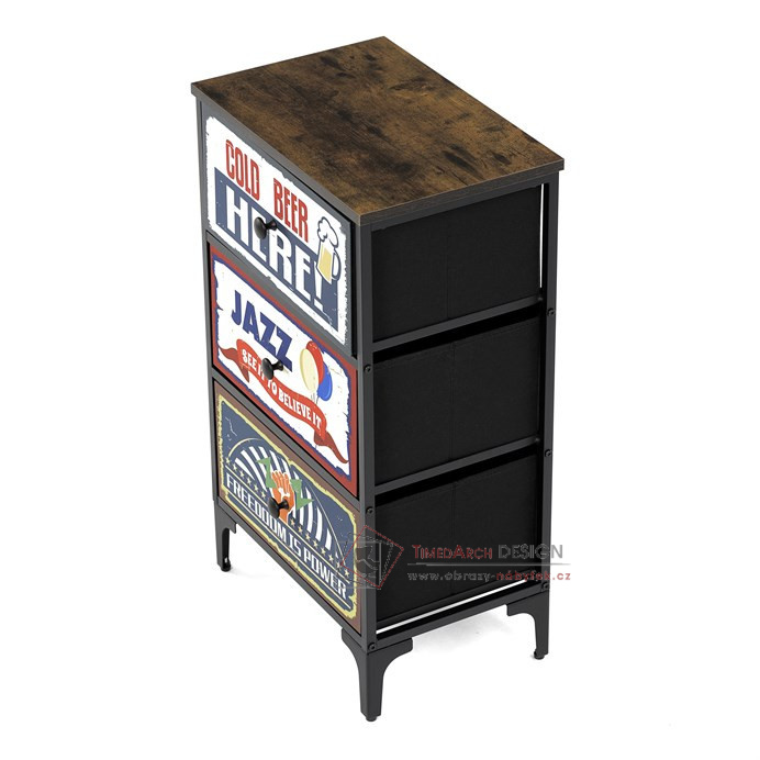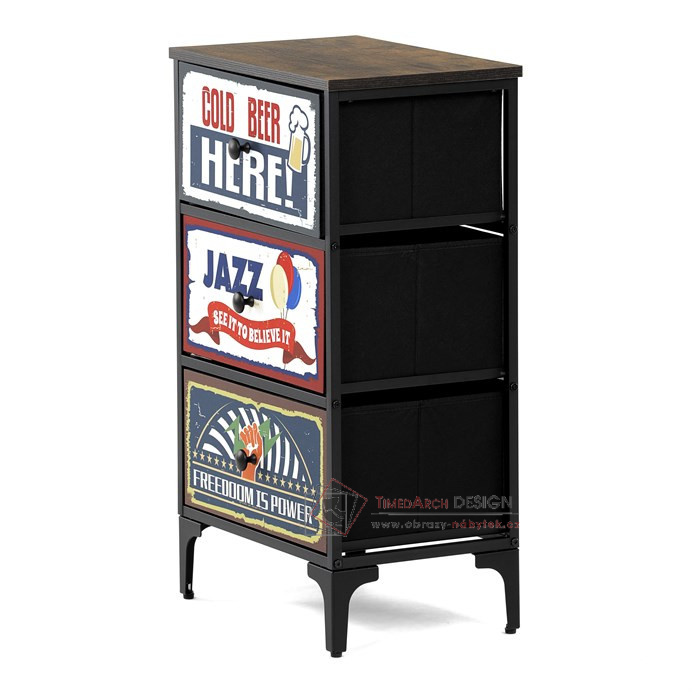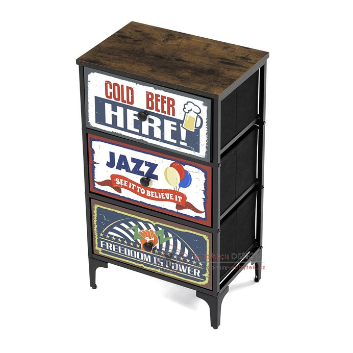 Textilní čela zásuvek s výplní HDF a vintage potiskem navozují atmosféru starých amerických barů a jazzových klubů. Kombinace černé kovové konstrukce, desky v dekoru starého dřeva a zdobných noh dodává nábytku robustní, ale zároveň elegantní vzhled. Korpus zásuvek je vyroben z netkané textilie s výplní HDF, což zajišťuje jejich lehkost a snadnou manipulaci. Ideální doplněk do obývacího pokoje nebo stylové kavárny, kde se stane nepřehlédnutelným prvkem.