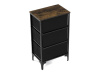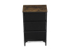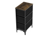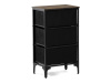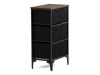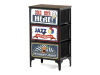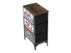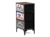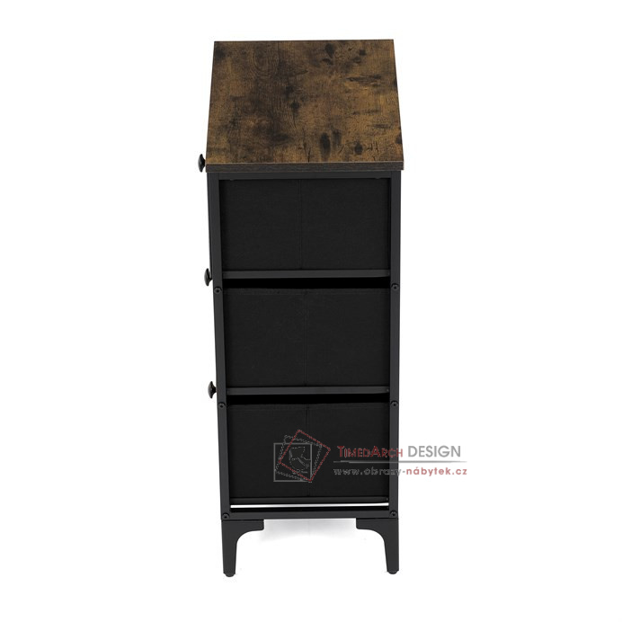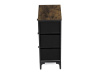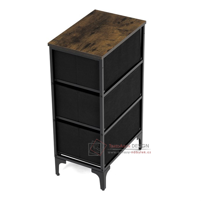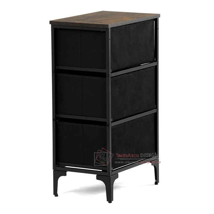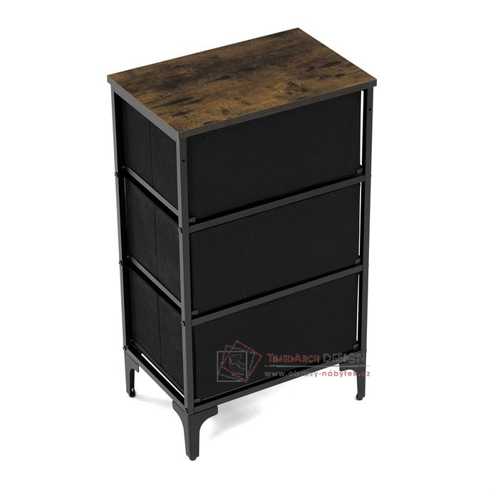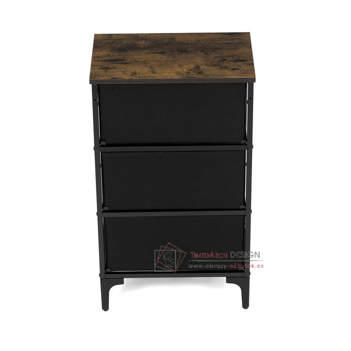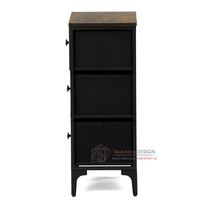 Textilní čela zásuvek s výplní HDF a vintage potiskem navozují atmosféru starých amerických barů a jazzových klubů. Kombinace černé kovové konstrukce, desky v dekoru starého dřeva a zdobných noh dodává nábytku robustní, ale zároveň elegantní vzhled. Korpus zásuvek je vyroben z netkané textilie s výplní HDF, což zajišťuje jejich lehkost a snadnou manipulaci. Ideální doplněk do obývacího pokoje nebo stylové kavárny, kde se stane nepřehlédnutelným prvkem.
