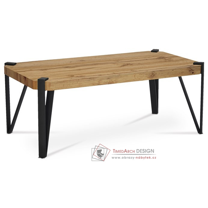 Obdélníkovou desku z MDF v dekoru divoký dub harmonicky doplňují černé kovové nohy do tvaru V, plynule přecházející až na horní starnu desky. Stolek zaujme i svým nadčasovým designem. Obdélníková deska má rozměr 110 x 60 cm, tloušťku 5 cm. Nohy jsou obdélníkového průřezu a zakončené plastovými kluzáky. Nosnost stolku je cca 20 kg.