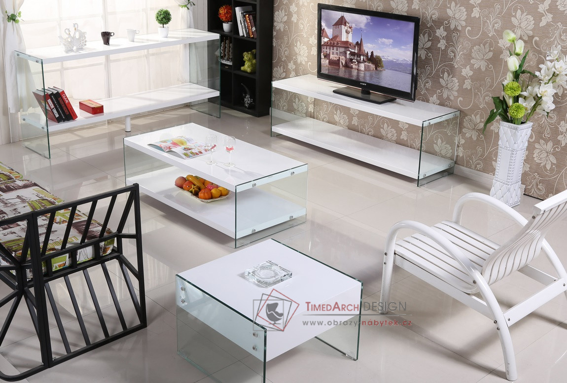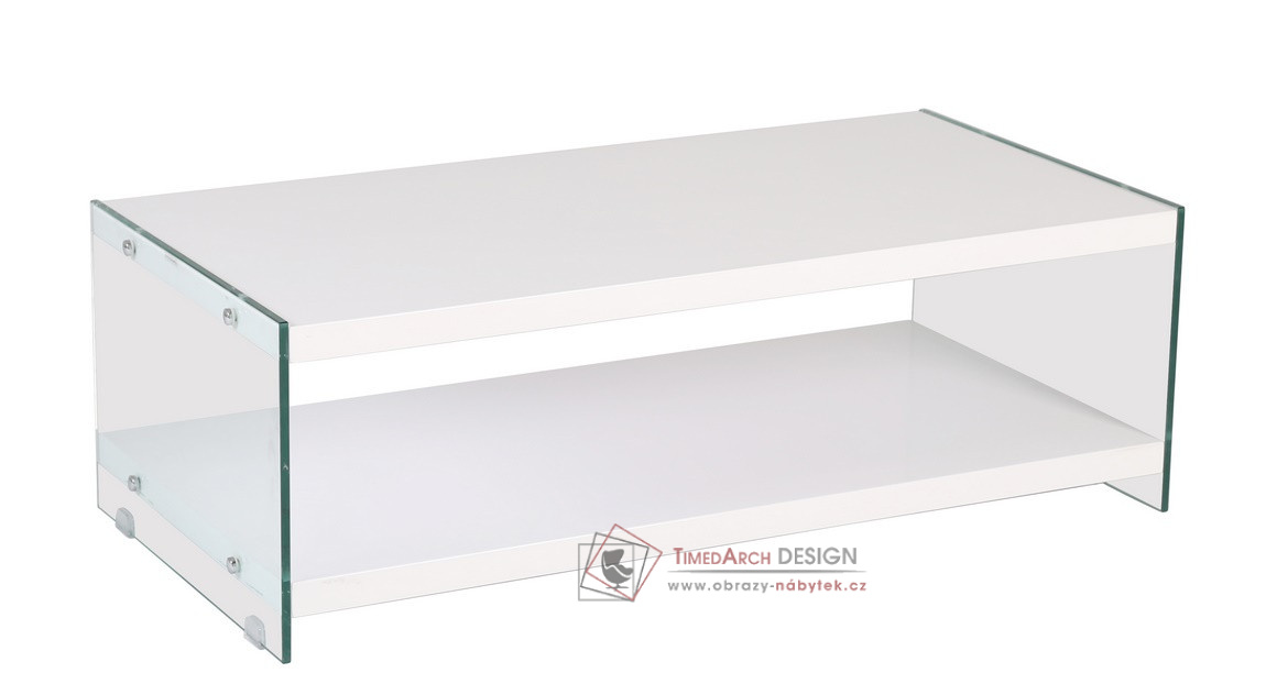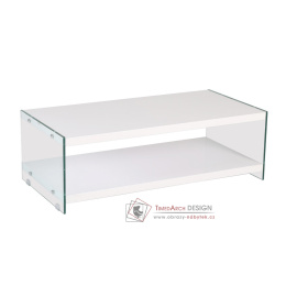 Konferenční stolek 122x60cm BIBIONE-771 je vyrobený z kvalitní MDF lakované lesklou, bílou barvou odolnou proti oděru v kombinaci s tvrzeným, čirým sklem.
