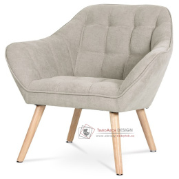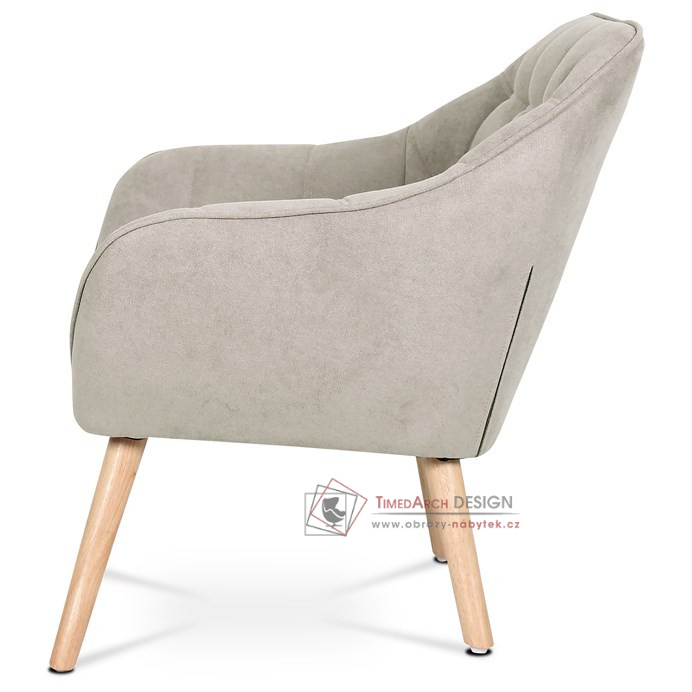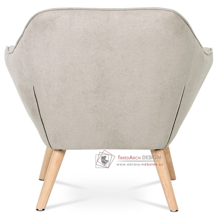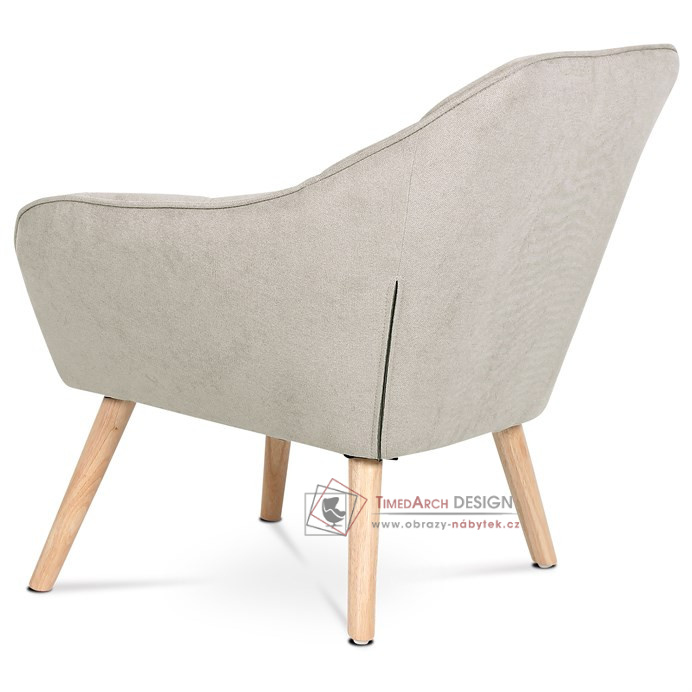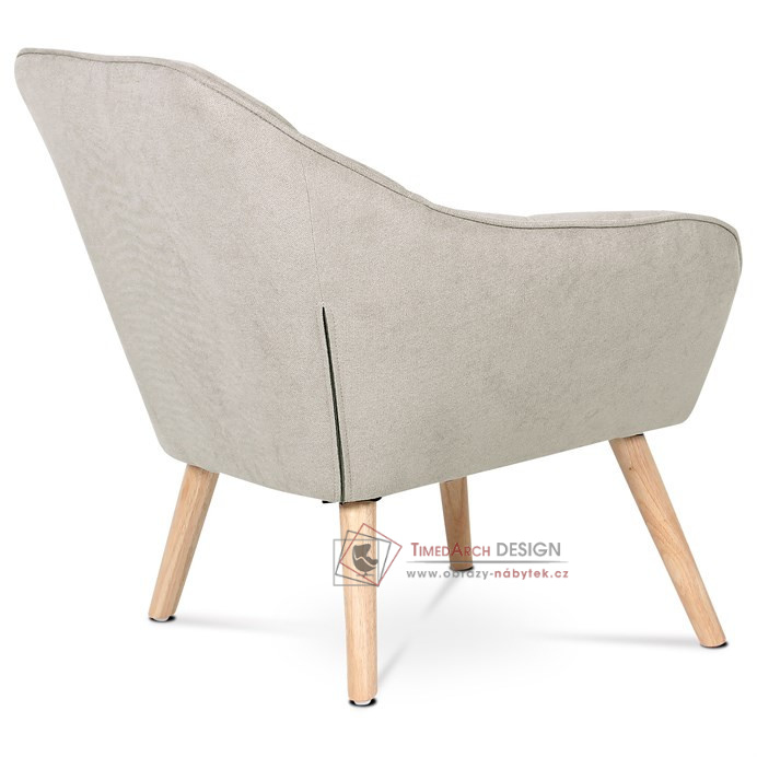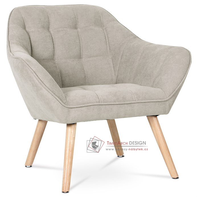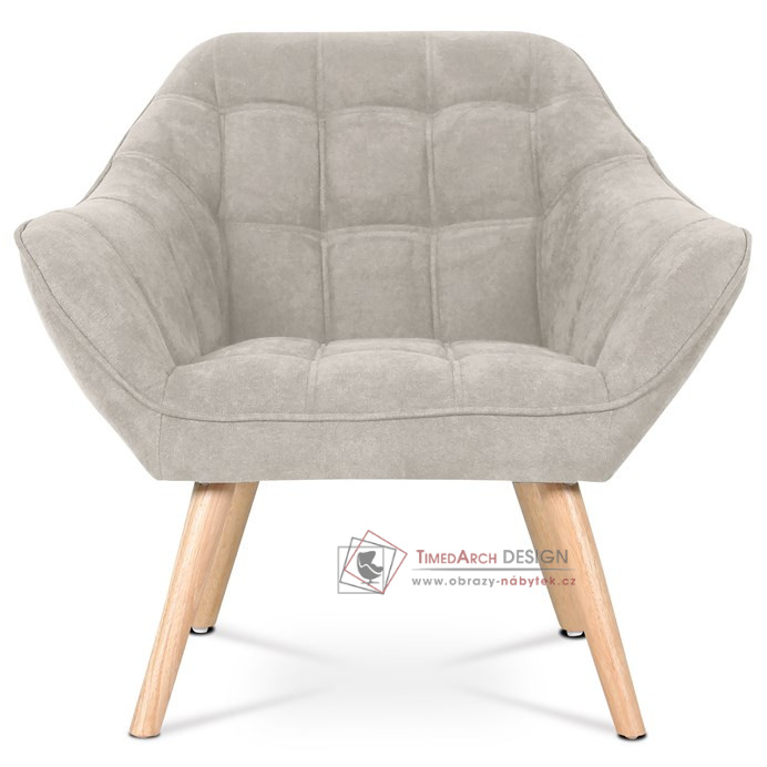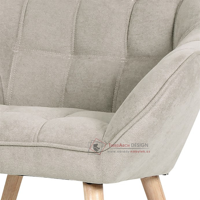 Charakteristickými prvky tohoto křesla je výrazné čtvercové prošití sedáku i opěráku, masivní sedací korpus s ostrými liniemi v kontrastu s vysokými štíhlými nohami. Křeslo je celočalouněné, včetně zad. Lze ho použít jak k přisazení ke stěně, tak i ve středu místnosti. Může sloužit jako výrazný solitér i jako doplňující křesla k sedačce. Své uplatnění najde v chodbě, hale, obývacím pokoji i ložnici. Potah je z látky v trendy šedobéžovém odstínu, kostra z masivního dřeva, vyplněné je kvalitní PU pěnou. Sedáky jsou ještě zpevněny elastickými popruhy pro zvýšení komfortu pohodlí. Štíhlé kónické nohy jsou z masivního kaučukovníku v přírodním odstínu a lakované transparentním lakem. Poškození podlahových krytin je eliminováno plastovými kluzáky, u zadních nohou jsou rektifikovatelné (výškově nastavitelné). Světlá výška křesla je 30 cm , výška područek je 59 cm a šíře 10 cm. Nosnost je 130 kg. Pohodlí a vnitřní prostornost tohoto křesla ocení jistě každý. A pokud si ještě opřete ruce o zvýšené područky, budete dlouho otálet, než křeslo opustíte. Křeslo se typově hodí k dvojsedačce AK-322.