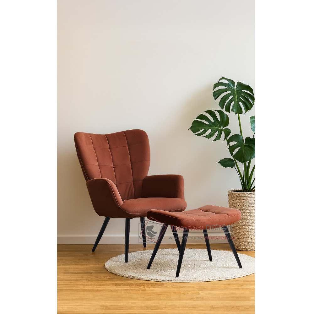 Čalouněno je kvalitní sametovou látkou Velvet v hnědém barevném provedení. Dodáváno je s praktickou podnoží, která se postará o odpočinek pro vaše unavené nohy. Stabilitu křesla a podnože zajišťuje černý kov, který svojí kombinací s látkou Velvet dotváří celkový design. Opěradlová část křesla a vrch podnože jsou dekorativně prošívané. Křeslo, které bude skvělým a oblíbeným společníkem dlouhá léta.