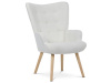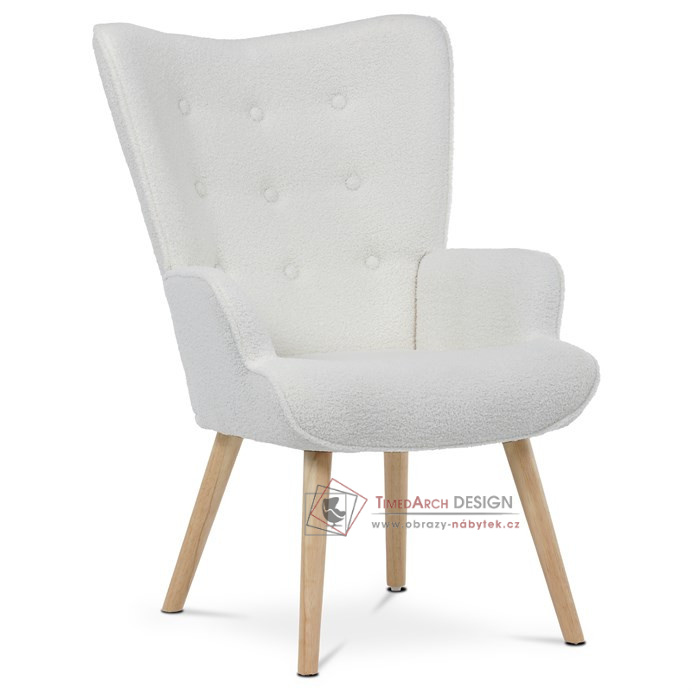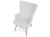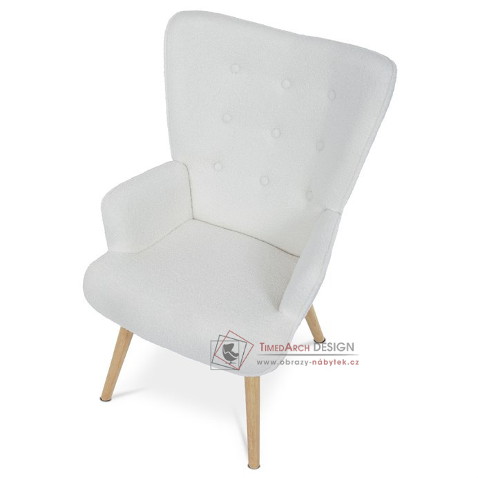 Zkrášlete svůj obývací pokoj nebo pracovnu tímto křeslem, které v sobě kombinuje bílou barvu a přírodní masivní nohy. Potah křesla je vyroben z látky bouclé s jemným povrchem. Pěnová výplň křesla Vám poskytne opravdový komfort. Kromě toho, že je toto křeslo stylové a moderní, nabízí také optimální rozměry. S kompaktní šířkou 68 cm, hloubkou 76 cm a výškou 101 cm je ideálním řešením pro menší místnosti, případně pokoje pro hosty. Nehledě na svoji lehkost je toto křeslo velmi odolné a použitelné i k relativně větší zátěži díky své nosnosti až 130 kg. Díky elegantním vyšším nohám dodává křeslo Vašemu interiéru růst.